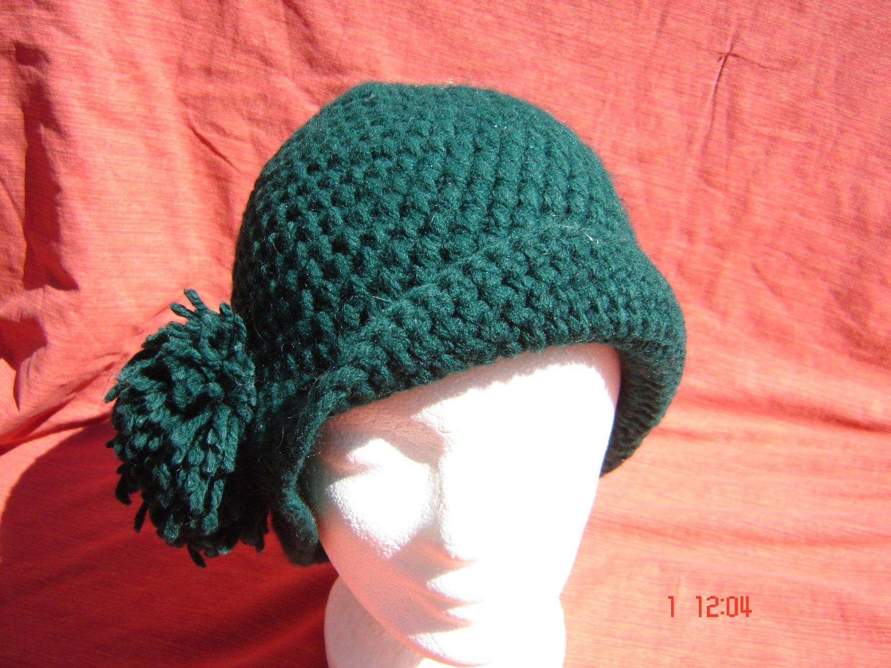 Vintage Strickhut Hut mit dickem Bommel Wintermütze dunkelgrün handgehäkelt p ZB1