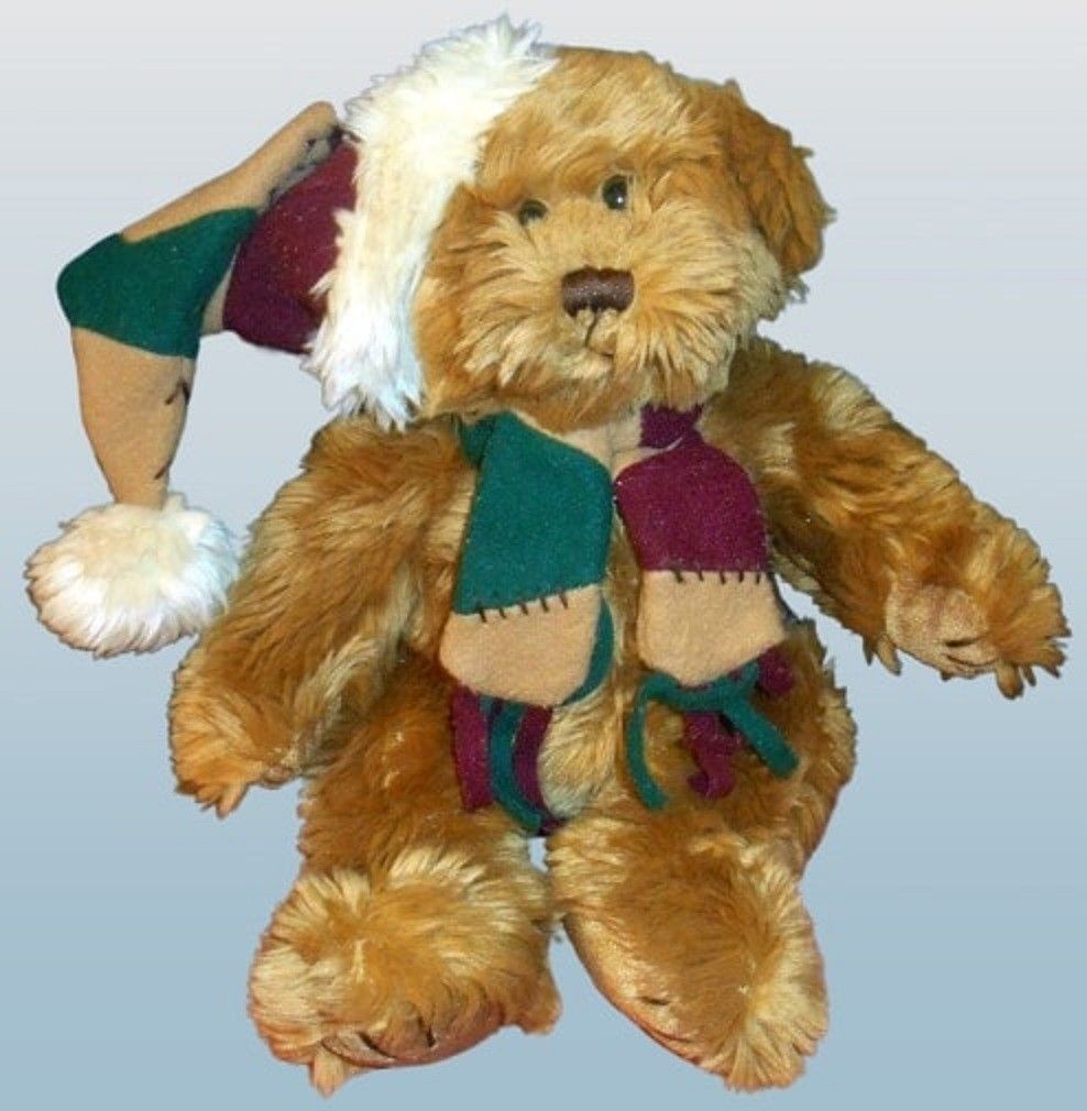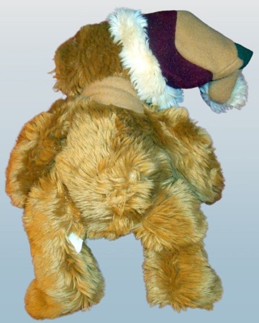 Er hat hellbraunes Fell und trägt einen grün und weinrot gestreiften Schal mit Fransen. Außerdem hat es eine Mütze in den gleichen Farben mit einem weißen flauschigen Rand und einem Pompon am Ende, der zur Seite hängt.Ideal als Dekoration oder als Geschenk für Sammler und Liebhaber von Vintage-Spielzeug.