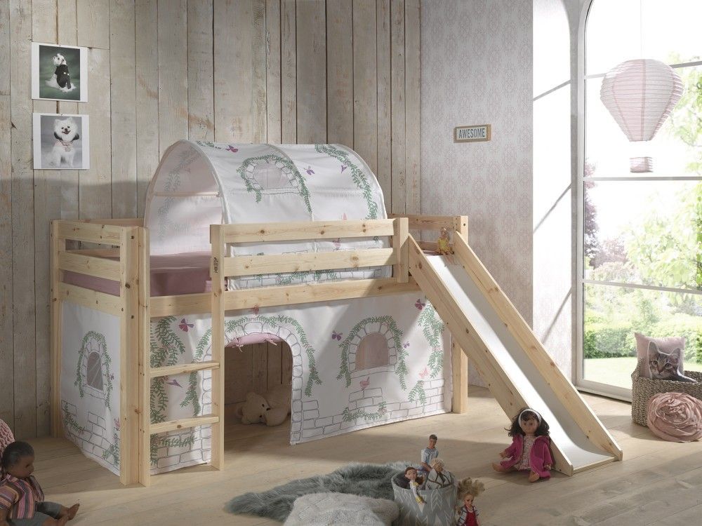 VIPACK Vipack PINO Spielbett mit Rutsche 90x200 und Vorhang/Tunnel Birdy - Massiv Natur