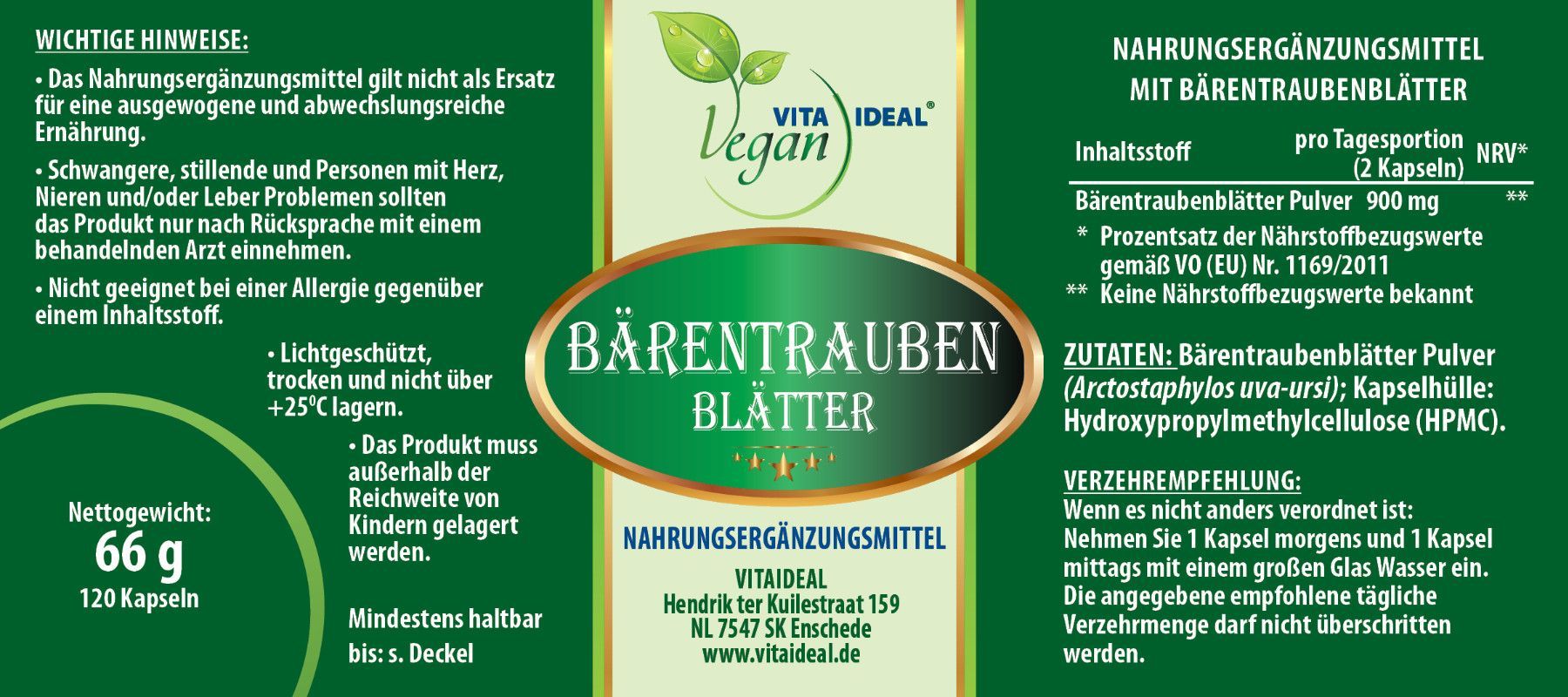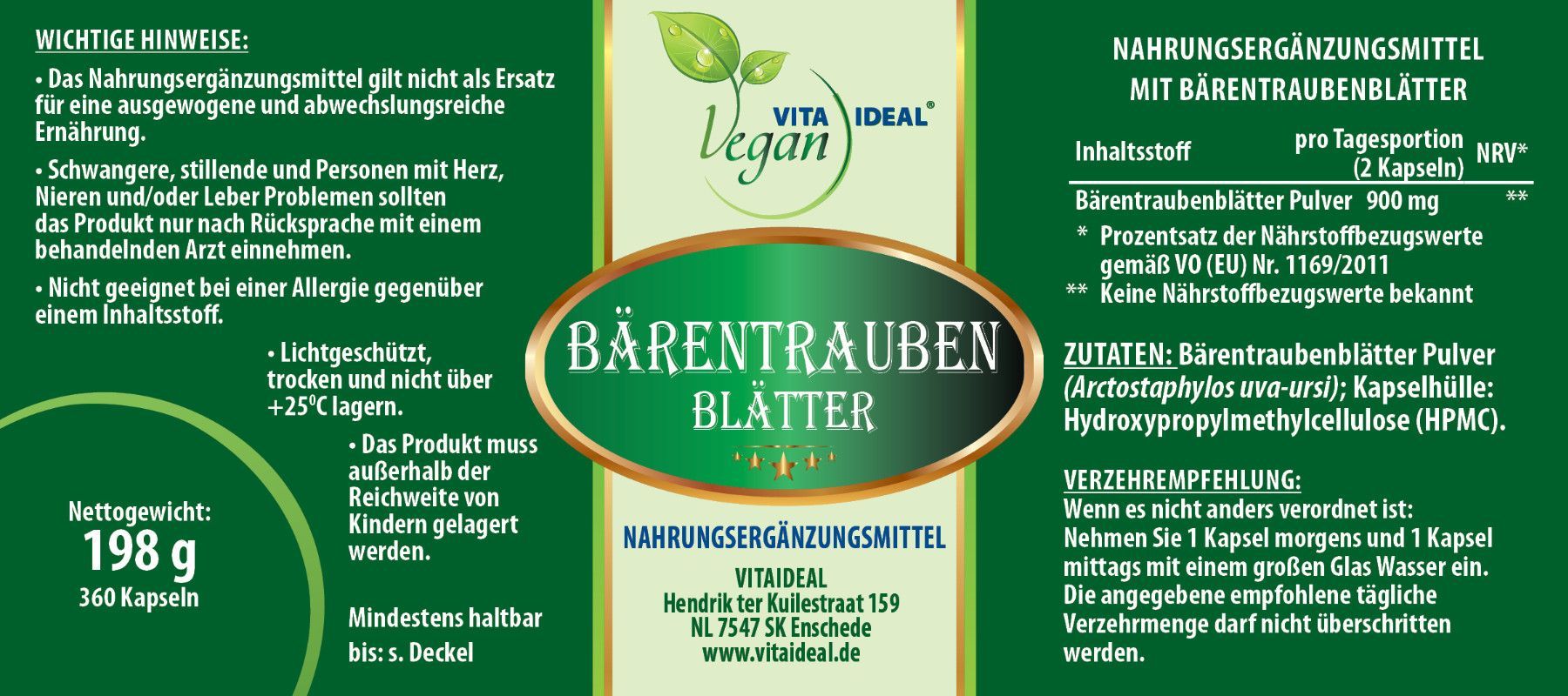VITA IDEAL Vegan® Bärentrauben - Blätter Kapseln - Arctostaphylos uva-ursi - Pulver