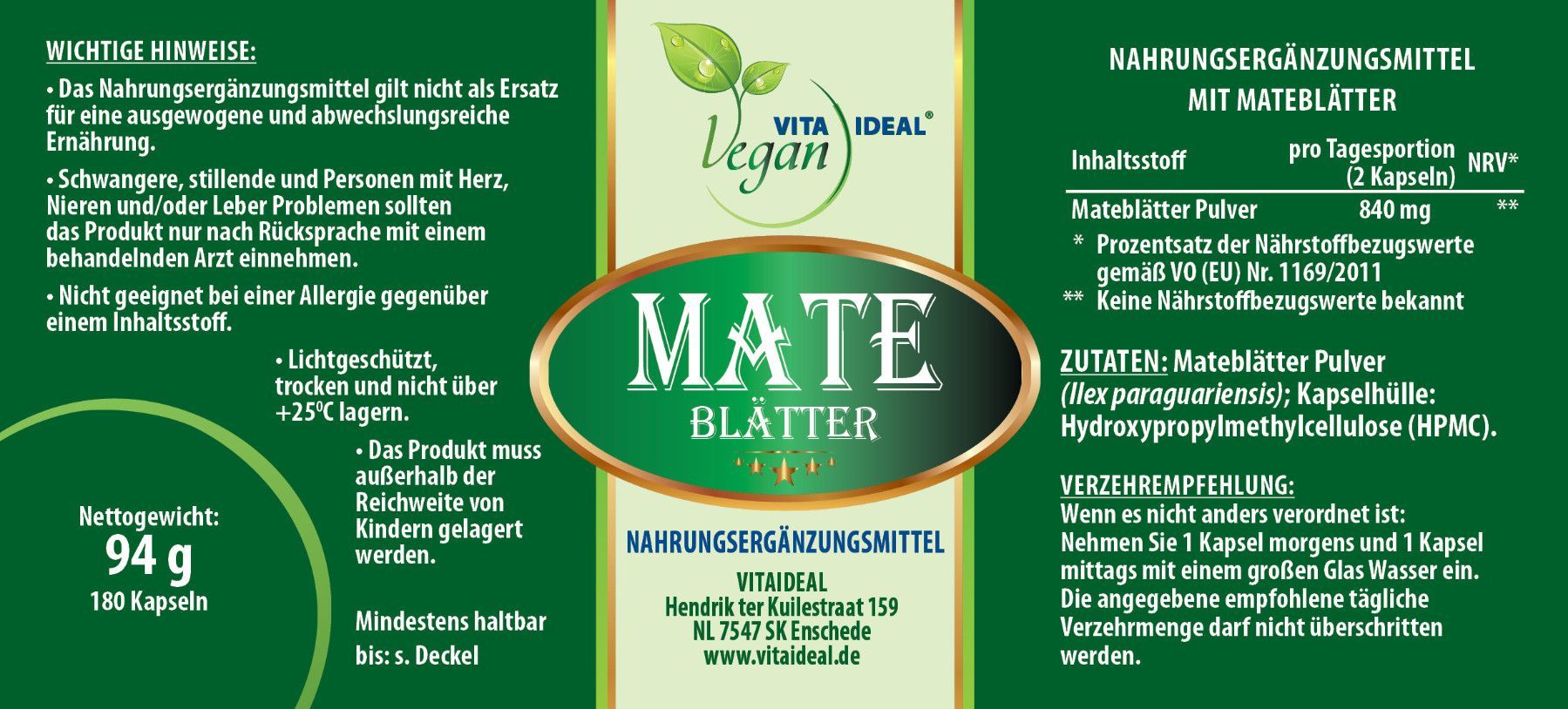 VITA IDEAL Vegan® Mate Blätter Kapseln - Ilex paraguariensis - Mateblätter -
