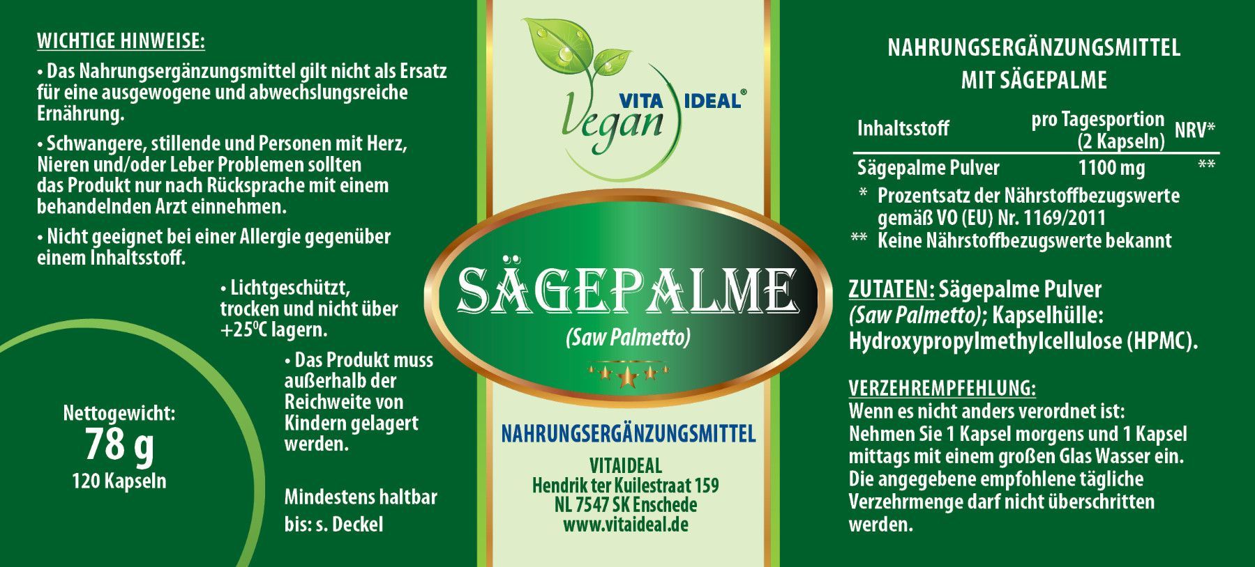 VITA IDEAL Vegan® Sägepalme Kapseln - Arecaceae - Saw Palmetto - SÄGE - PALME