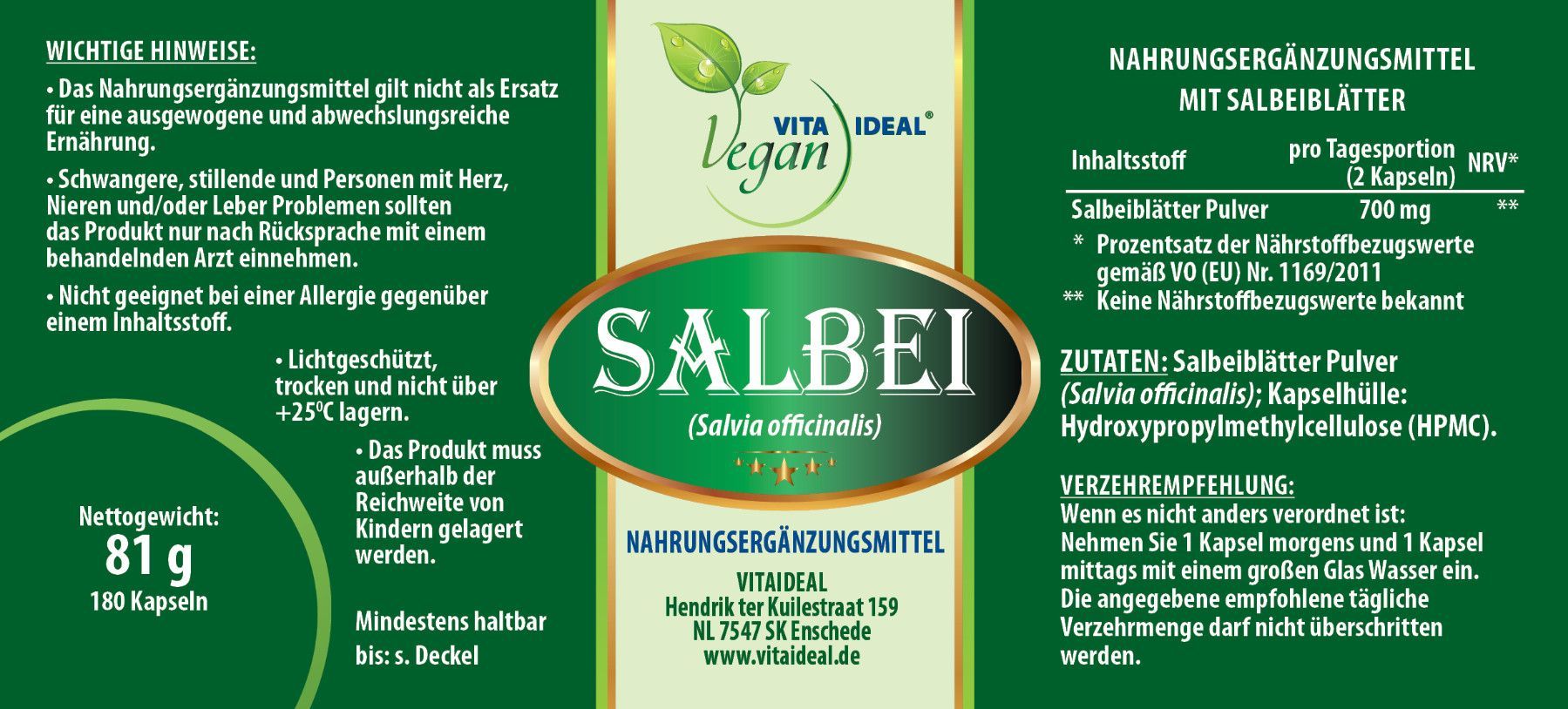 VITA IDEAL Vegan® Salbei Blätter Kapseln - Salvia officinalis - Salbeiblätter