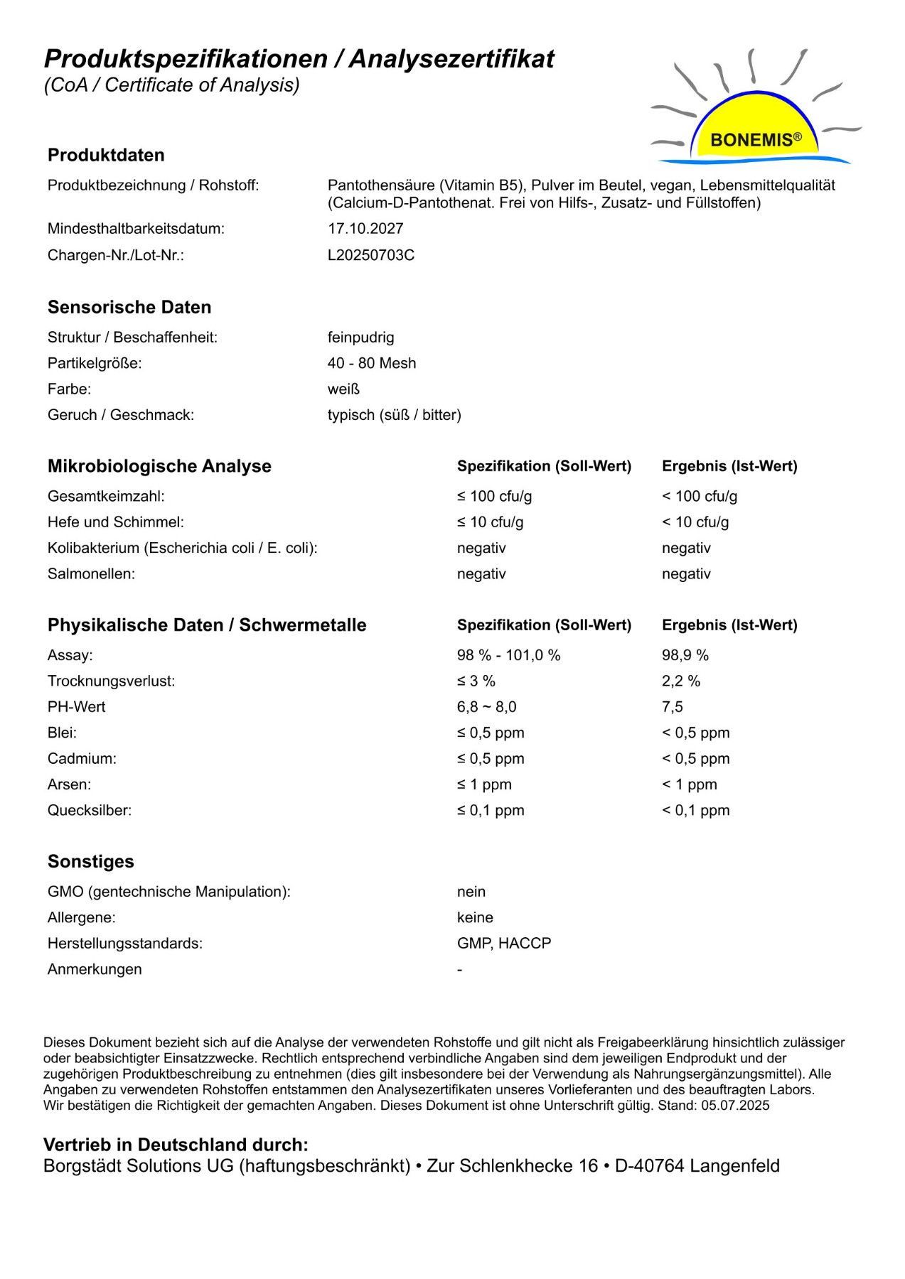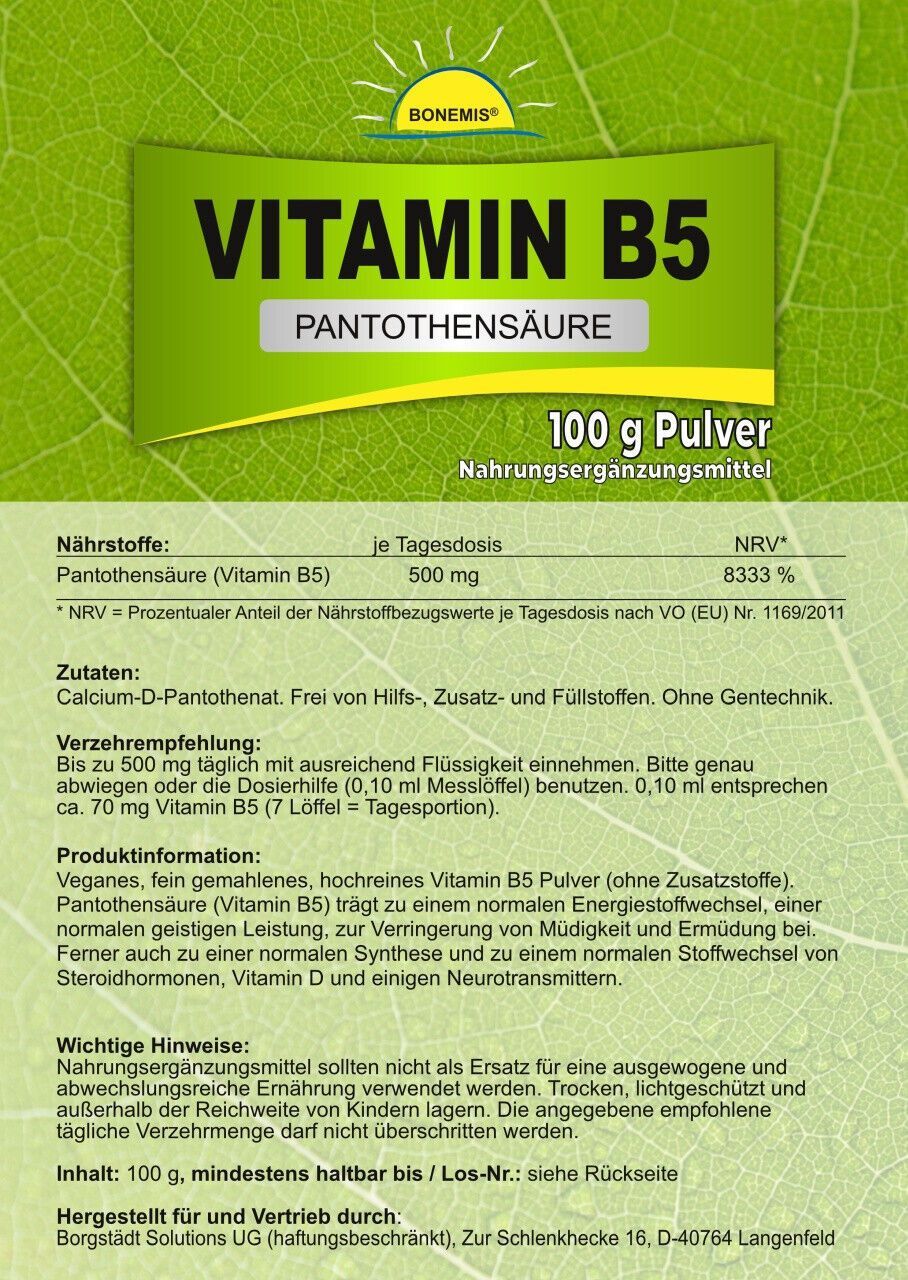 Vitamin B5 (Pantothensäure), Pulver, ohne Zusätze, 100 g im Beutel, Bonemis®