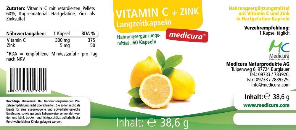 Medicura Vitamin C 300 + Zink Langzeit - 60 Kapseln