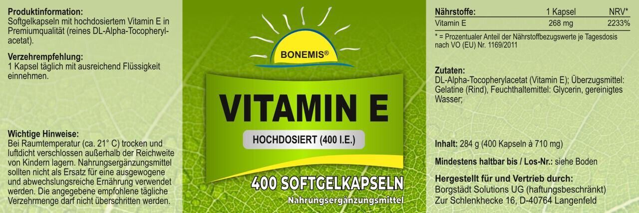 Vitamin E (hochdosiert, 400 I.E.), Sparpack, 400 Softgelkapseln, Bonemis®