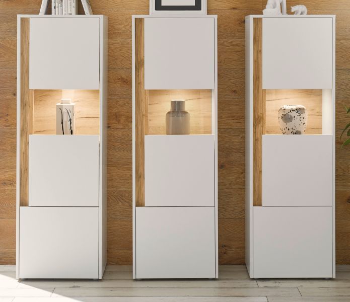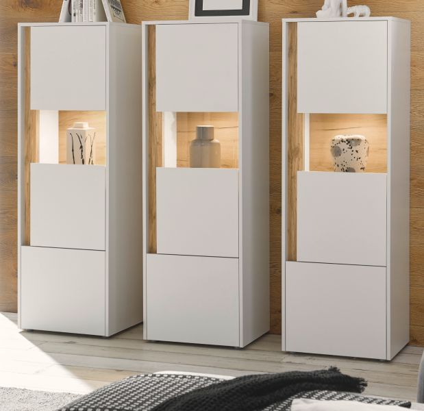 Vitrine Set 3x Vitrinenschrank weiß Eiche je 50 x 155 cm Wohn Esszimmer Center