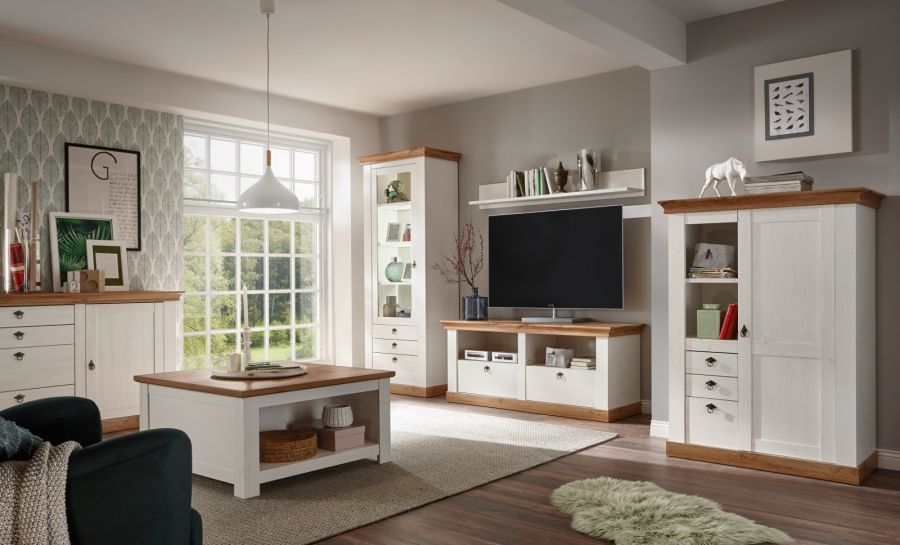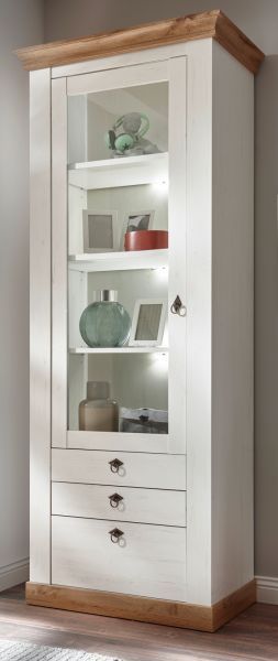 Vitrine Vitrinenschrank Eiche weiß Landhaus Stauraum Beleuchtung 82 x 204 Hemsby