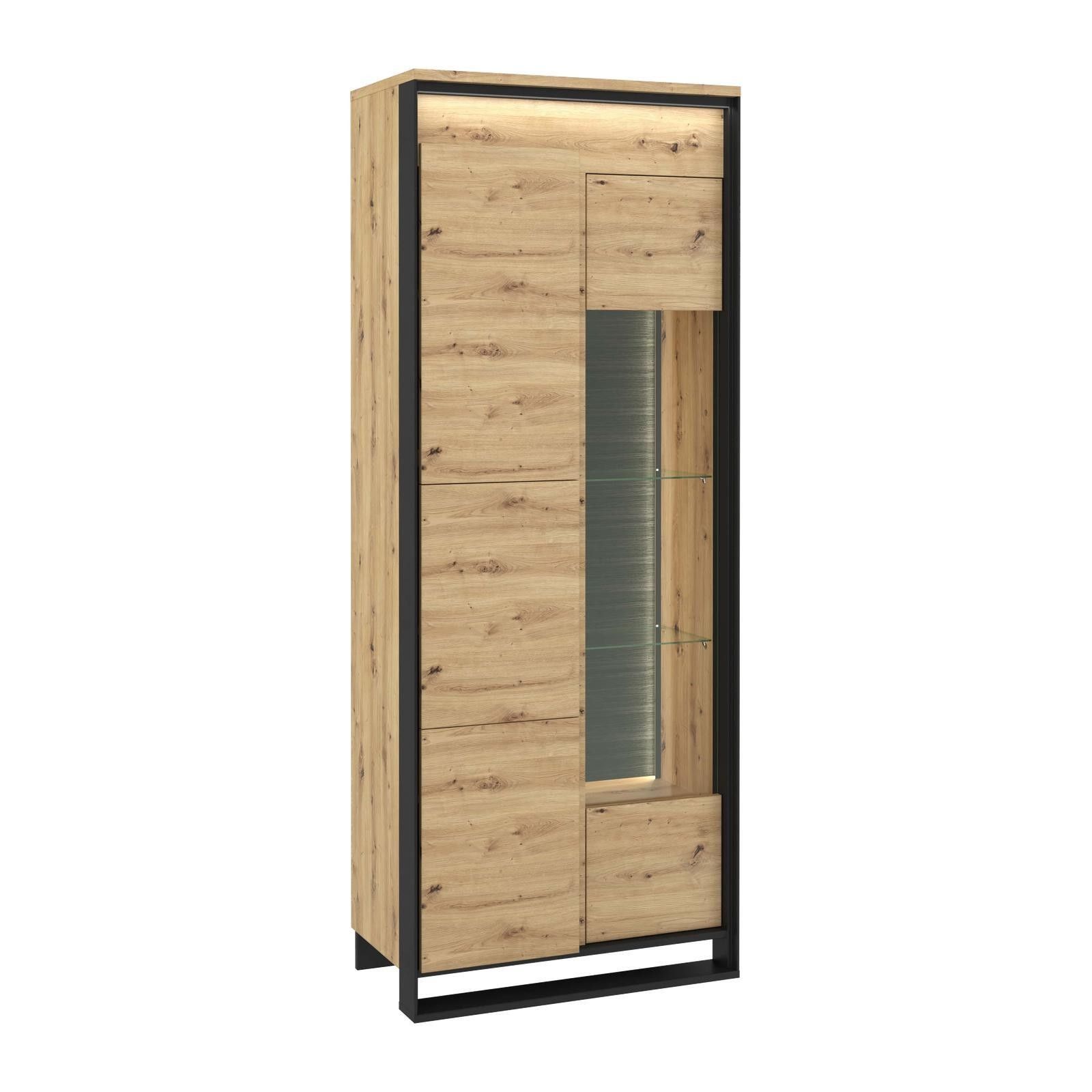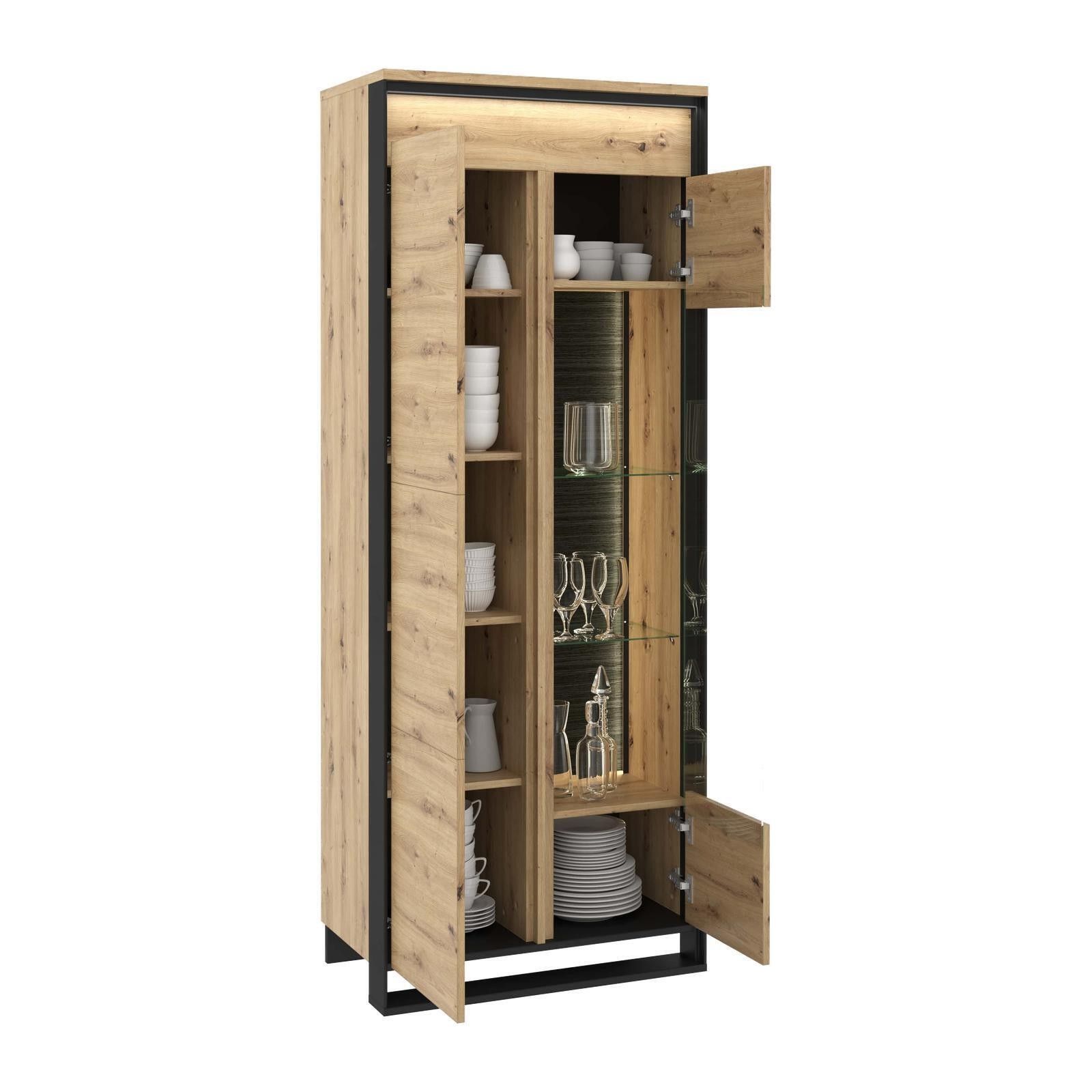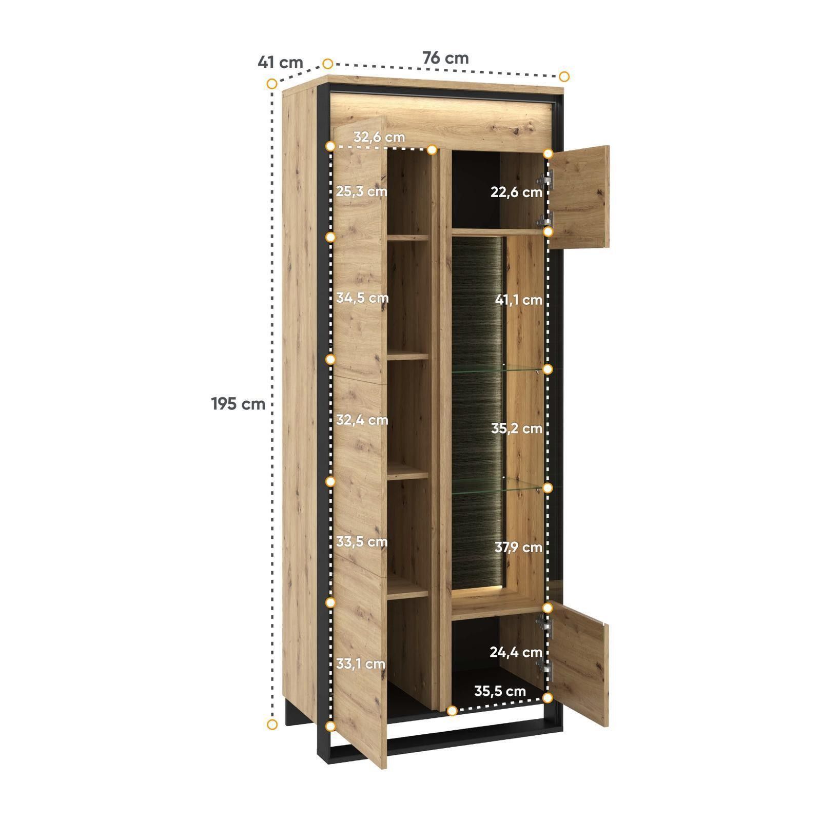 Vitrinenschrank QUANT QA-03 Vitrine Standvitrine Regalschrank Die QUANT Möbelkollektion ist eine moderne, elegante Serie, die einen interessanten Loft-Stil mit hoher Funktionalität vereint. Mit zeitlosen Farben - Holz und klassischem Schwarz behalten die Möbel ihren einzigartigen Charakter, unabhäng