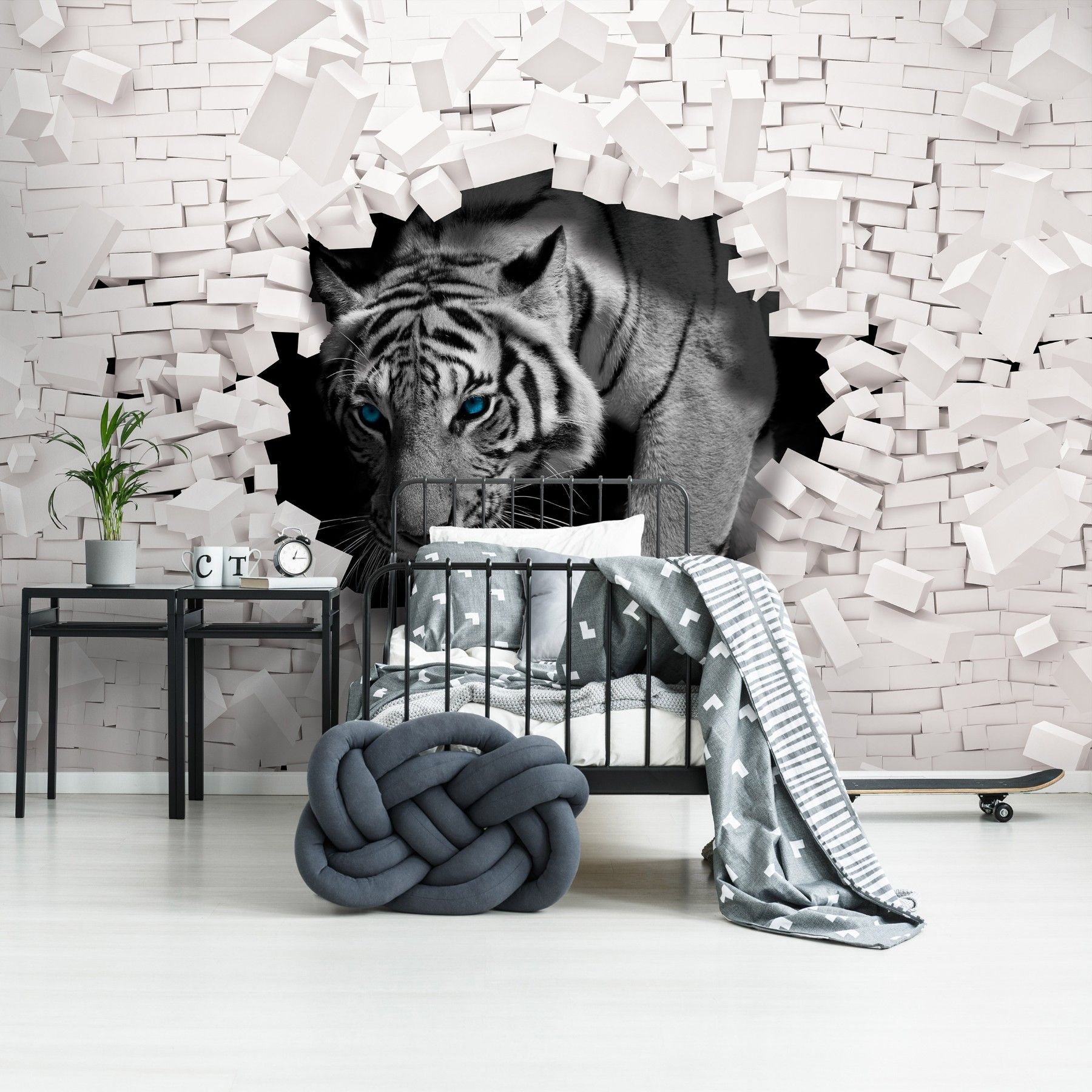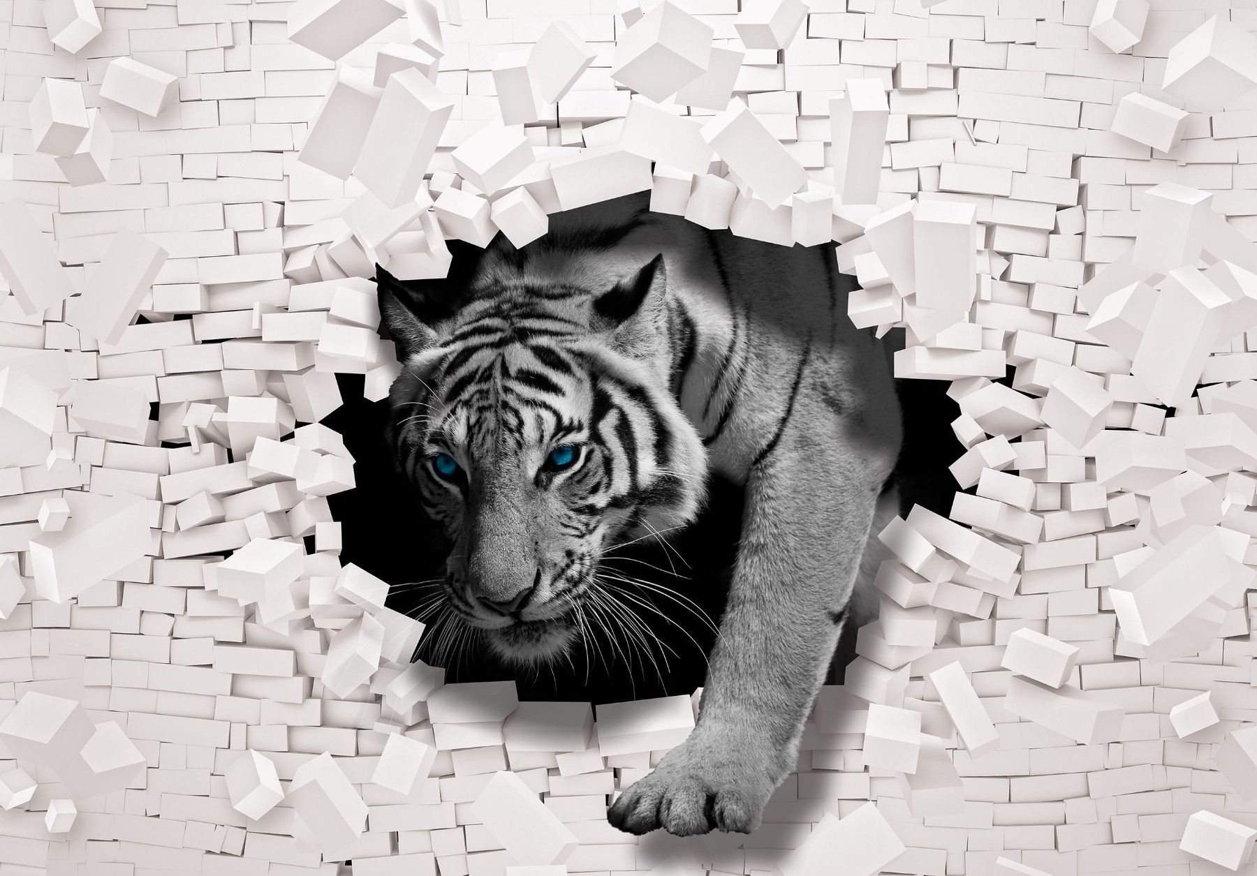 Vlies Fototapete 3D EFFEKT Tiger Tiere Ziegel Loch TAPETE XXL Wohnzimmer Schlafzimmer