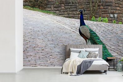 • Fototapete - 450x300 cm - Pfau - Federn - Steine (Gr. 450x300 cm)