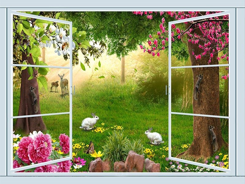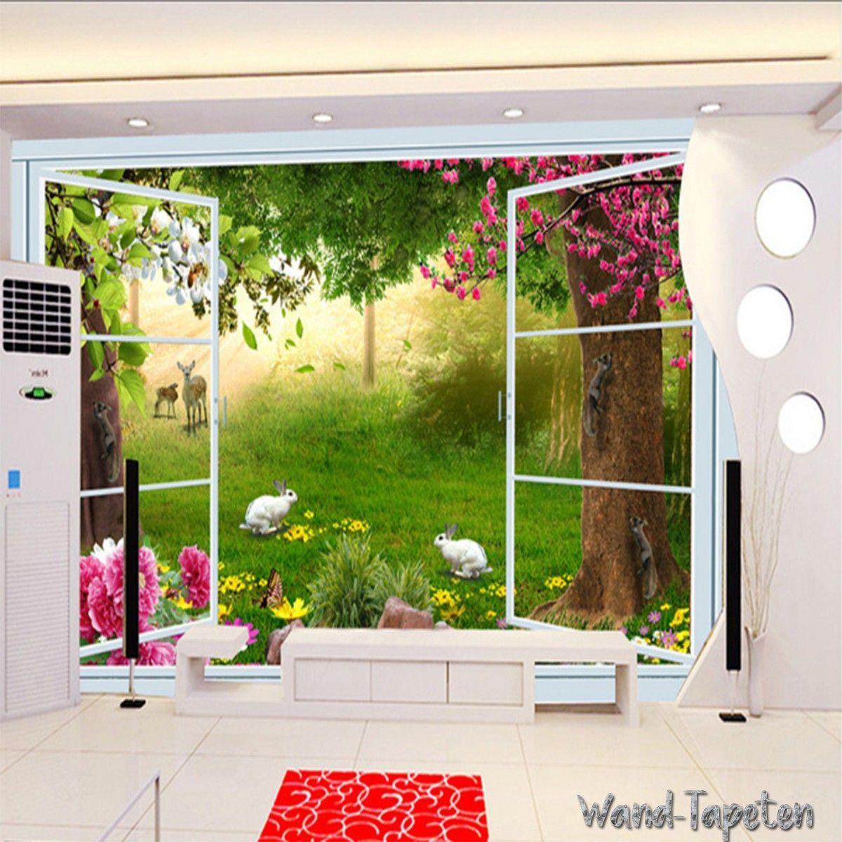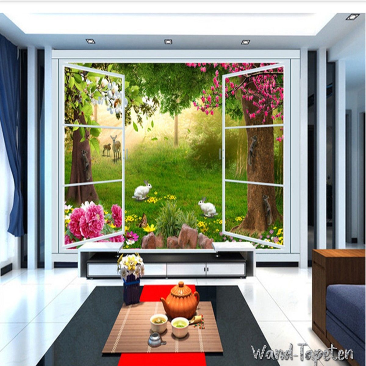 Vlies Fototapete Wandtapete Wandbilder 3D Fenster Wald Natur Tiere 2222
