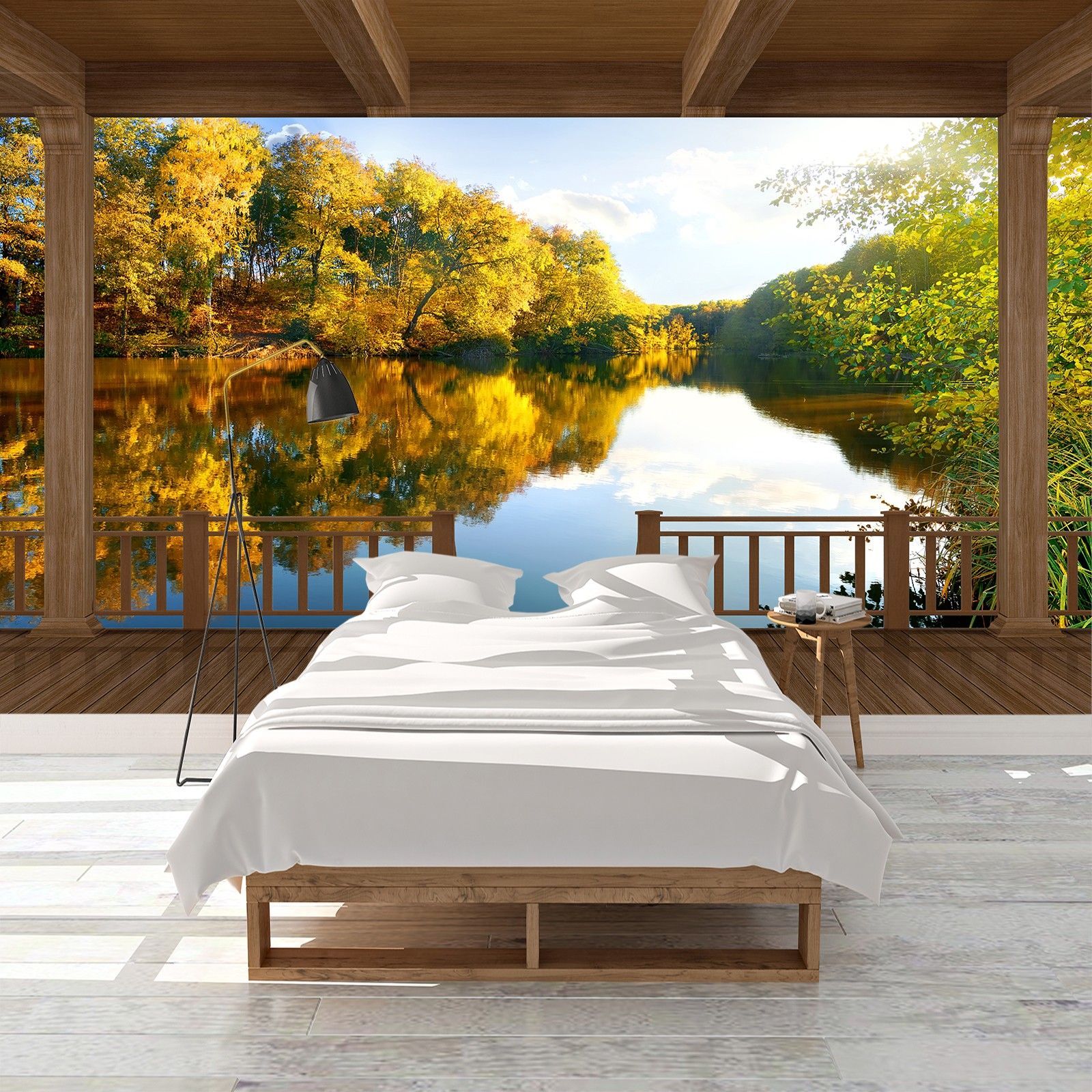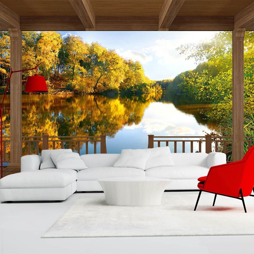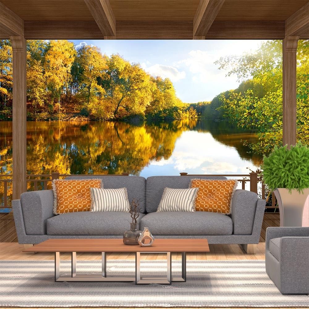 Vlies Fototapete Wandtapete Wandbilder 3D Holzbalkon Wald See 1341