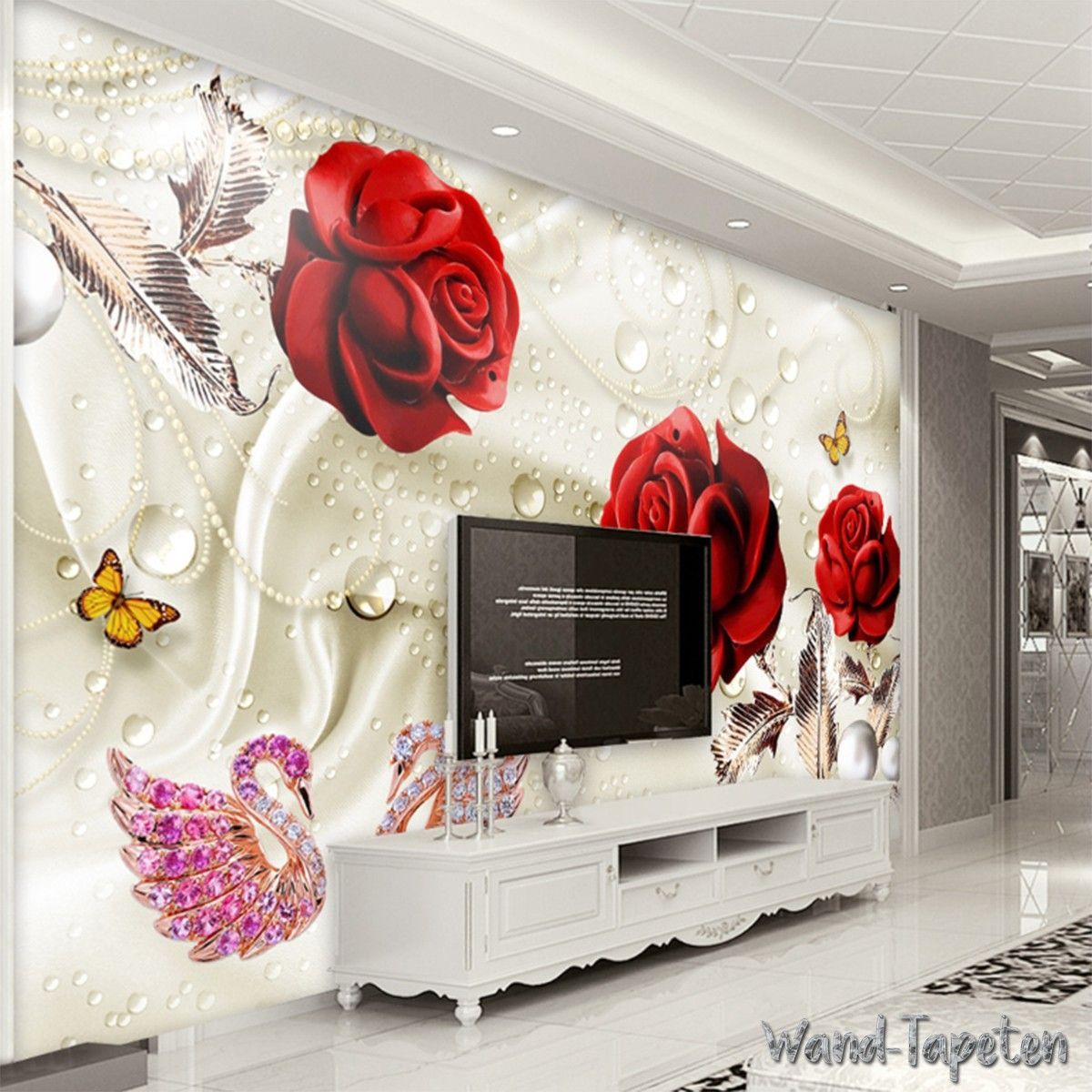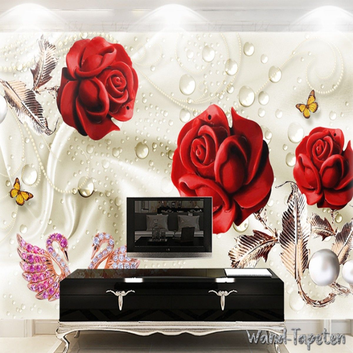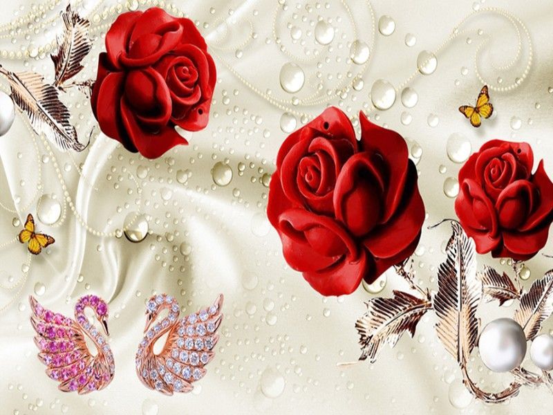 Vlies Fototapete Wandtapete Wandbilder Seide mit Roten Rosen und Schwänen 4109