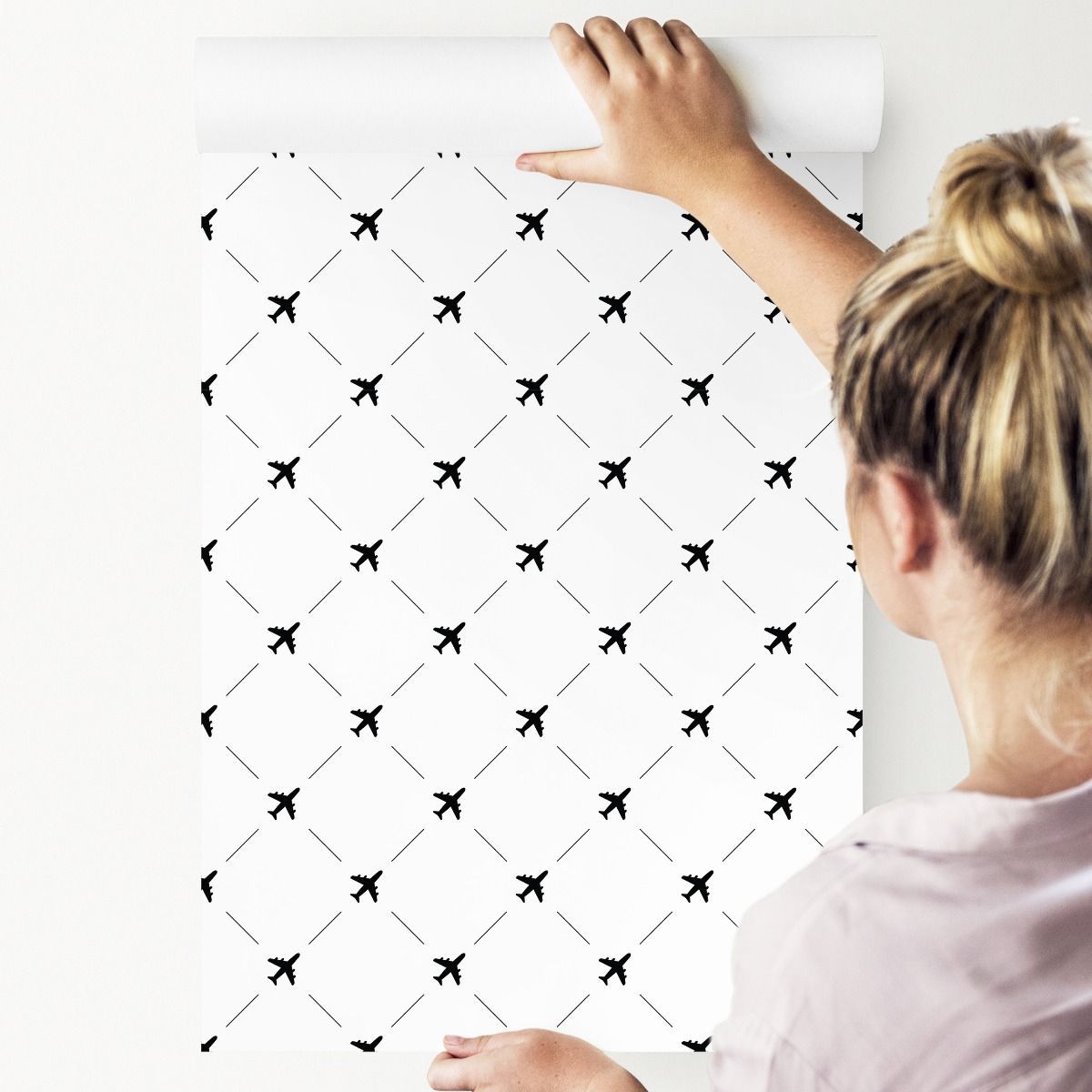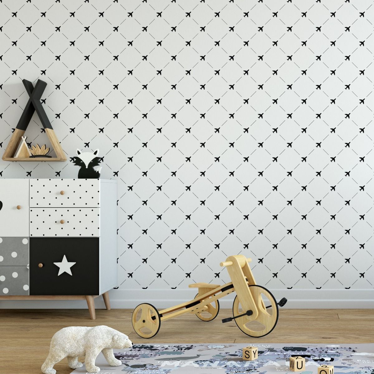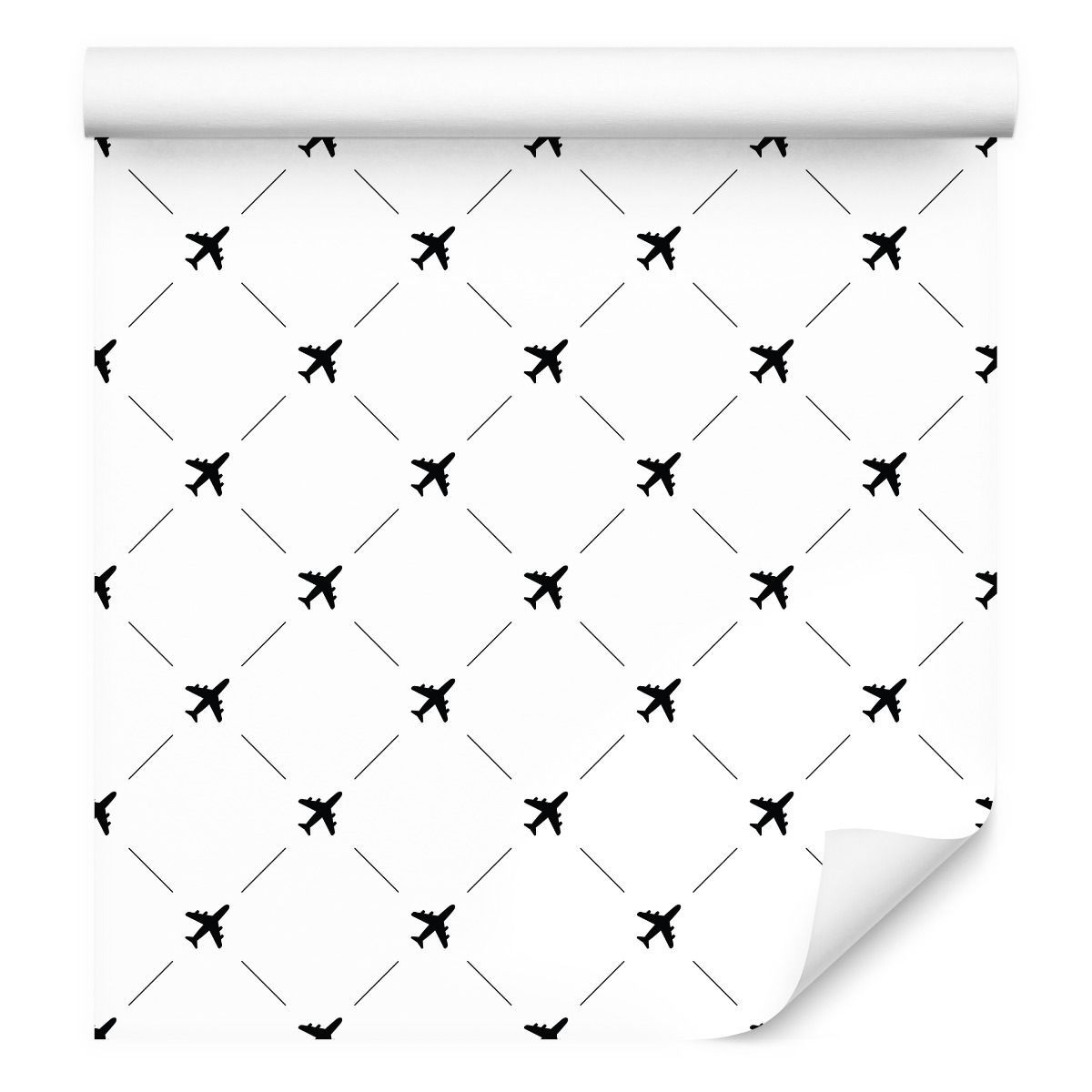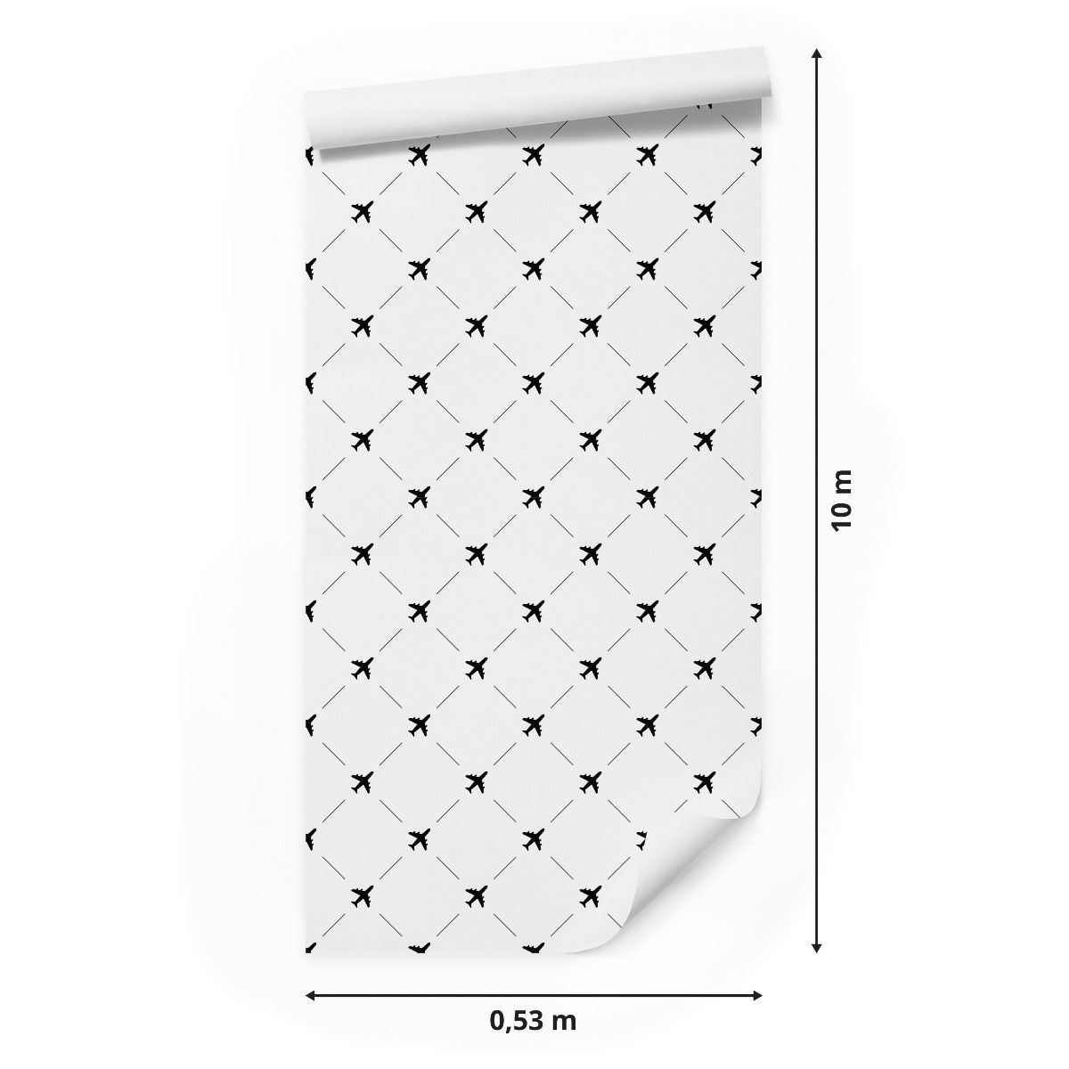 10m VLIES TAPETE Rolle Kinder schwarz-weiß kariert Flugzeuge 5850