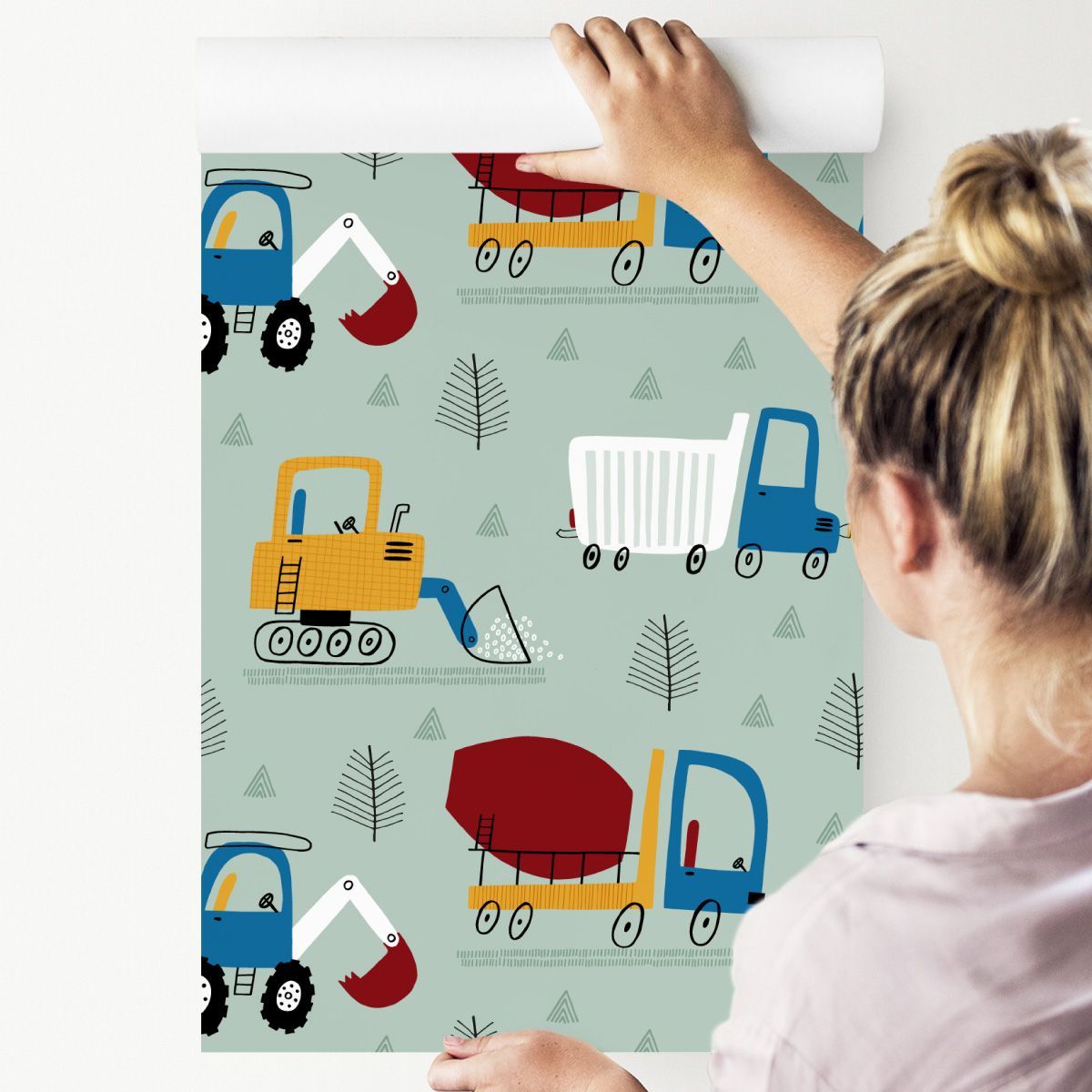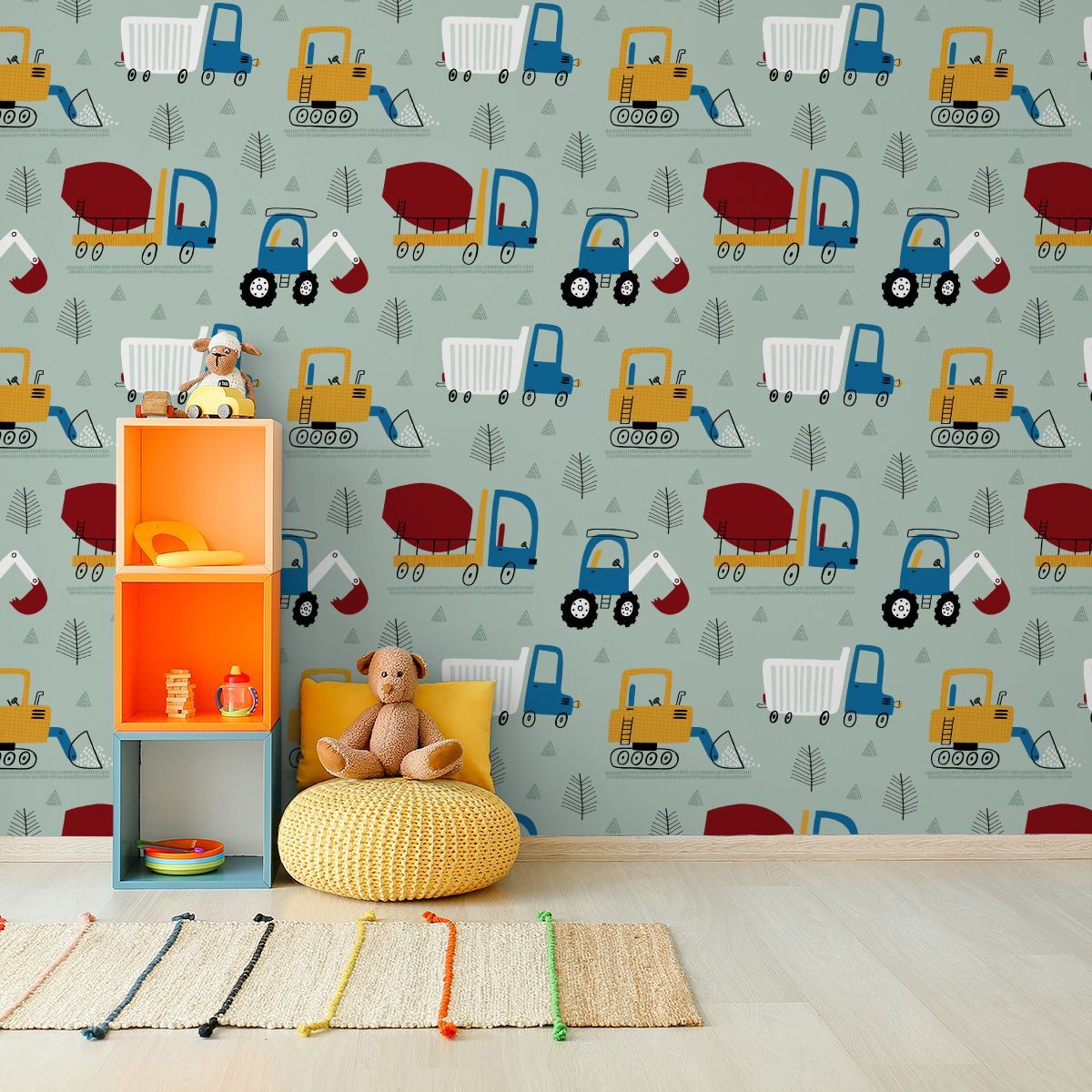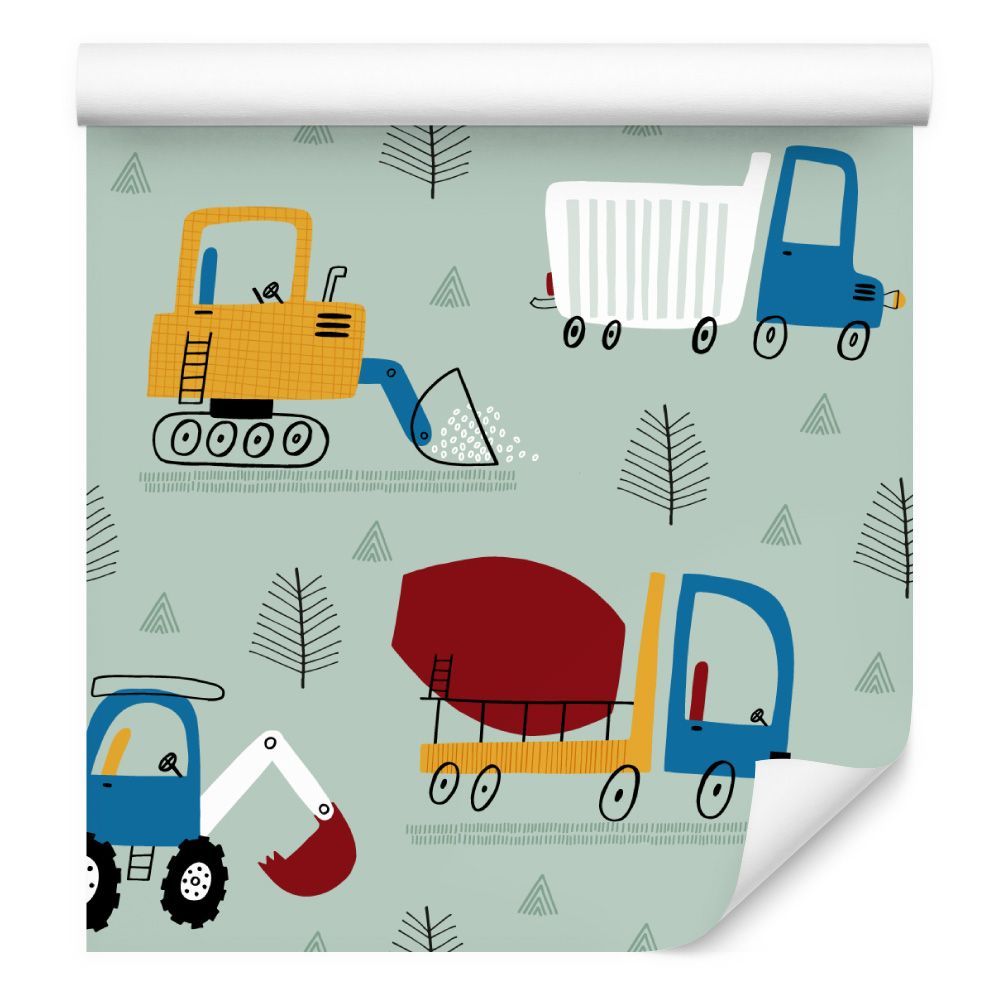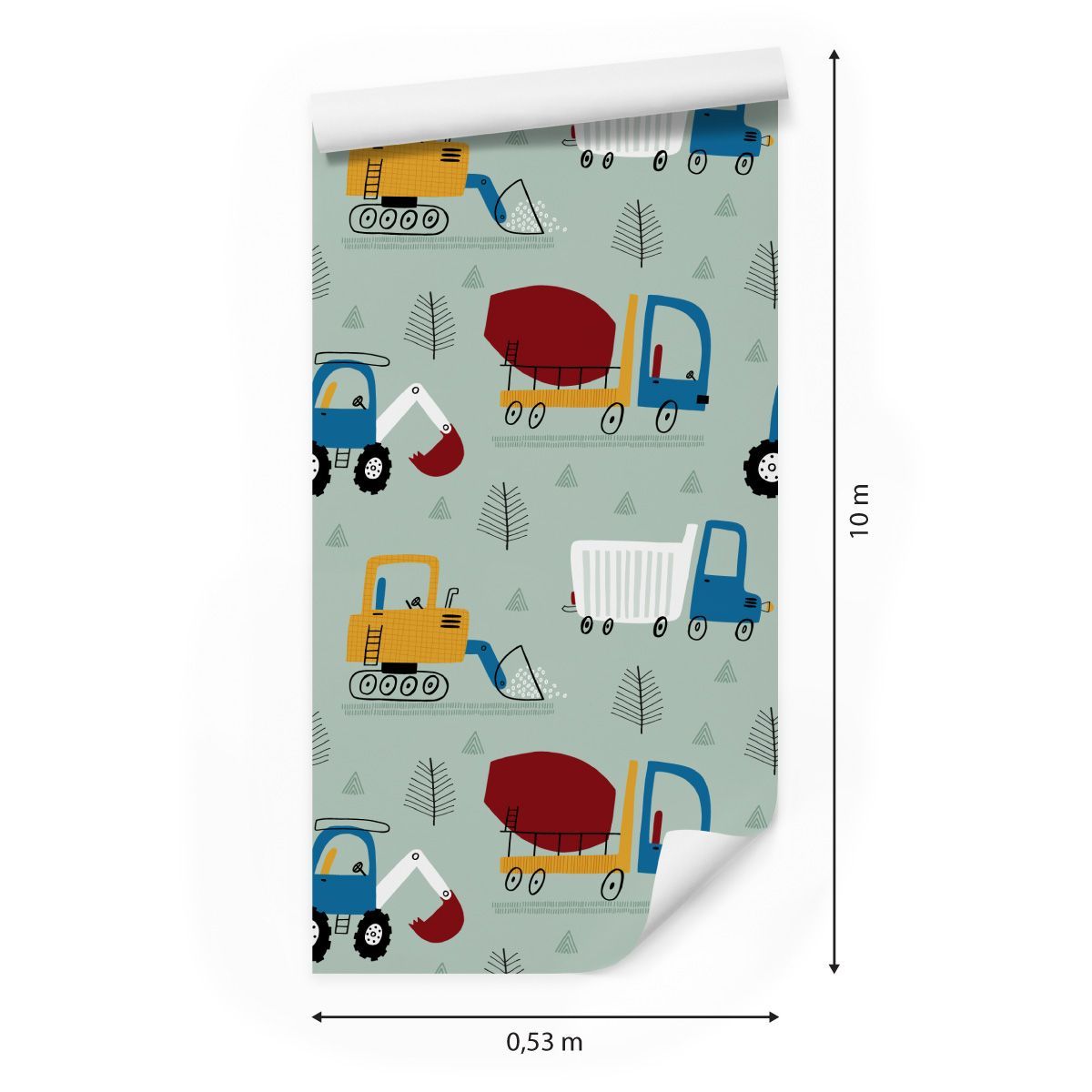 10m VLIES TAPETE Rolle Kinderzimmer Lastkraftwagen Bagger Bäume Wald XXL 2555