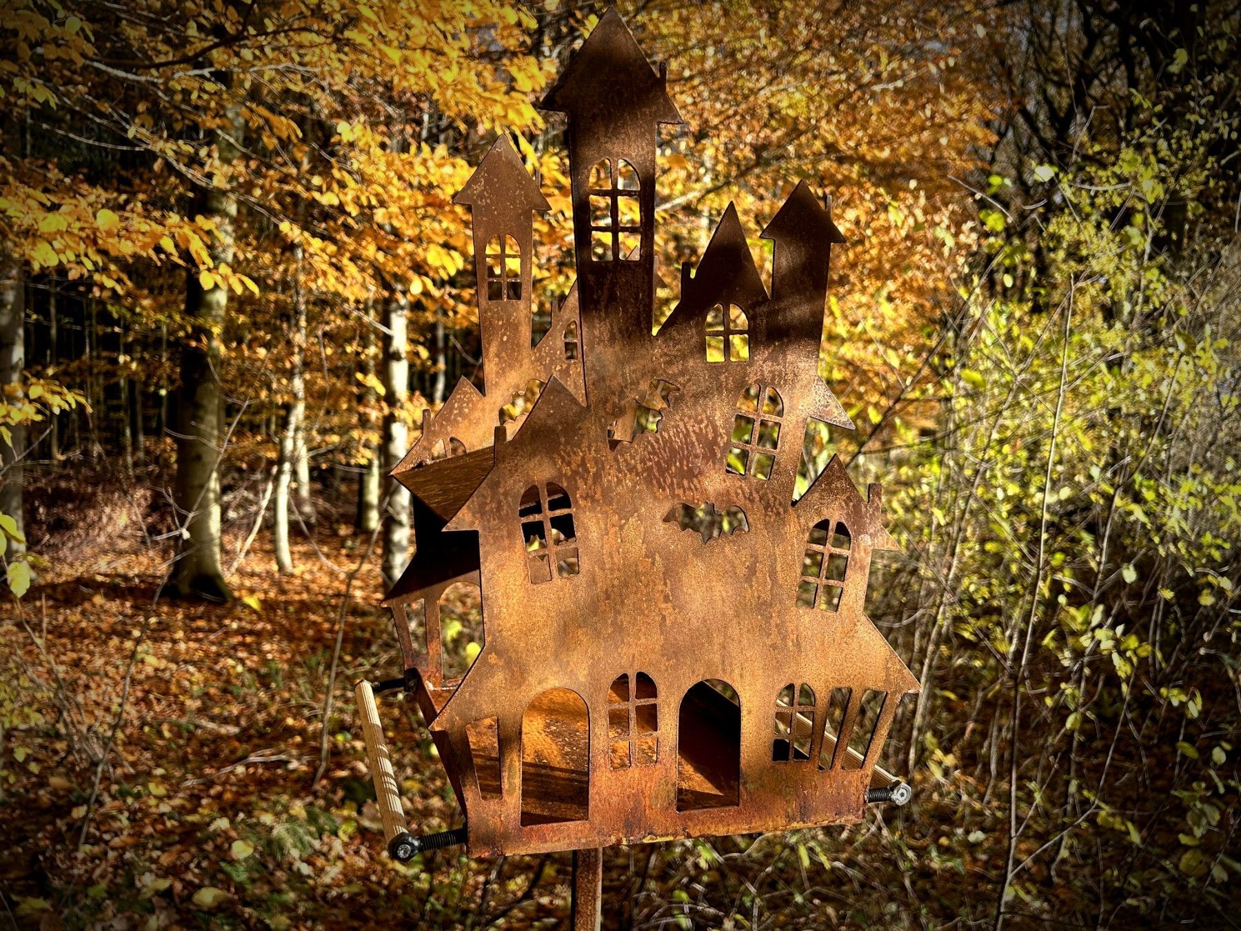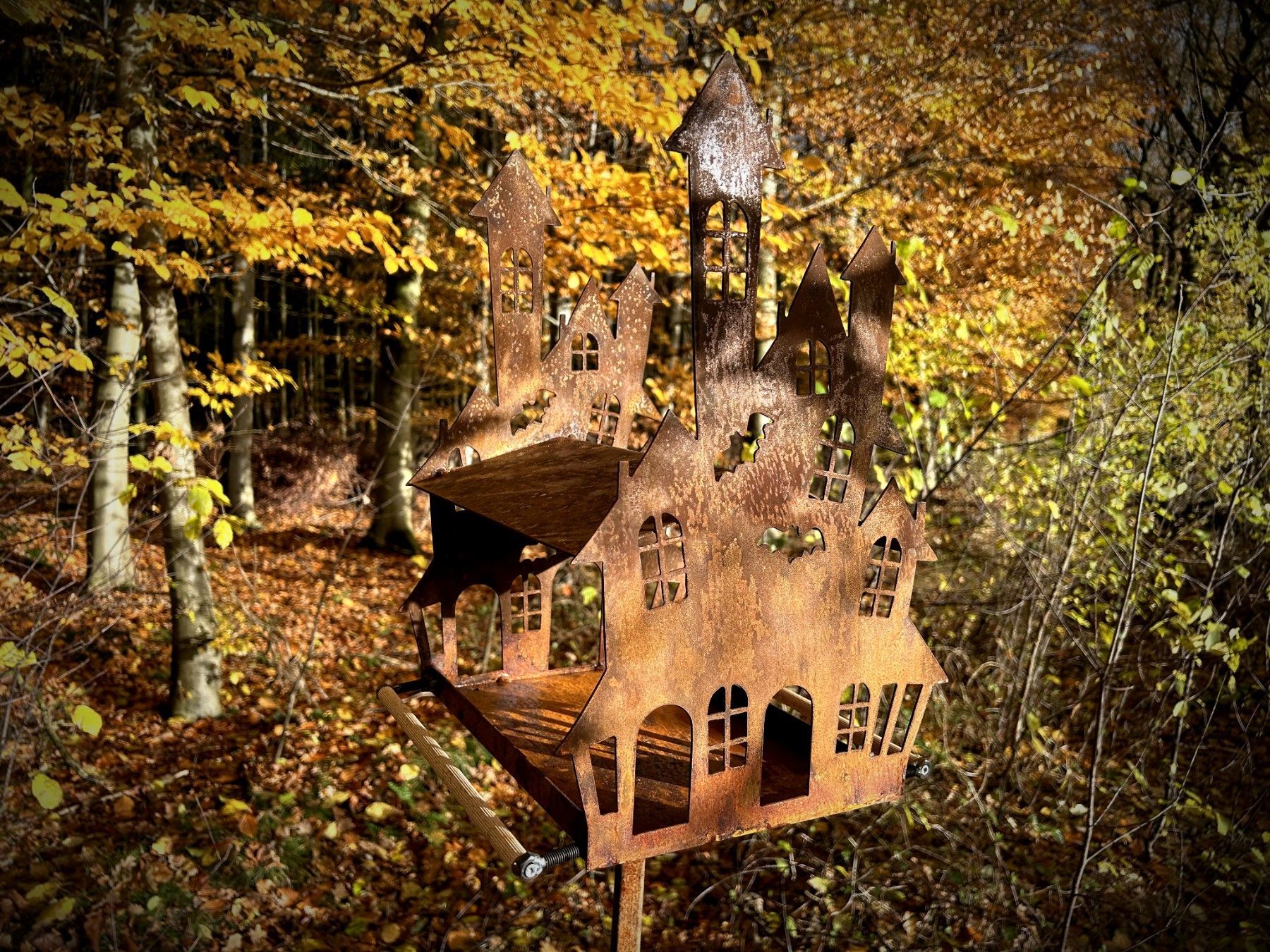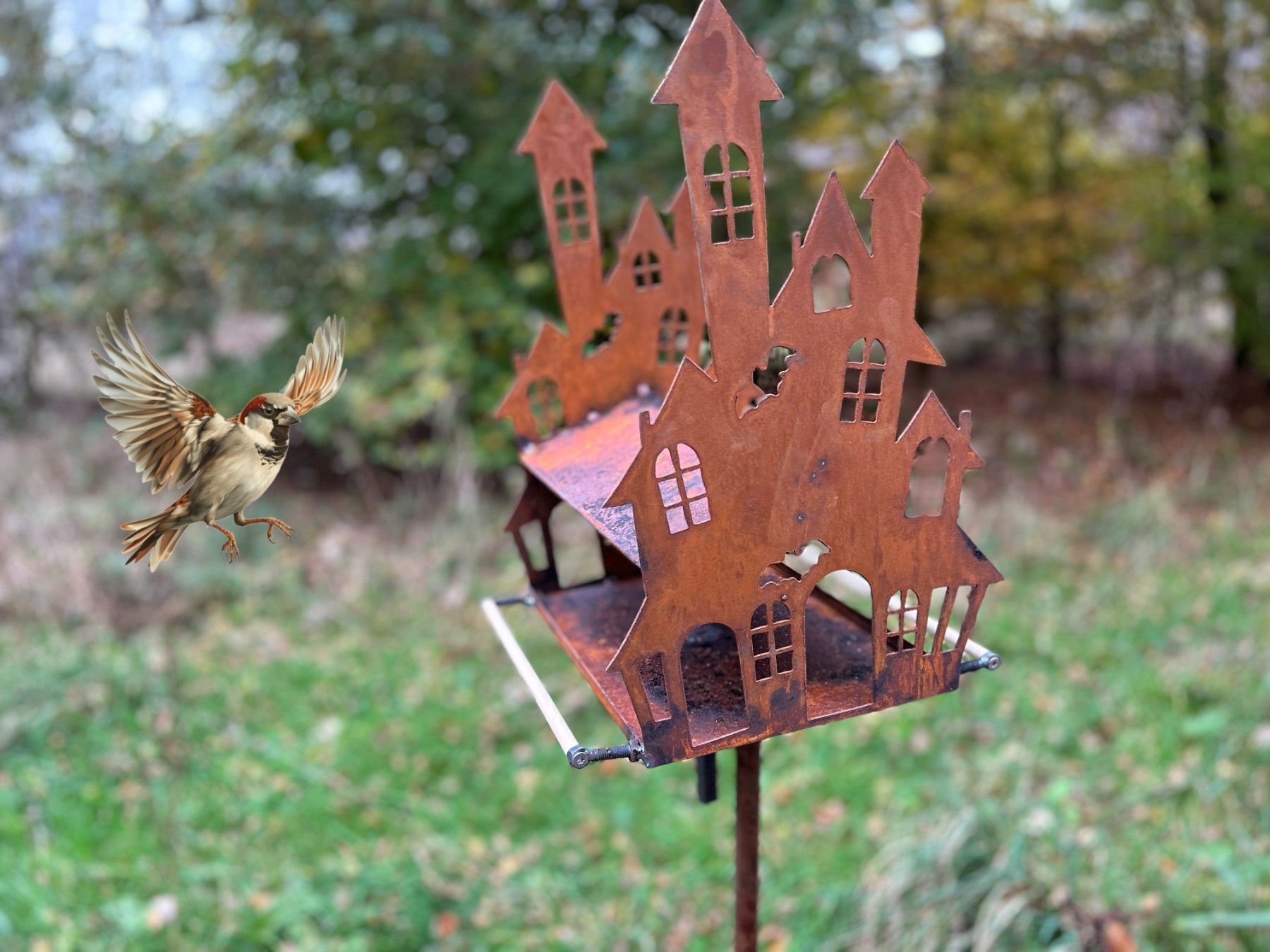 Vogelfutterhaus HEXENHAUS – Ein einzigartiges Highlight für Ihren Garten! Mit diesem Unikat helfen Sie den Vögeln, gut durch die kalte Jahreszeit zu kommen. Das Vogelfutterhaus kann ganz einfach aufgehängt oder auf einen Stab gesteckt werden, sodass es flexibel in Ihrem Garten platziert werden kann. Höhe / Breite / Tiefe ca. 44cm x 33cm x 30cm Material: 1,5mm Stahlblech - schwere Ausführung - Handarbeit Feuchtigkeitsablauf durch Löcher ist gewährleistet. Gewicht: 3,4 kg