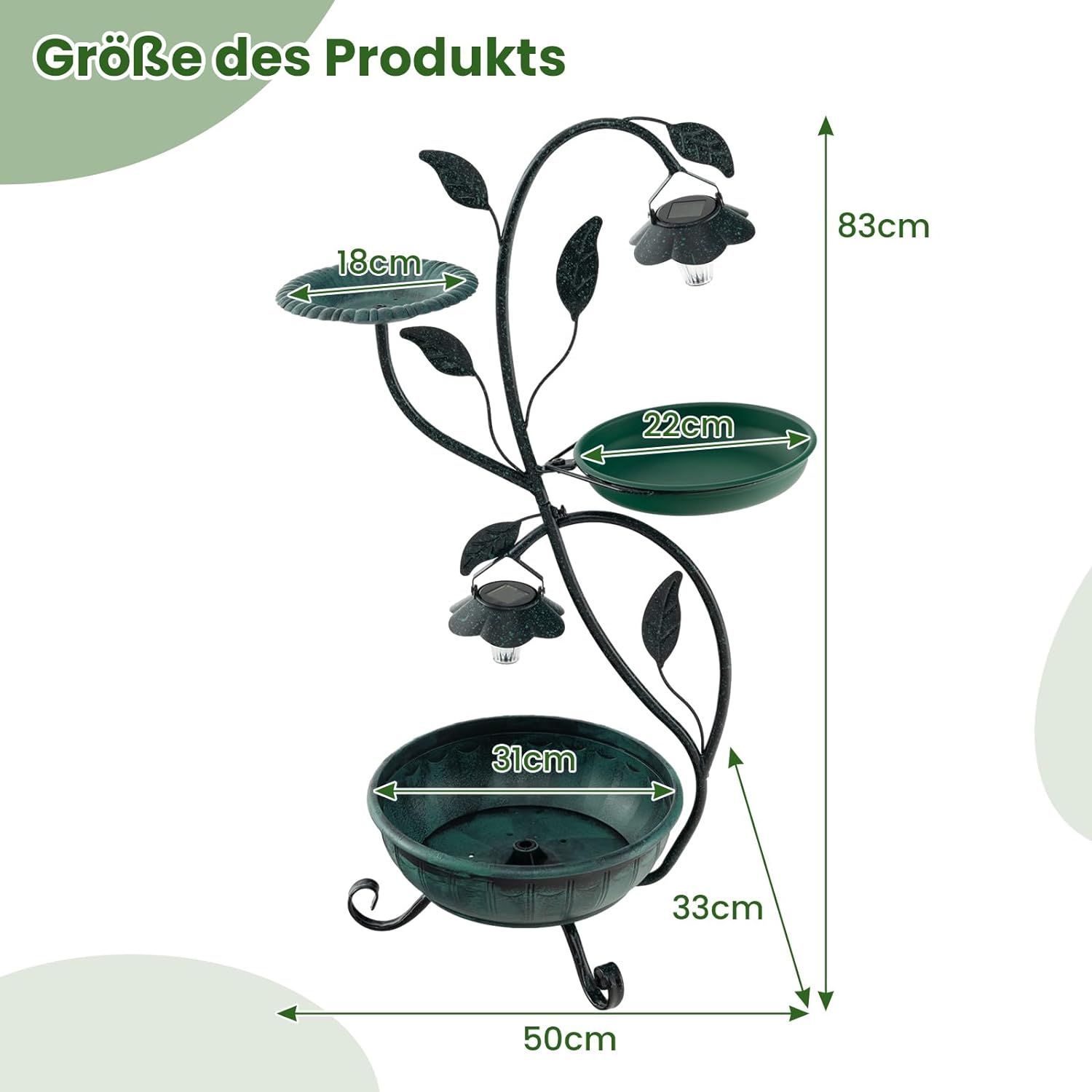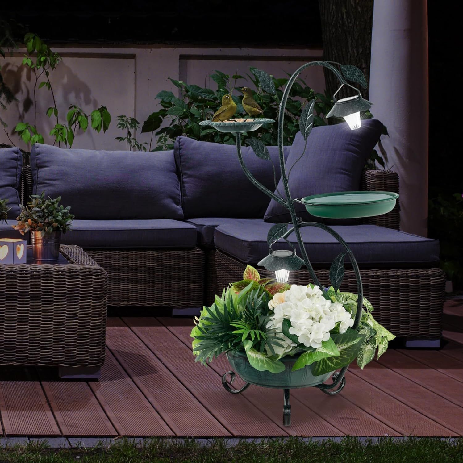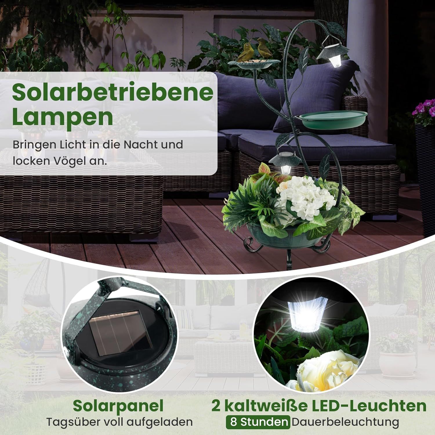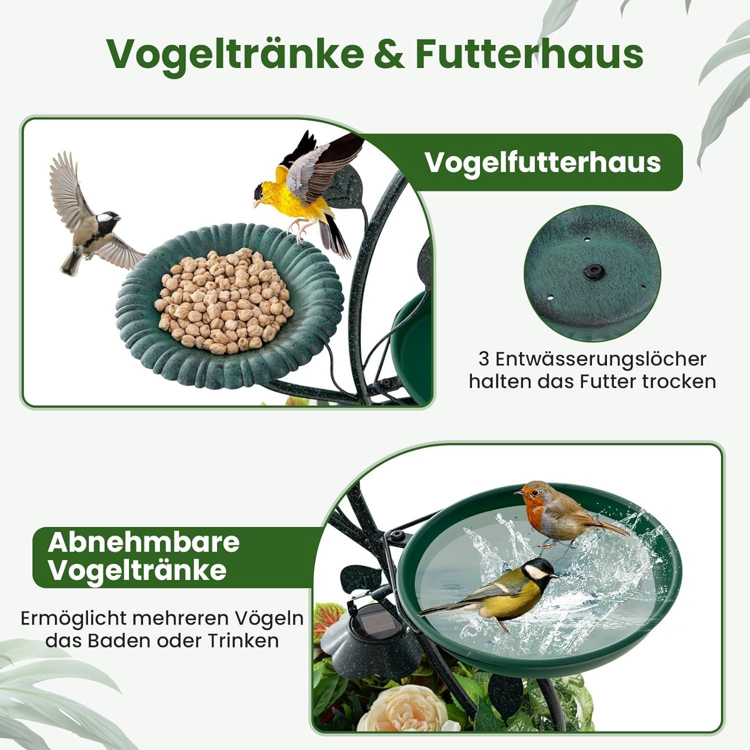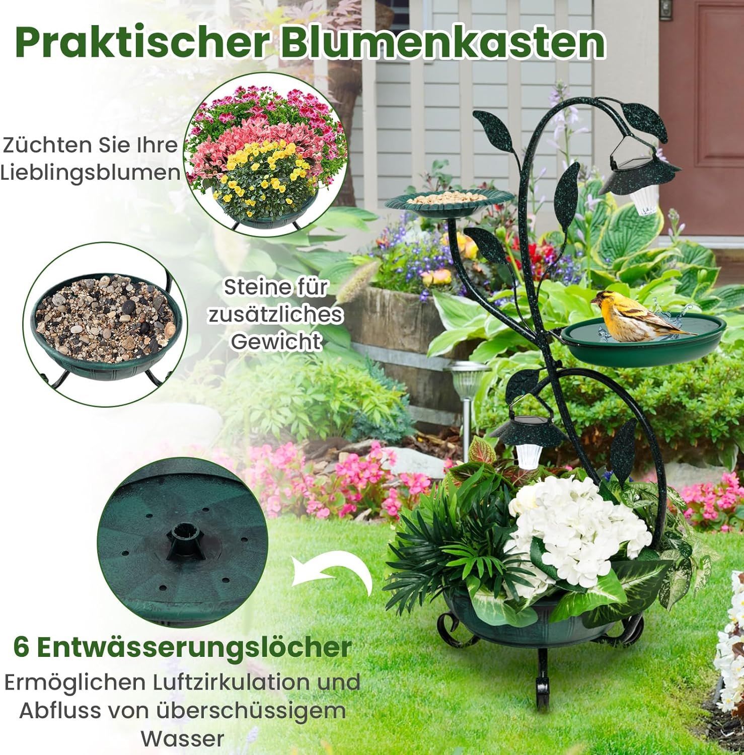 Vogeltränke mit Solarleuchte, Vogelbad Futterspender Blumentopf, Metall, Blumenkasten