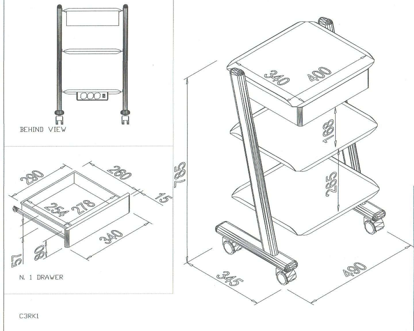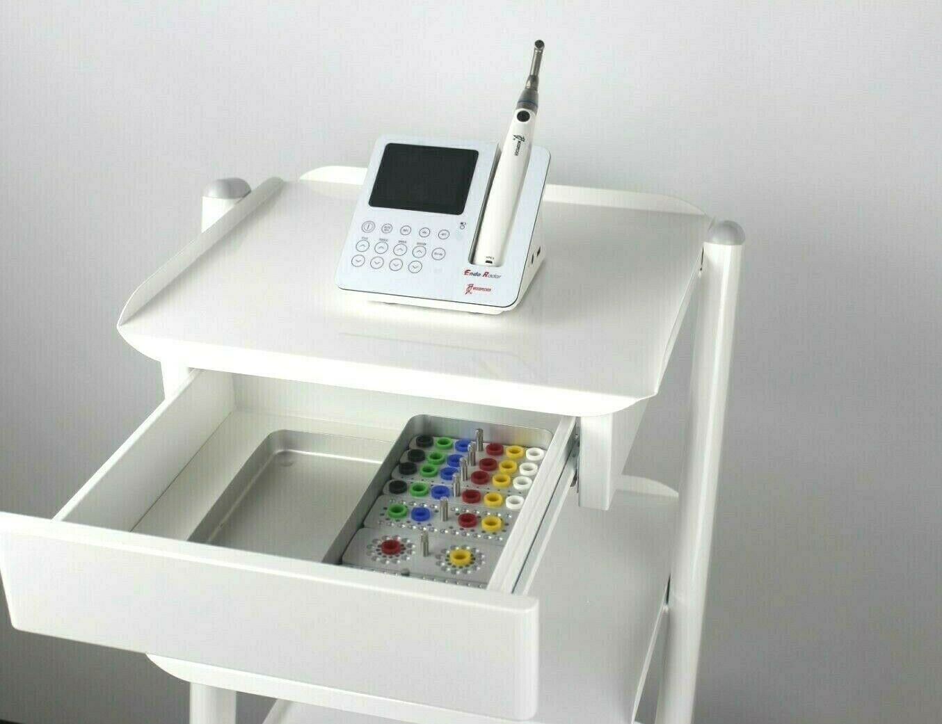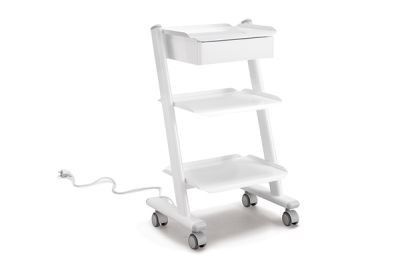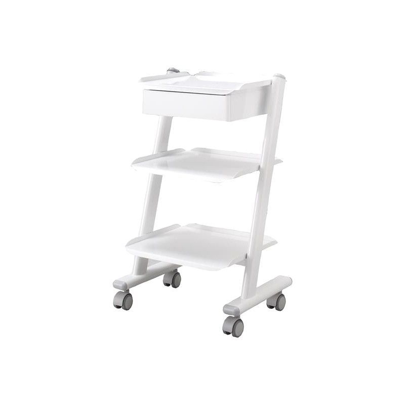 Vogn til tandlægepraksis (uden endomotor og steriboks) Denne trolley blev udviklet som en medicinsk udstyrsbærer i praksis. Vognen har en antiseptisk finish, hvilket gør den nem at rengøre. Det er smart i designet. Vognen er meget fleksibel takket være de dobbelte drejelige hjul. De tre stikkontakter bruges til at forsyne medicinsk udstyr med elektricitet. Der er en skuffe under øverste hylde.