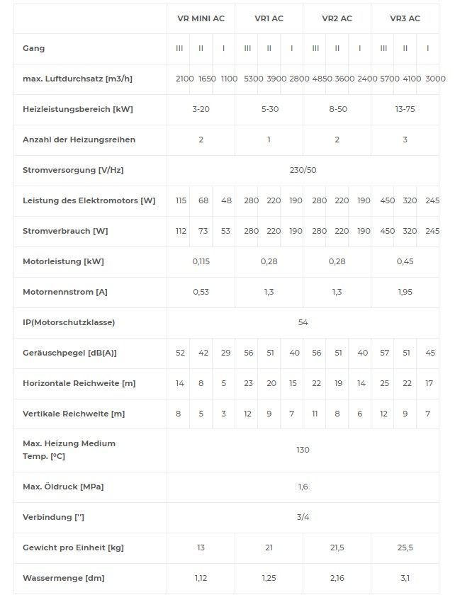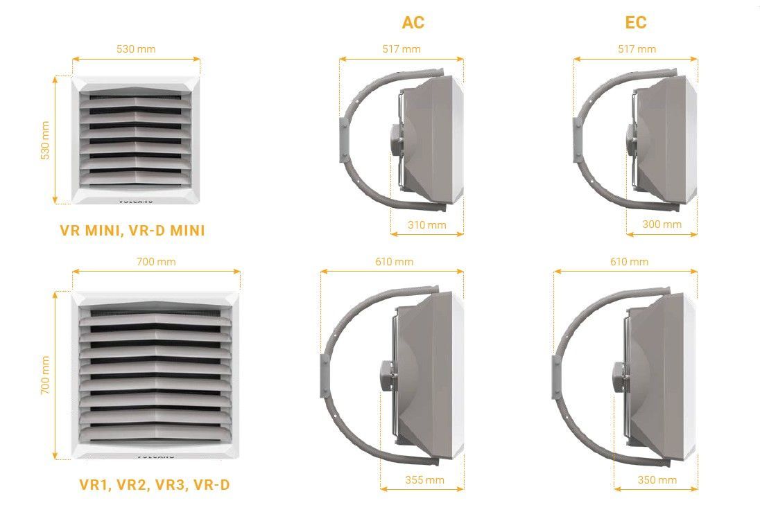 Wasser-Lufterhitzer Volcano VR1 AC 5-30 kW mit Zubehör Zubehör zur Auswahl: • Set 1 mit Konsole: Lufterhitzer VR1 AC 5-30 kW inkl. Drehkonsole Wing Volcano AC • Set 2 mit 3-stuf. Drehzahlregler: Lufterhitzer VR1 AC 5-30 kW inkl. Drehkonsole Wing Volcano AC und 3 Stufiger Drehzahlregler • Set 3 - Kom