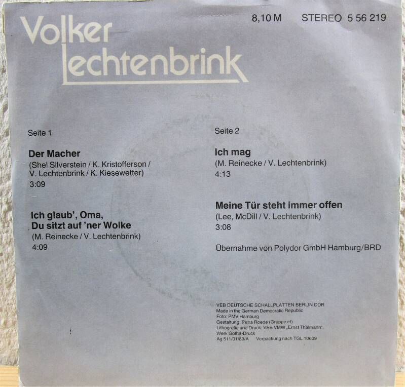 Volker Lechtenbrink - Volker Lechtenbrink Amiga Quartett 5 56 219 1989 Vinyl: VG++ Cover: VG+ A1 Der Macher 3:09 A2 Ich Glaub', Oma, Du Sitzt Auf 'ner Wolke 4:09 B1 Ich Mag 4:13 B2 Meine Tür Steht Immer Offen 3:08 Hersteller EU Verantwortliche Person Lieferzeit 3 - 6 Tage