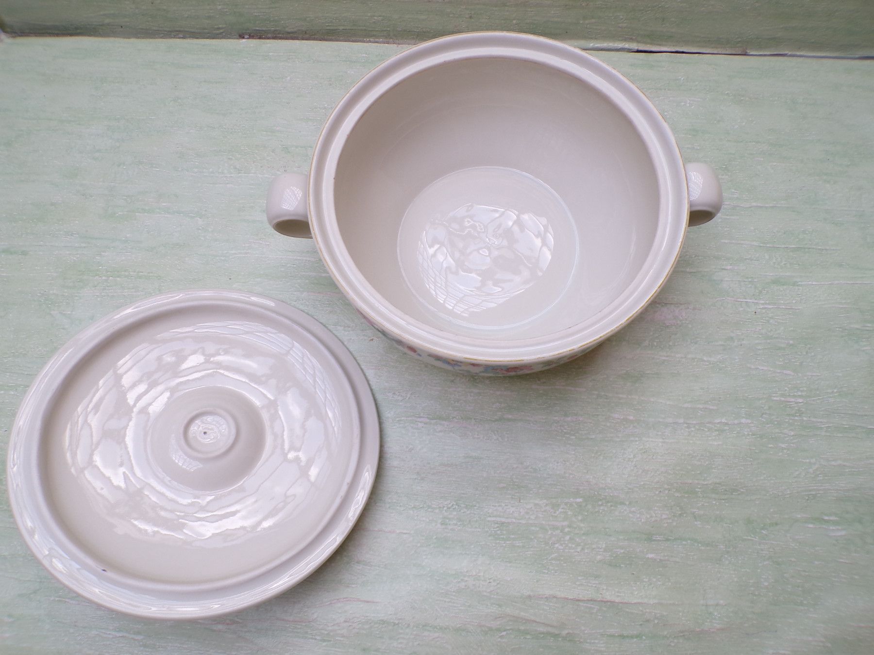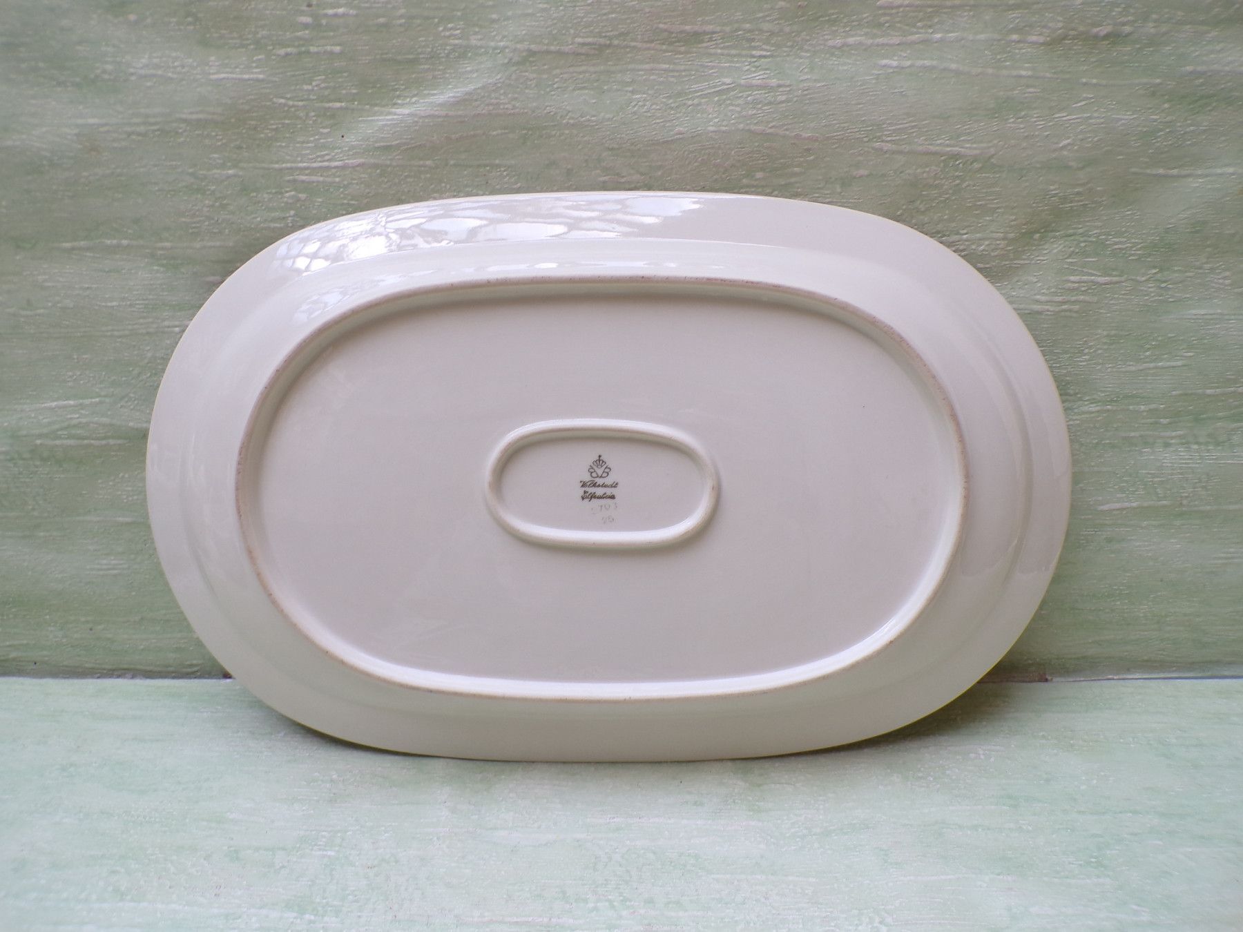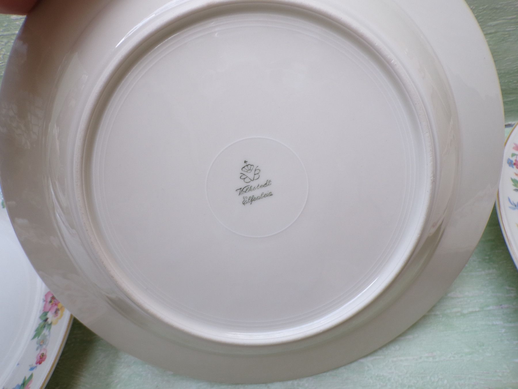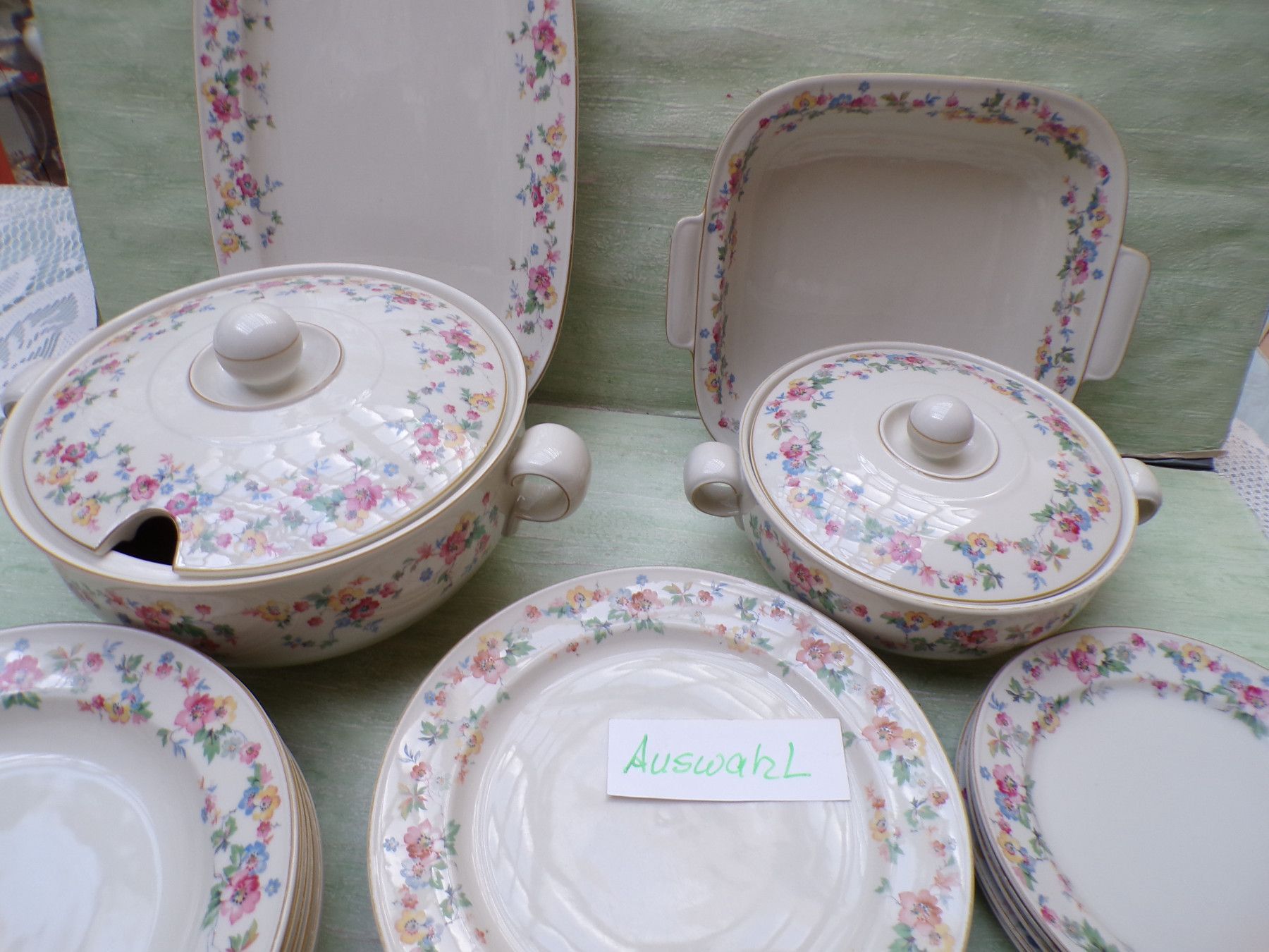 5 Kuchenteller, 6 Suppenteller, 4 Eßteller, Terrine 27x11cm, Suppenterrine 33x15cm, Fleischplatte 39x23,5cm, Schüssel 24,5x27,5x6cm