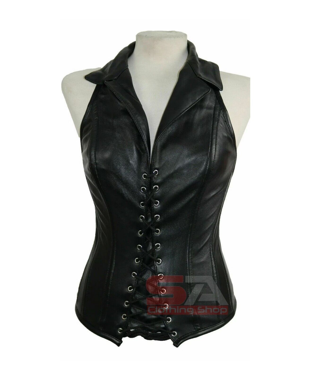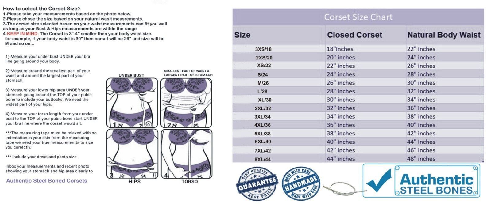 Description Corset Detail Outer shell: Real Leather or Artificial Leather Inner Shell: 100% Cotton Twill Underwired: 100% steel bones Closure: Front Lace, Zipper Back Corset Front Length: 14.5 Corset Length Measure from overbust: 16 Corset Side Length: 13.5 Corset Back Length: 11 5 Modesty Panel at