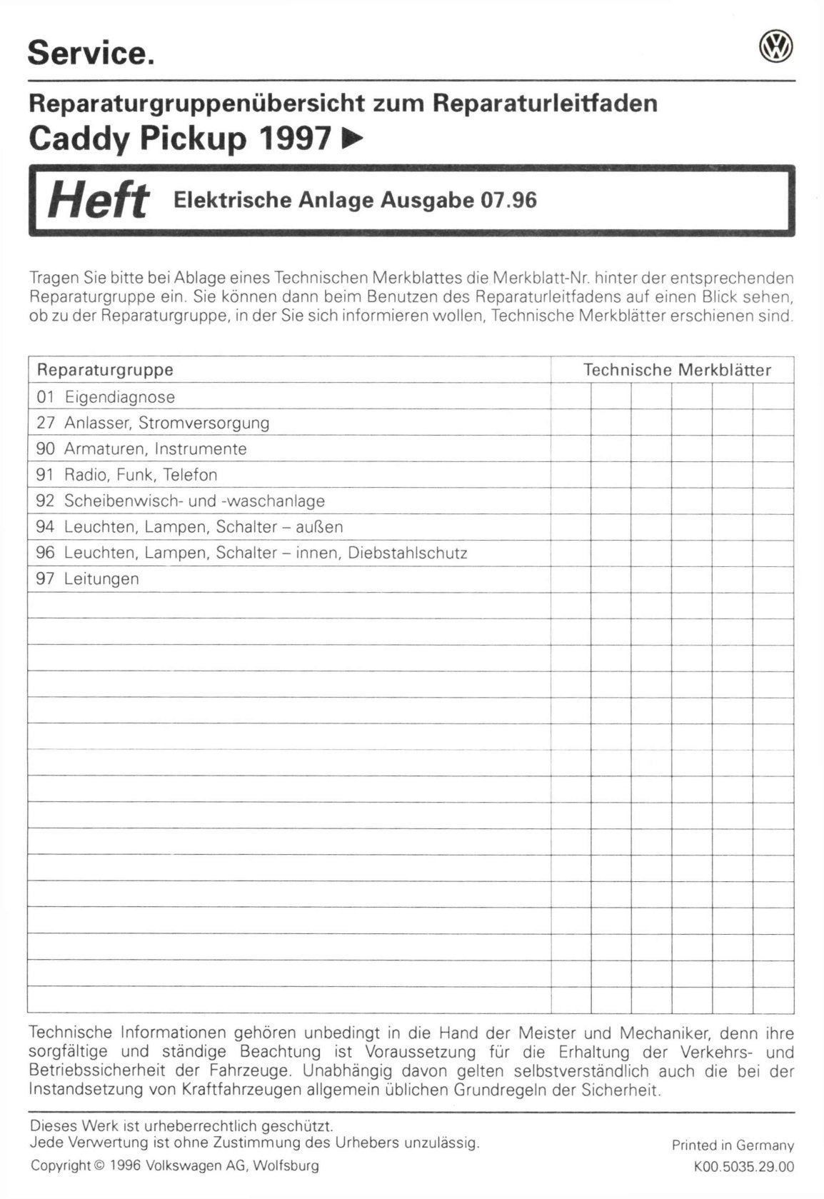 VW Caddy Pickup Typ 9U 1996-2000 Elektrische Anlage Elektrik Reparaturanleitung