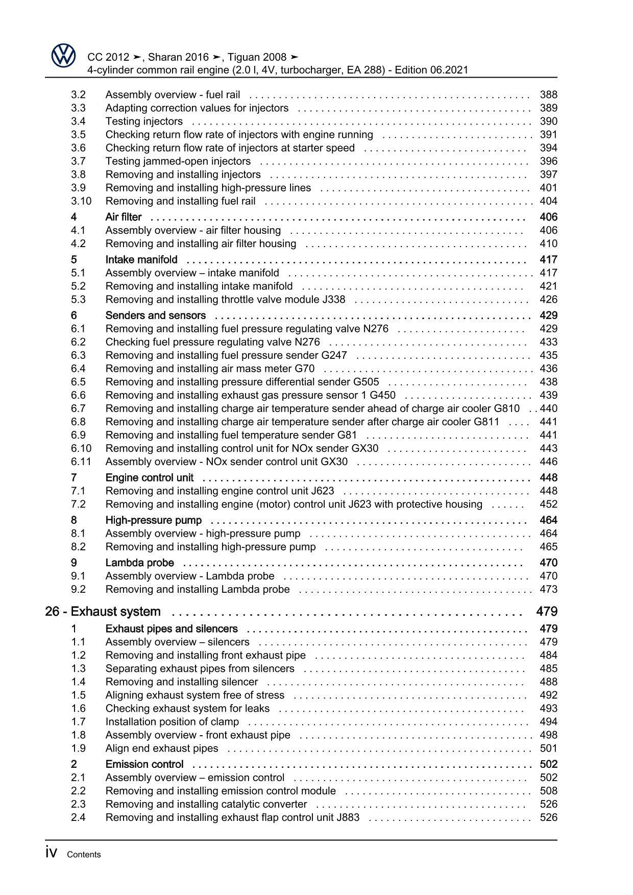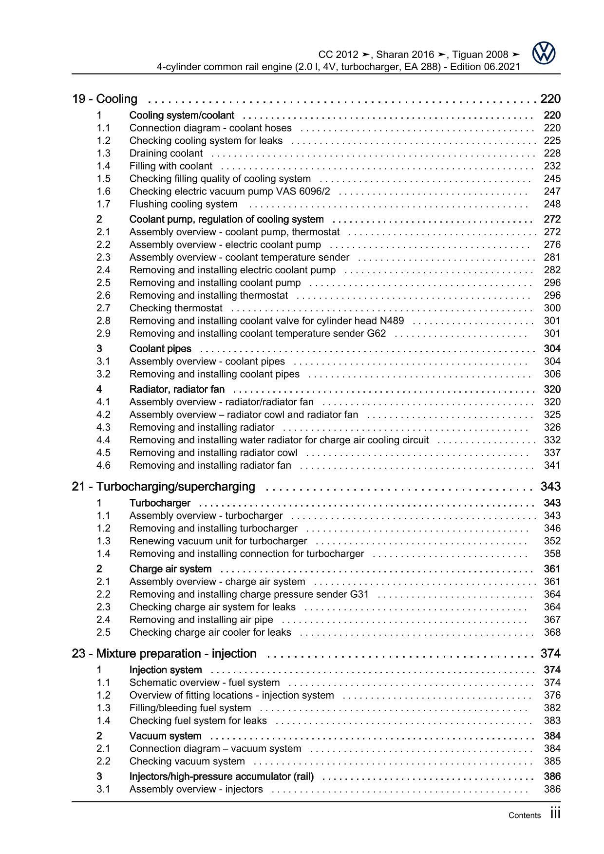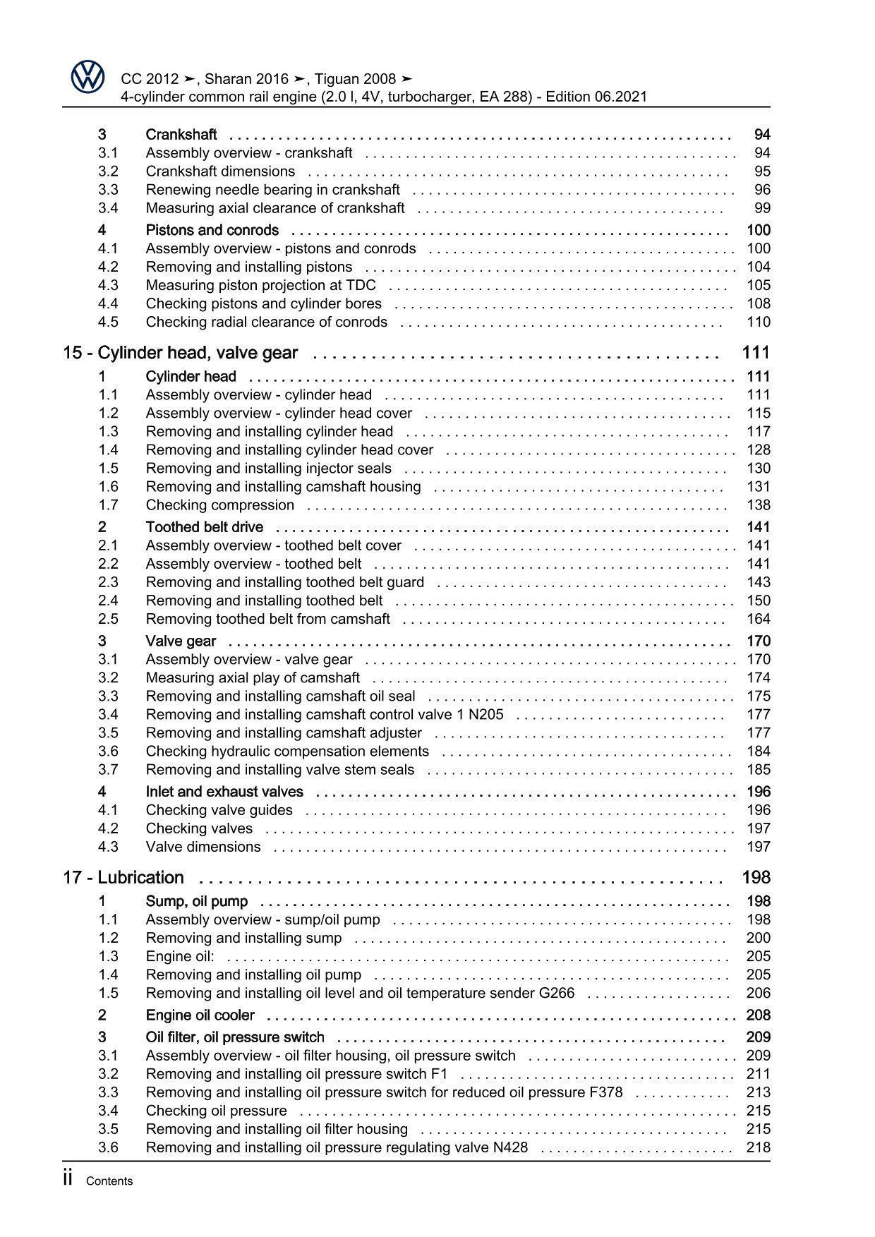 Item type: Repair Manual eBook - Downloadfile Content/subject: 4-cylinder common rail engine (4V, turbocharger, EA 288) Fuel type: Diesel Engine code letters: CUVA, CUVC, CUVE, CUWA, DFMA, DFLA, DFLD, DLTA, DLTC, DLUA, DLUB Engine power in kW/HP: 81, 85, 110, 135 kW / 110, 115, 150, 184 HP Capacity: 2.0l