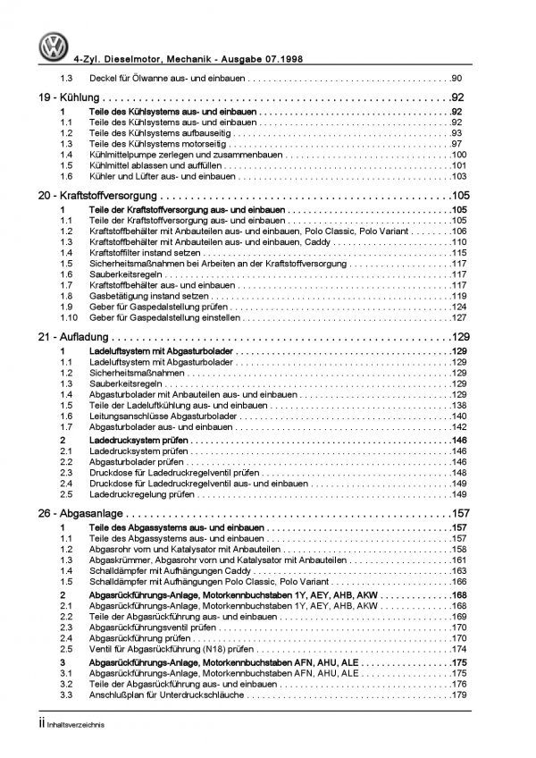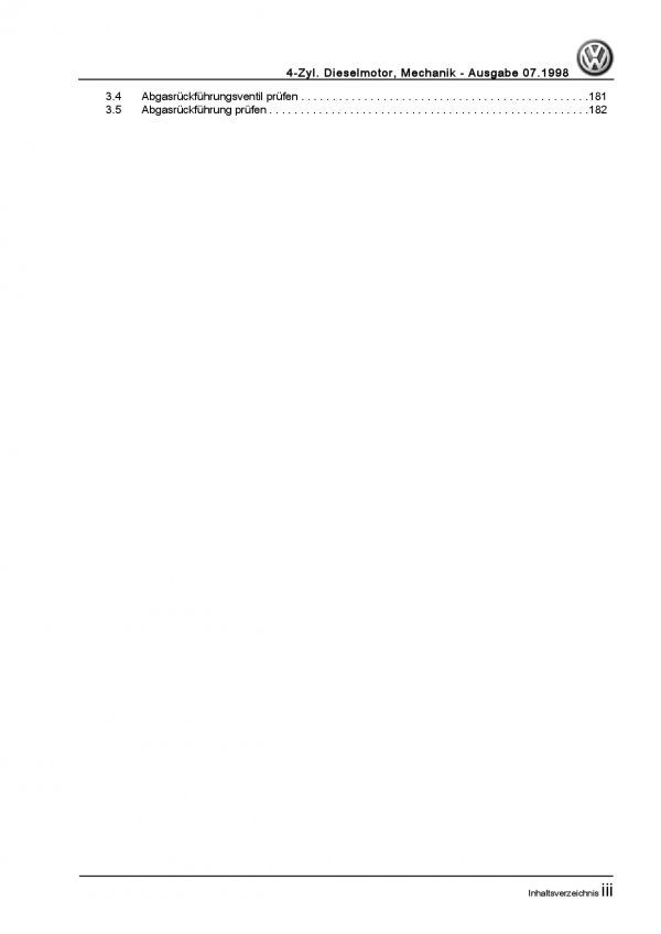 Artikelart: VW Service Reparaturleitfaden Thema / Inhalt: 4-Zyl. Dieselmotor (Mechanik) Kapitel: Motor-Mechanik Kraftstoffart: Diesel Motorkennbuchstaben (MKB): AEY, AFN, AHB, AHU, AKW, ALE, 1Y Motorleistung in kW/PS: 42, 44, 47, 66, 81 kW / 57, 60, 64, 90, 110 PS Hubraum: 1,9l