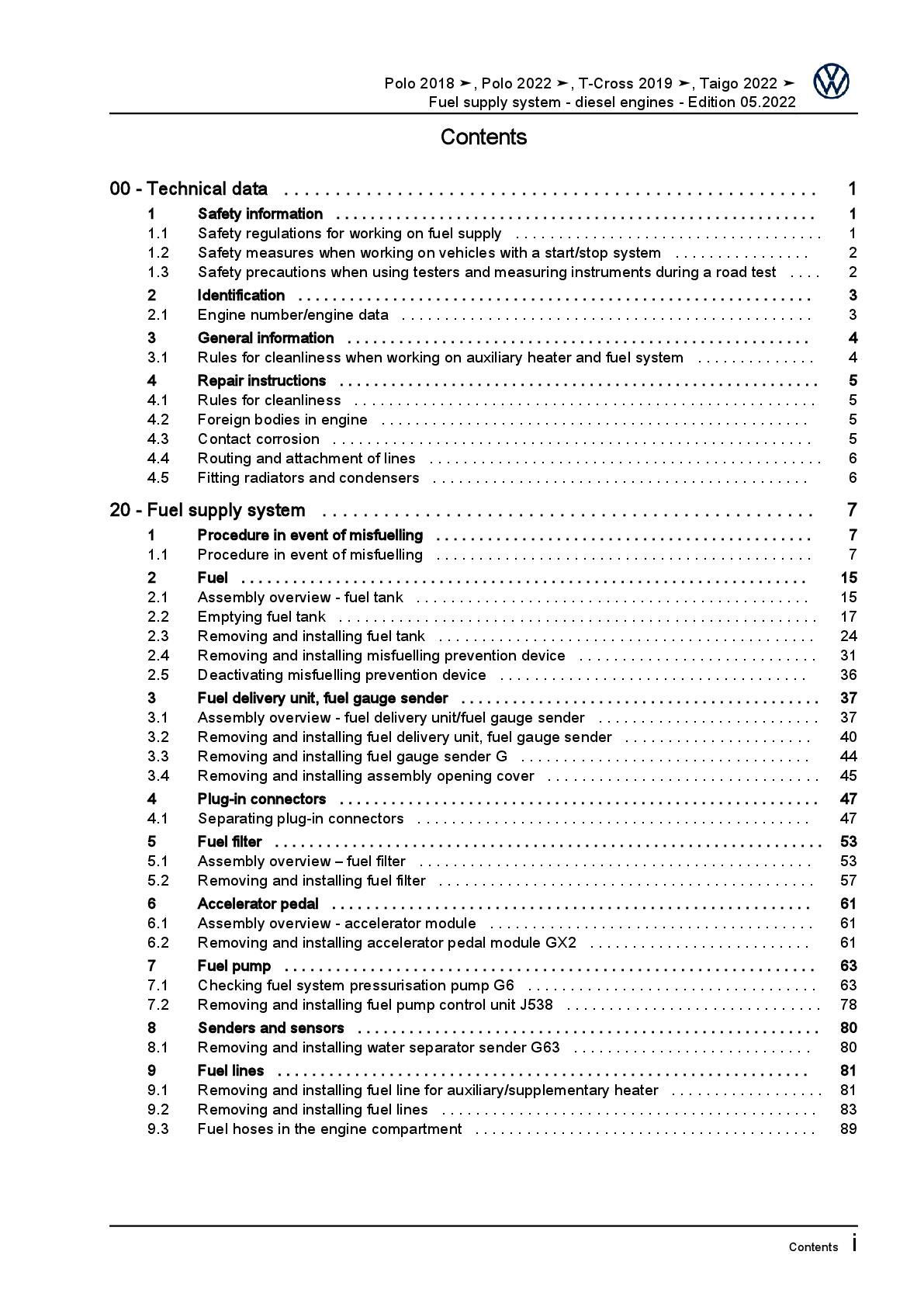 VW T-Cross type C1 from 2018 fuel supply system diesel engines repair manual pdf