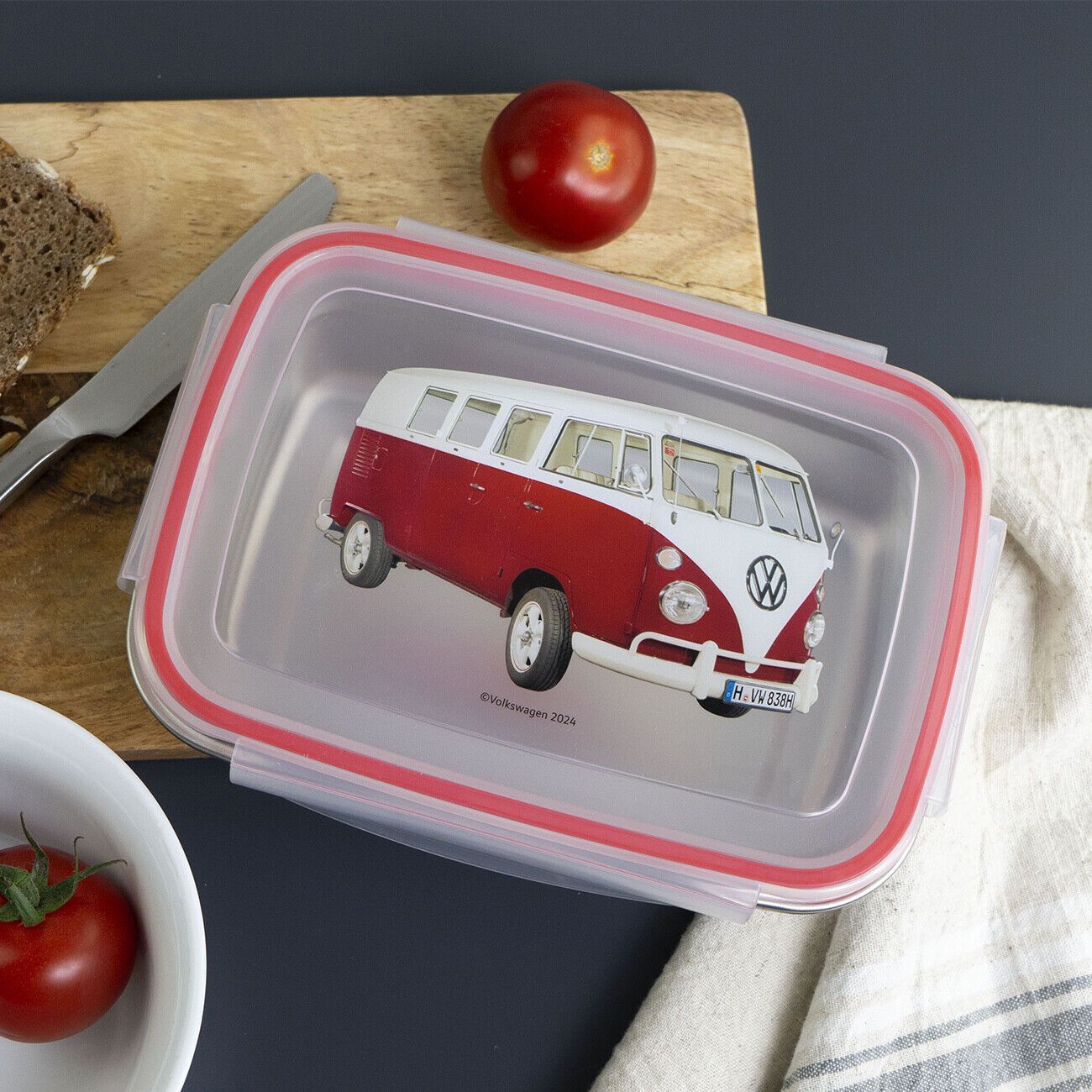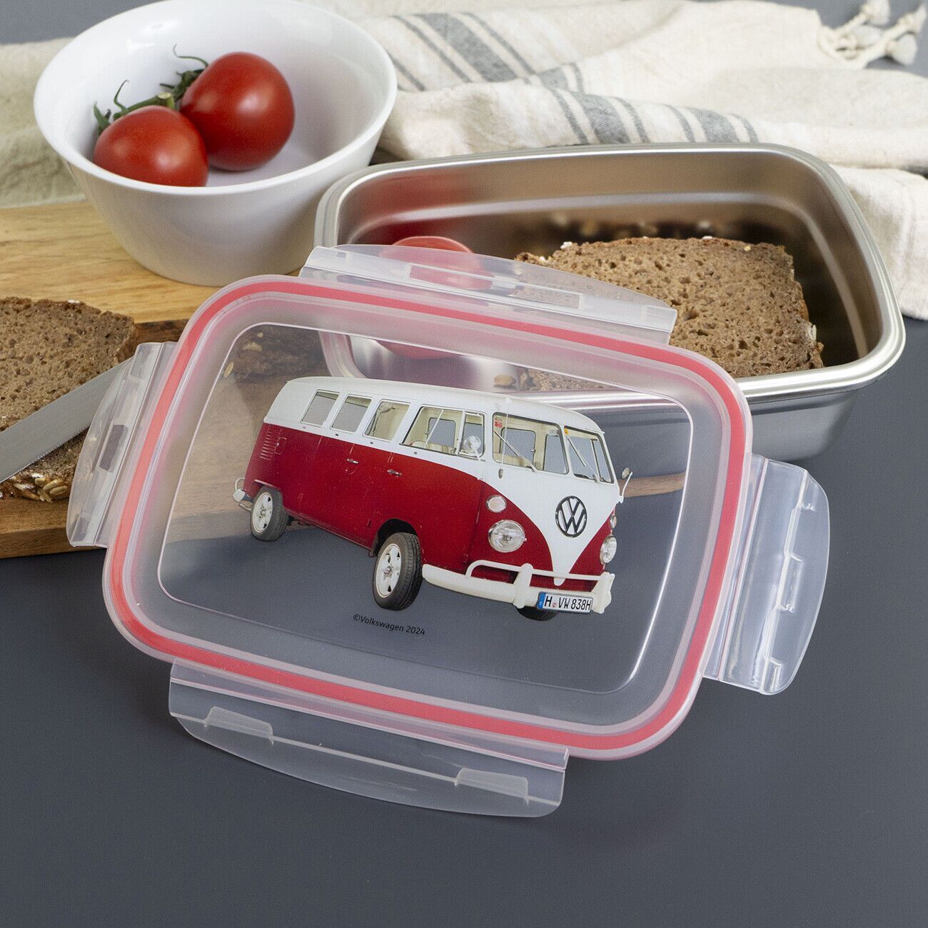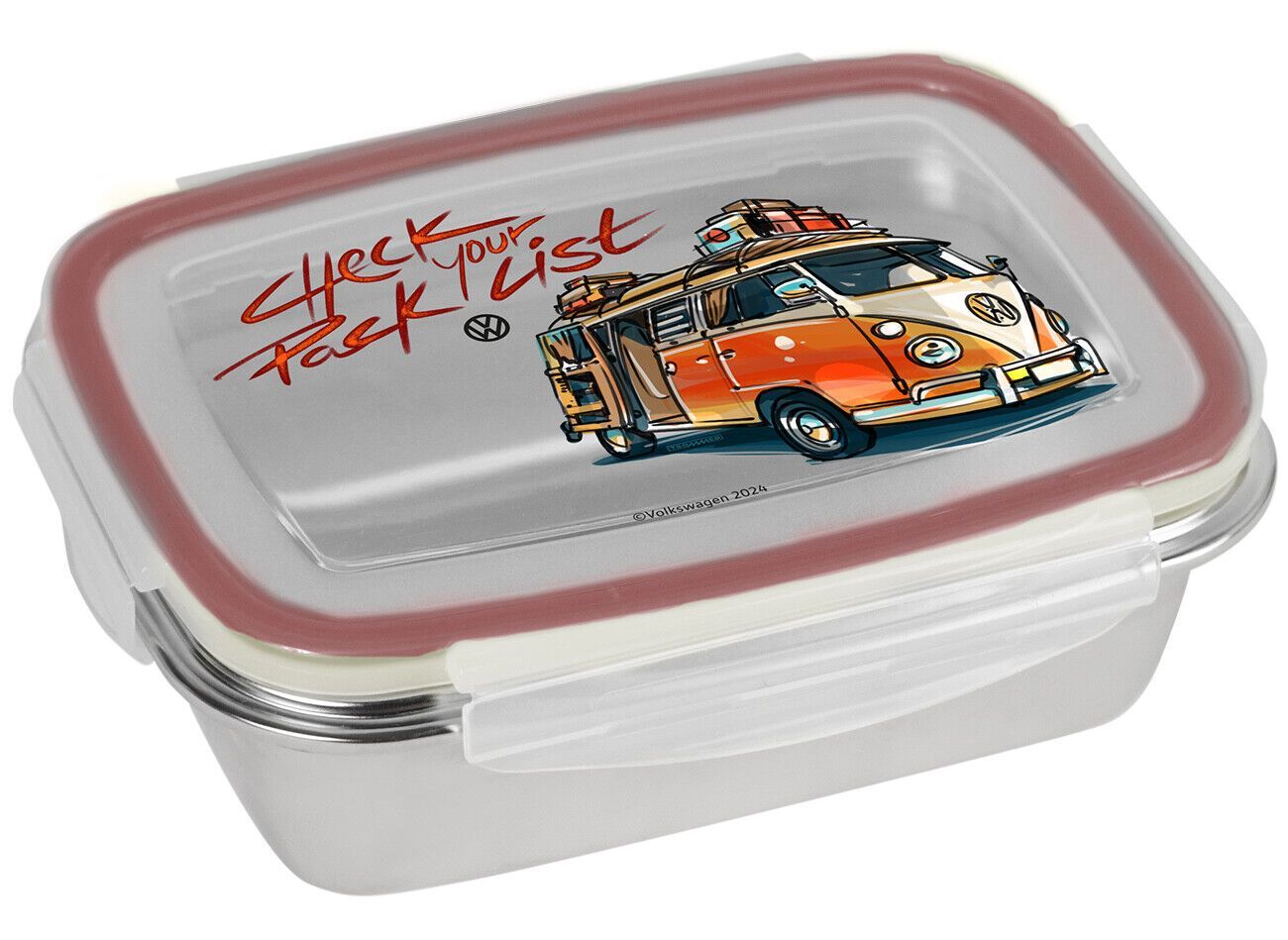 Wunderschöne Brotdosen Lunchboxen aus Edelstahl mit Bulli Motiven Mit der Brotdose aus der VW Bulli Reihe hast du Unterwegs immer eine kleine Stärkung dabei. Die praktische Dose aus Edelstahl hat einen Deckel mit 4-seitigem Clipverschluss und umlaufender Gummilippe, perfekt für eine Pausenmahlzeit a