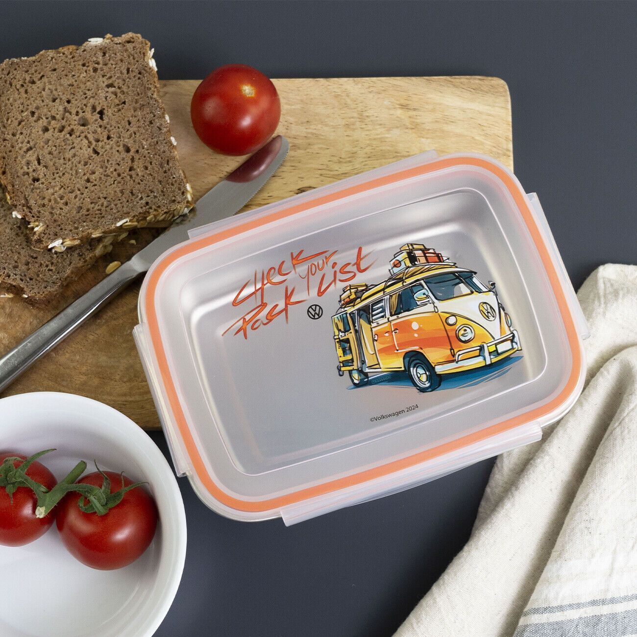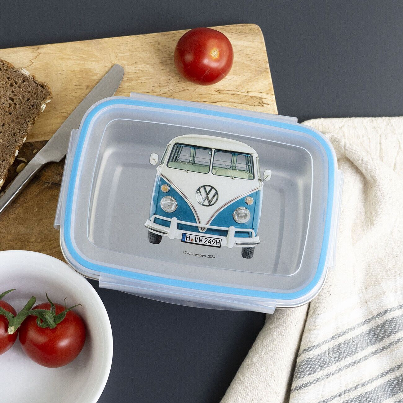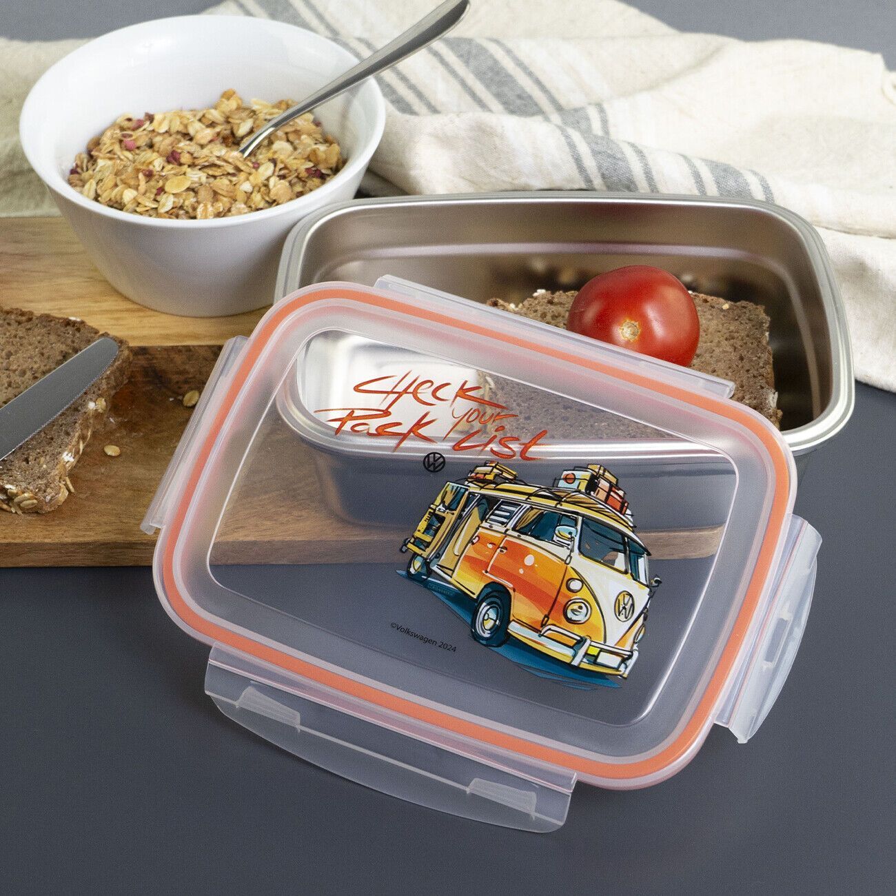 Wunderschöne Brotdosen Lunchboxen aus Edelstahl mit Bulli Motiven Mit der Brotdose aus der VW Bulli Reihe hast du Unterwegs immer eine kleine Stärkung dabei. Die praktische Dose aus Edelstahl hat einen Deckel mit 4-seitigem Clipverschluss und umlaufender Gummilippe, perfekt für eine Pausenmahlzeit a