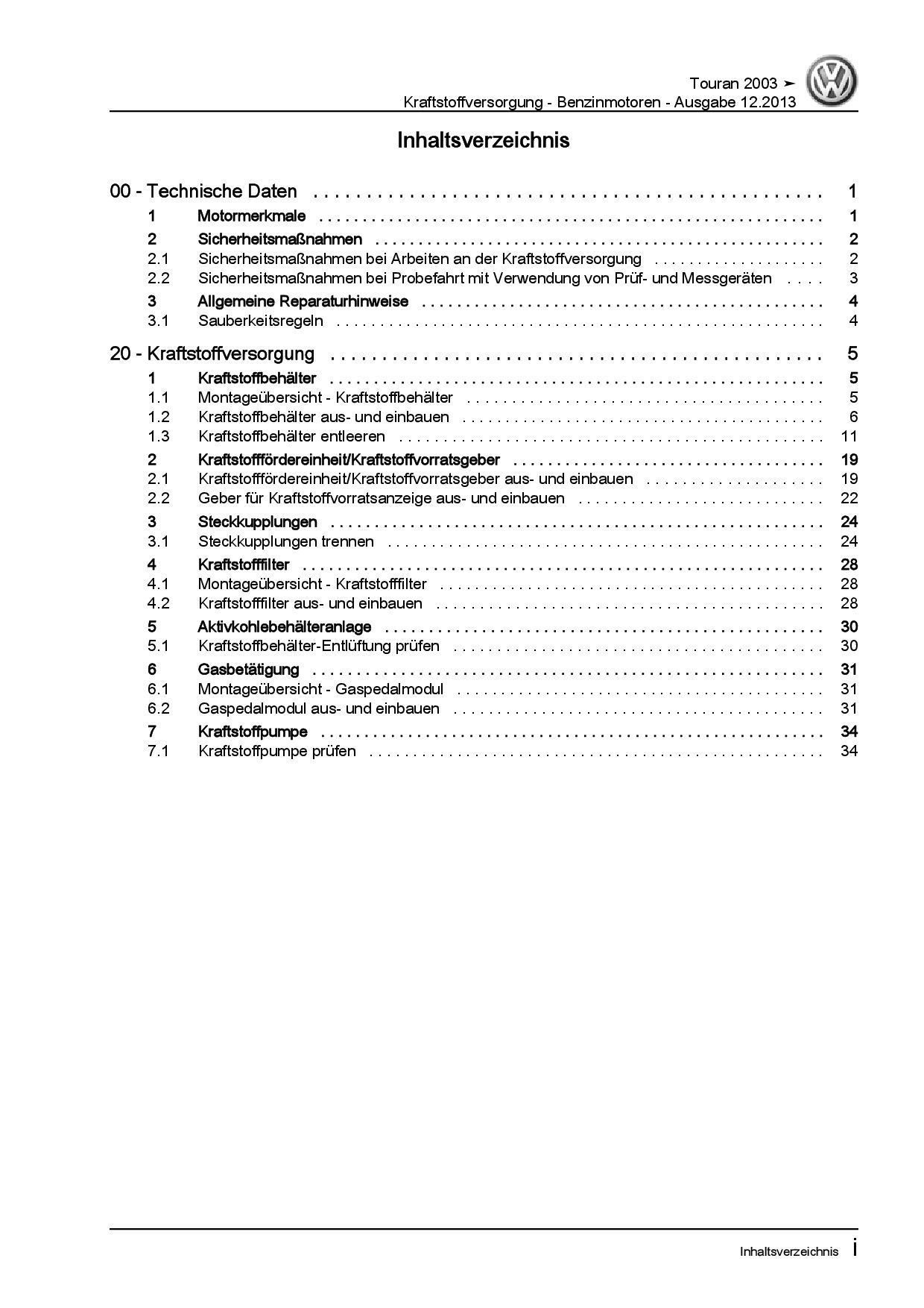 VW Touran Typ 1T 2003-2015 Kraftstoffversorgung Benzinmotoren Reparaturanleitung