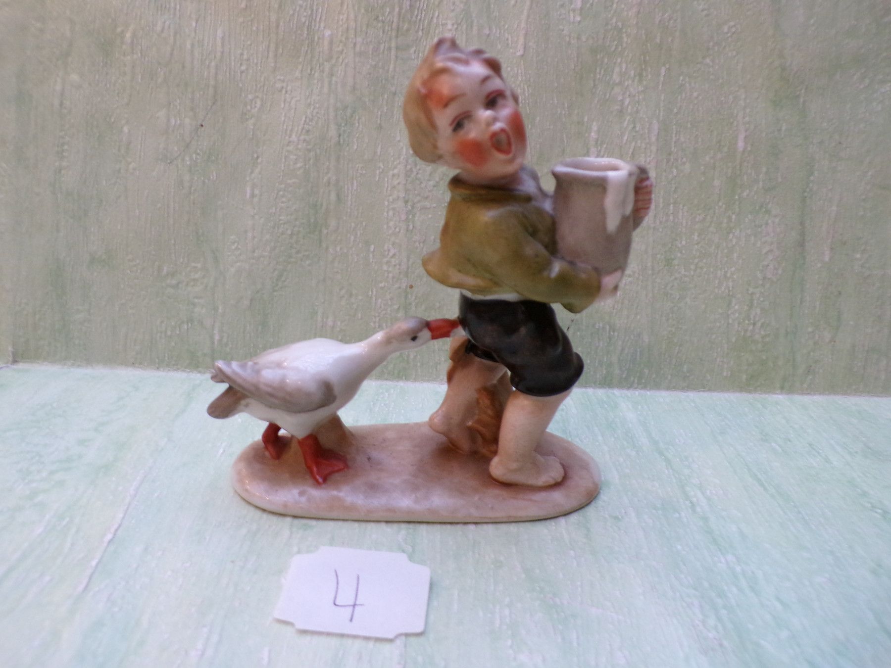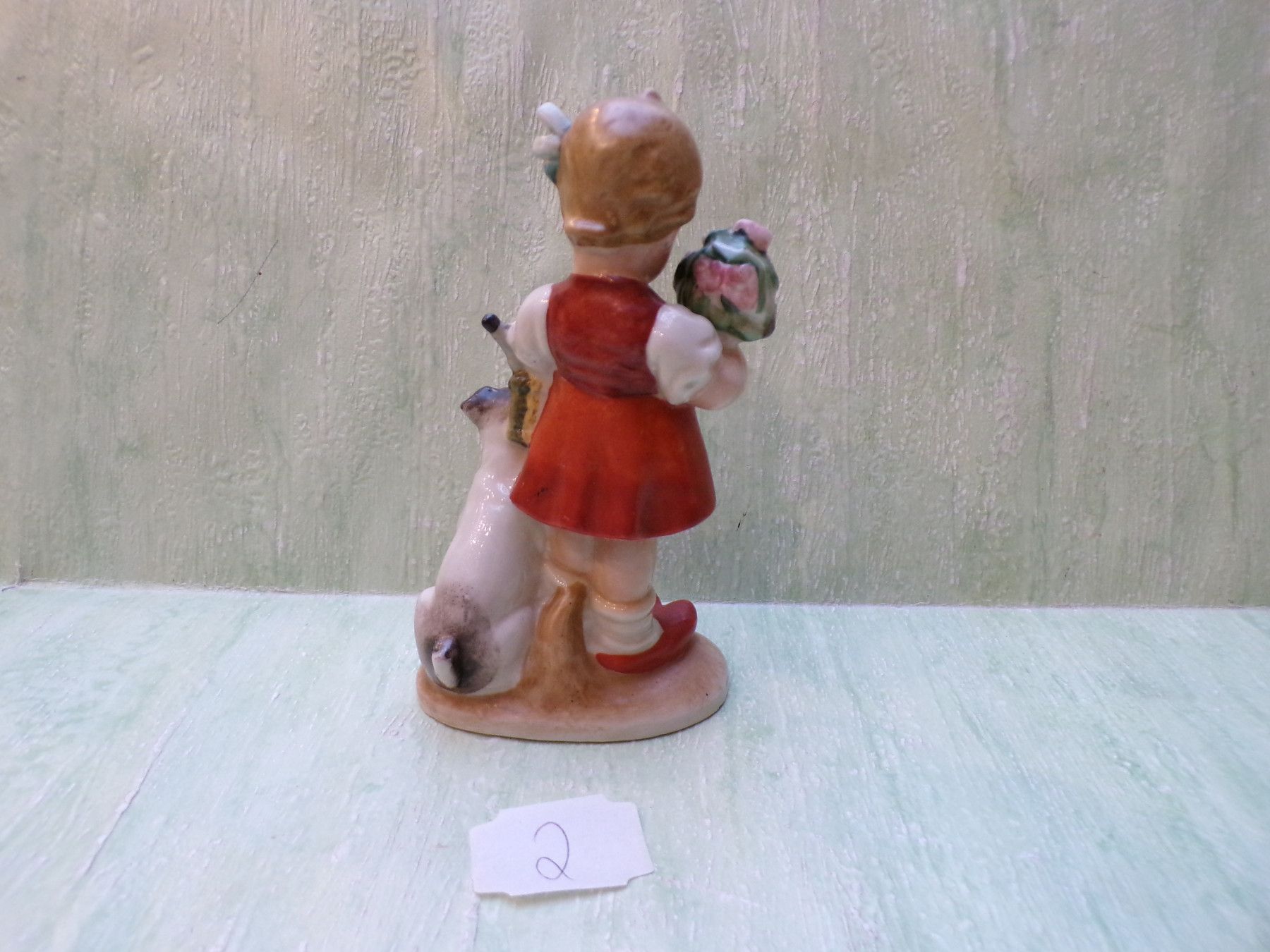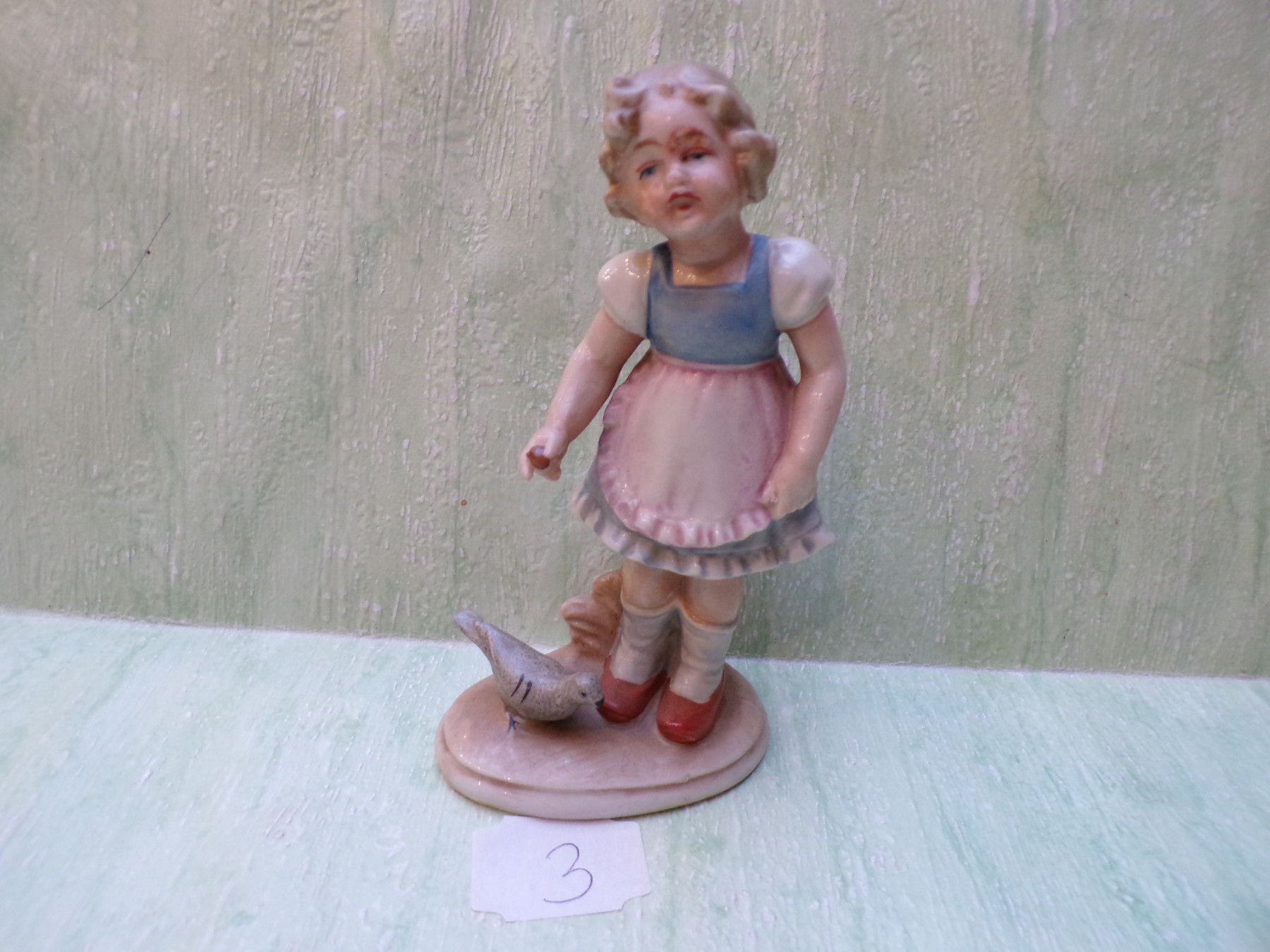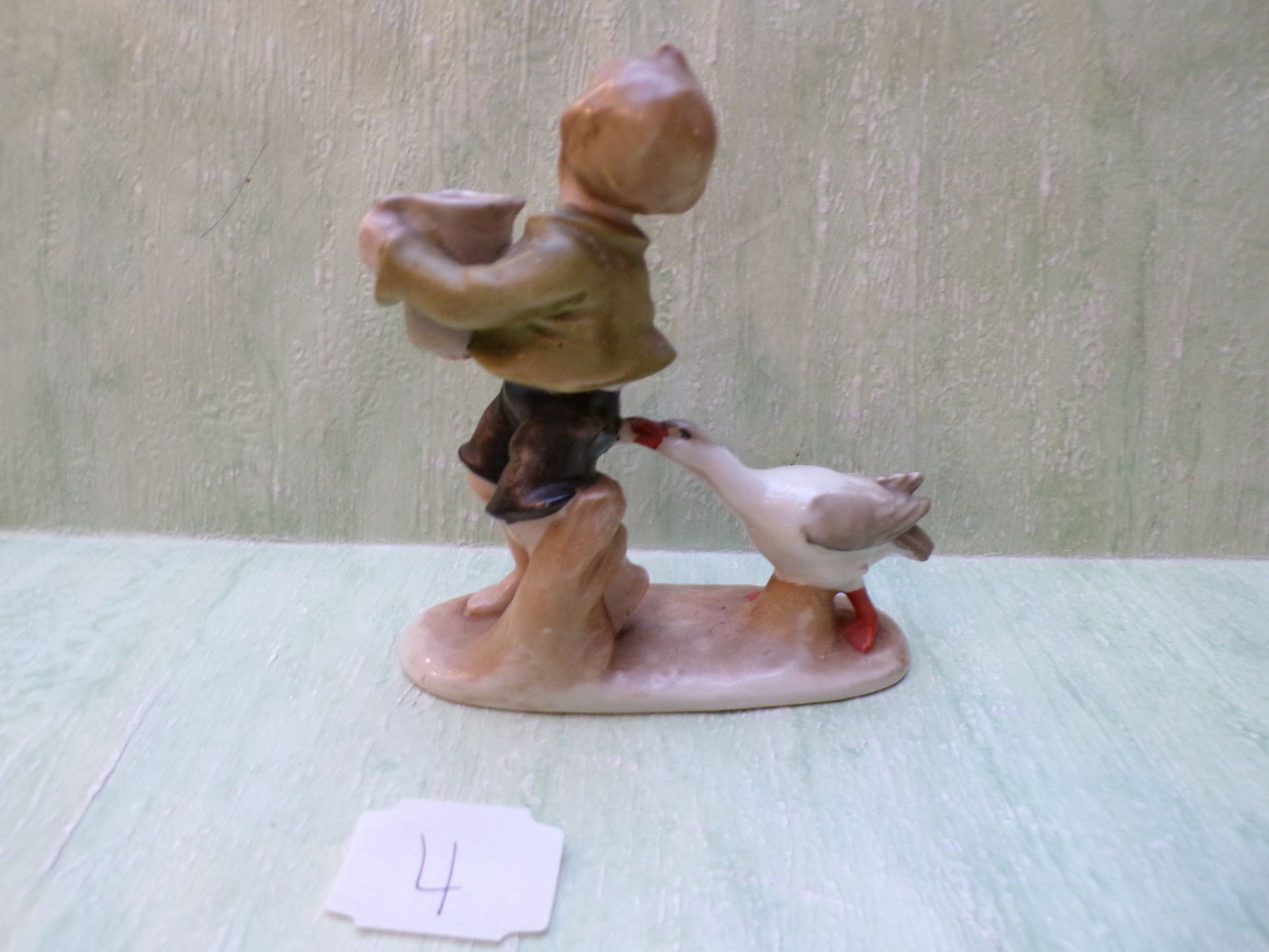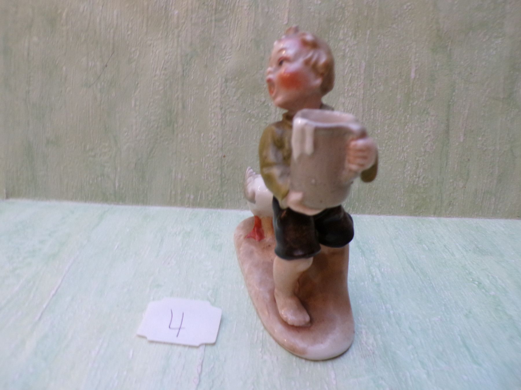1: blaus Kleid mit Hund 13cm, 2: rotes Kleid mit Hund 12,5cm, 3: Mädel mit Taube 13cm und 4: Junge mit Gans
