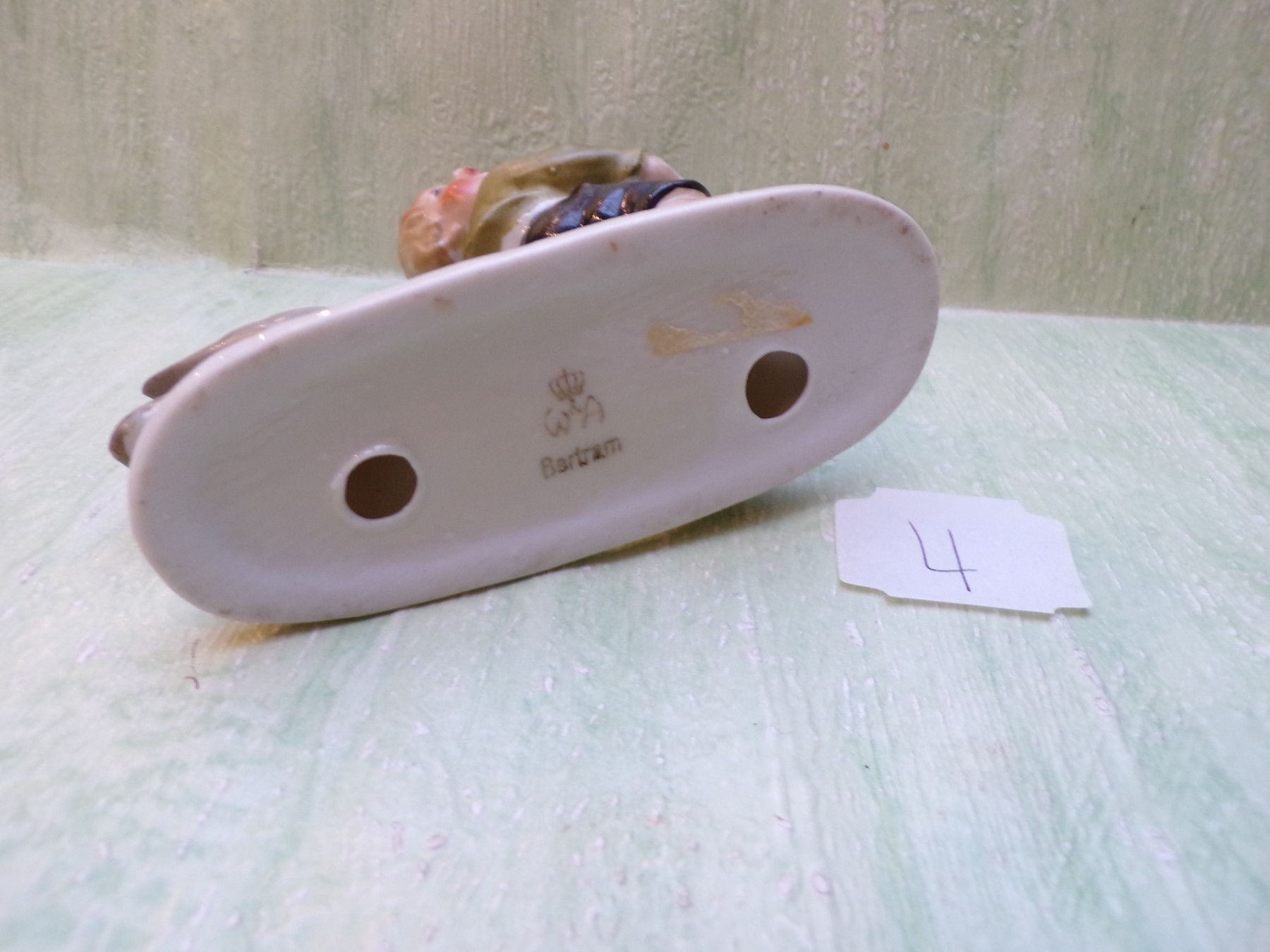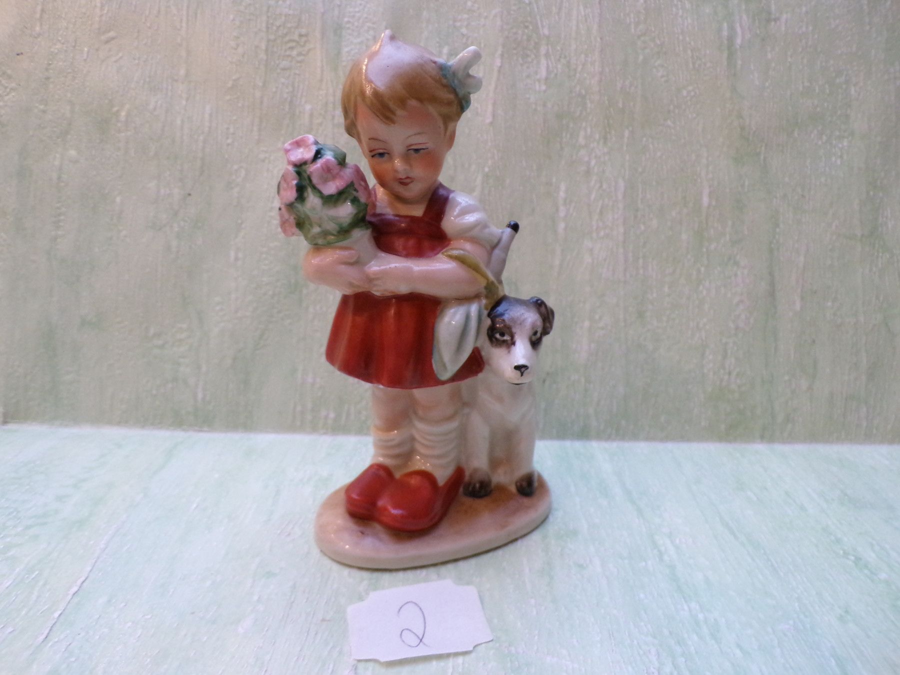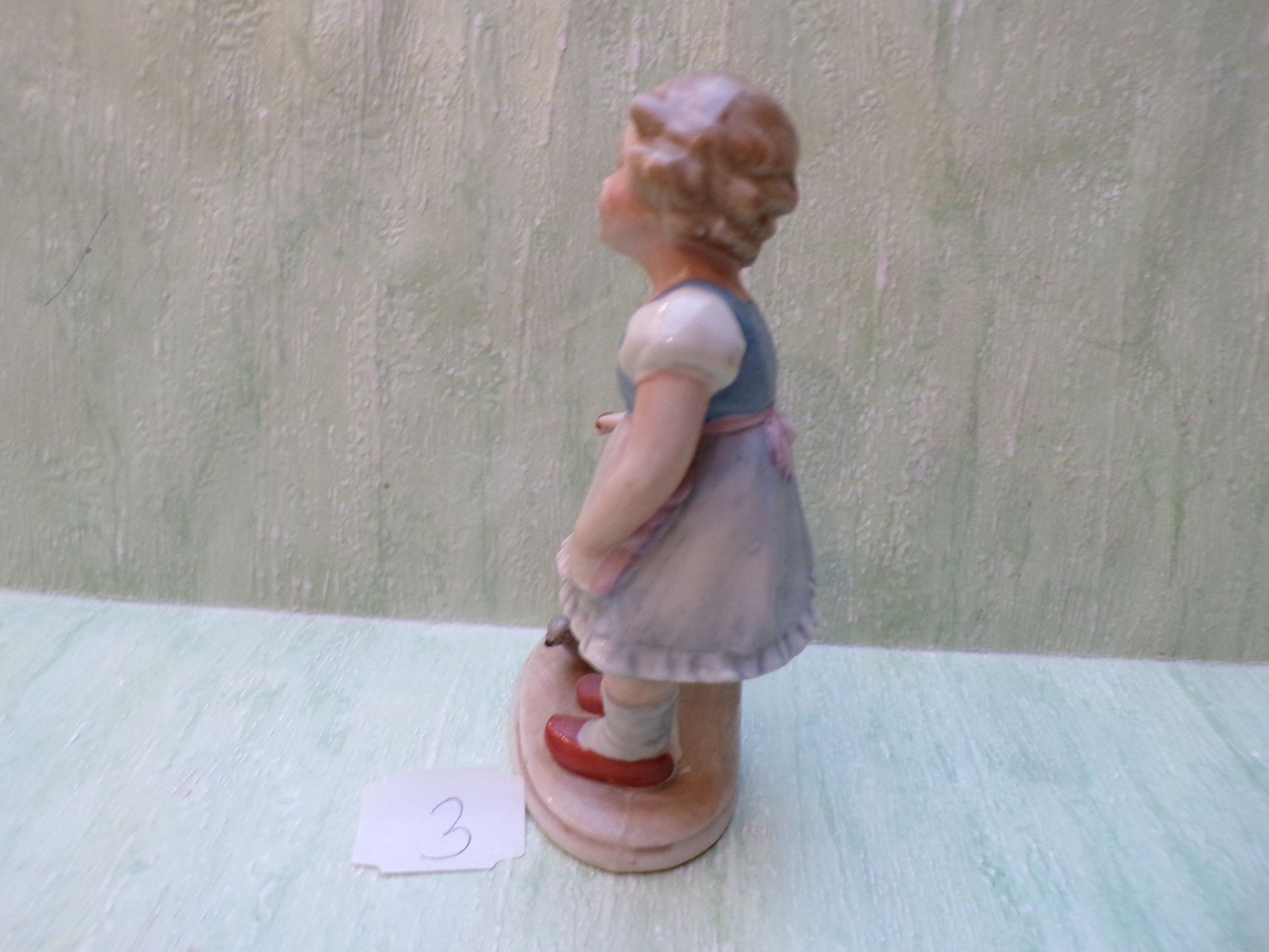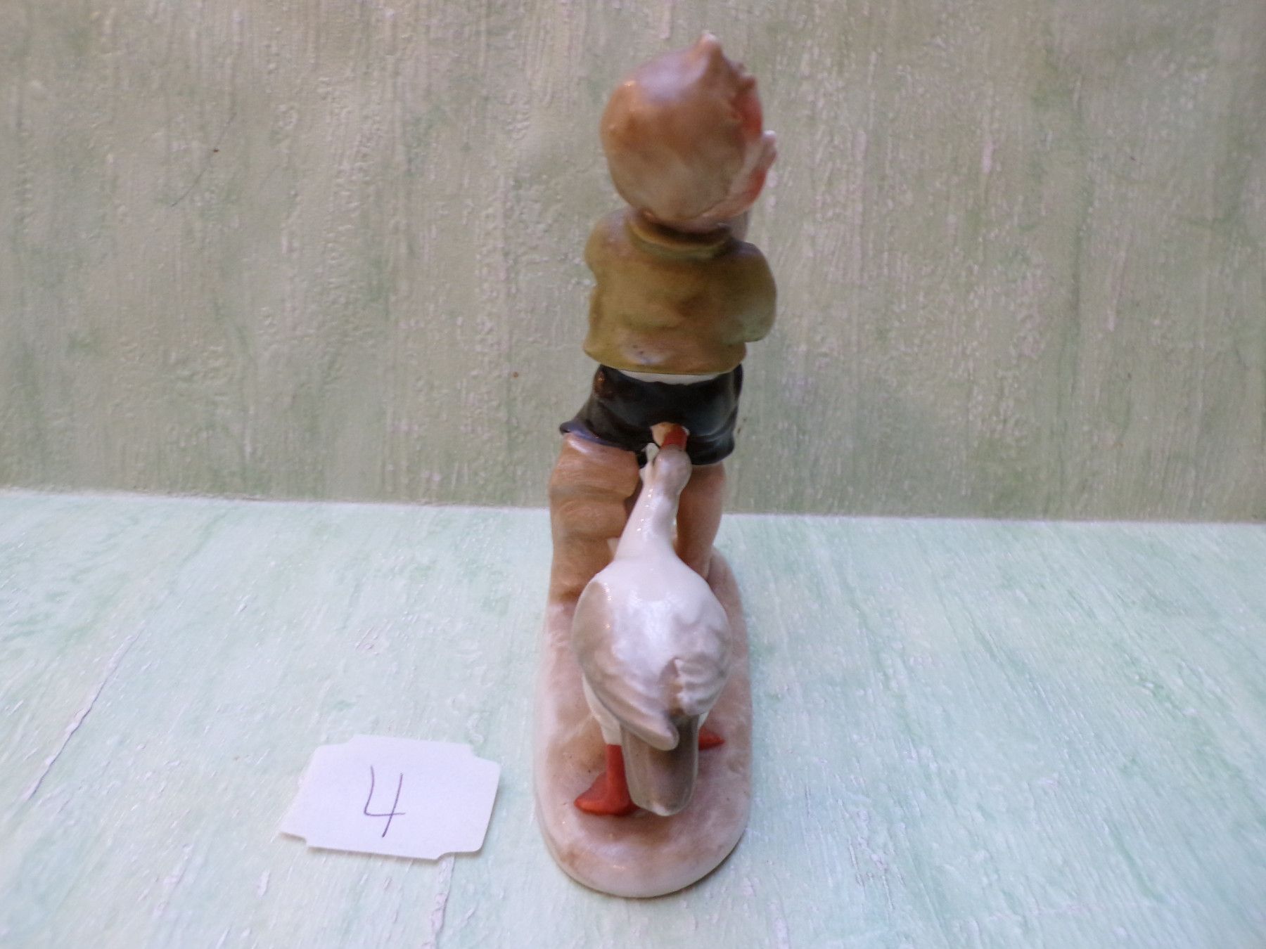 1: blaus Kleid mit Hund 13cm, 2: rotes Kleid mit Hund 12,5cm, 3: Mädel mit Taube 13cm und 4: Junge mit Gans