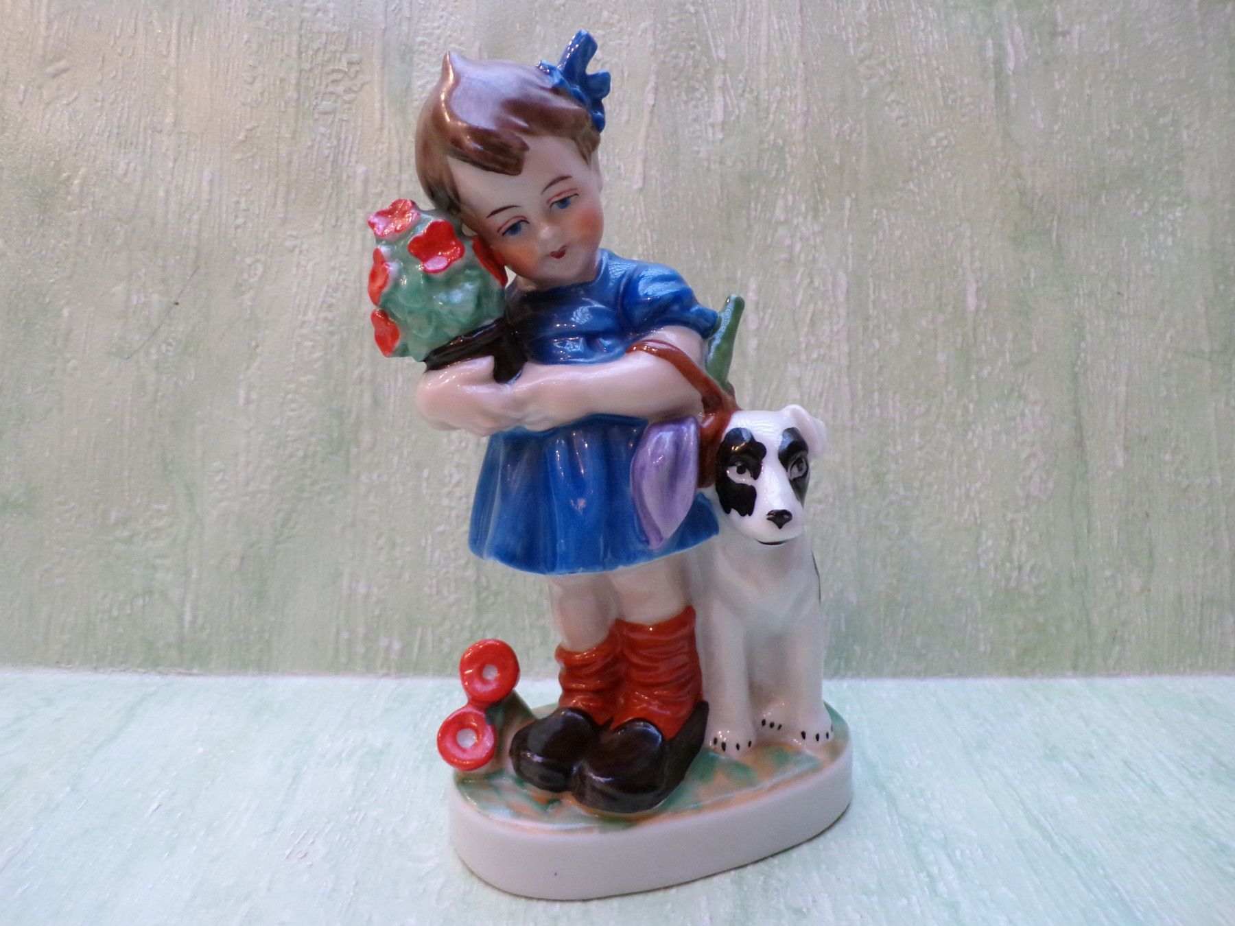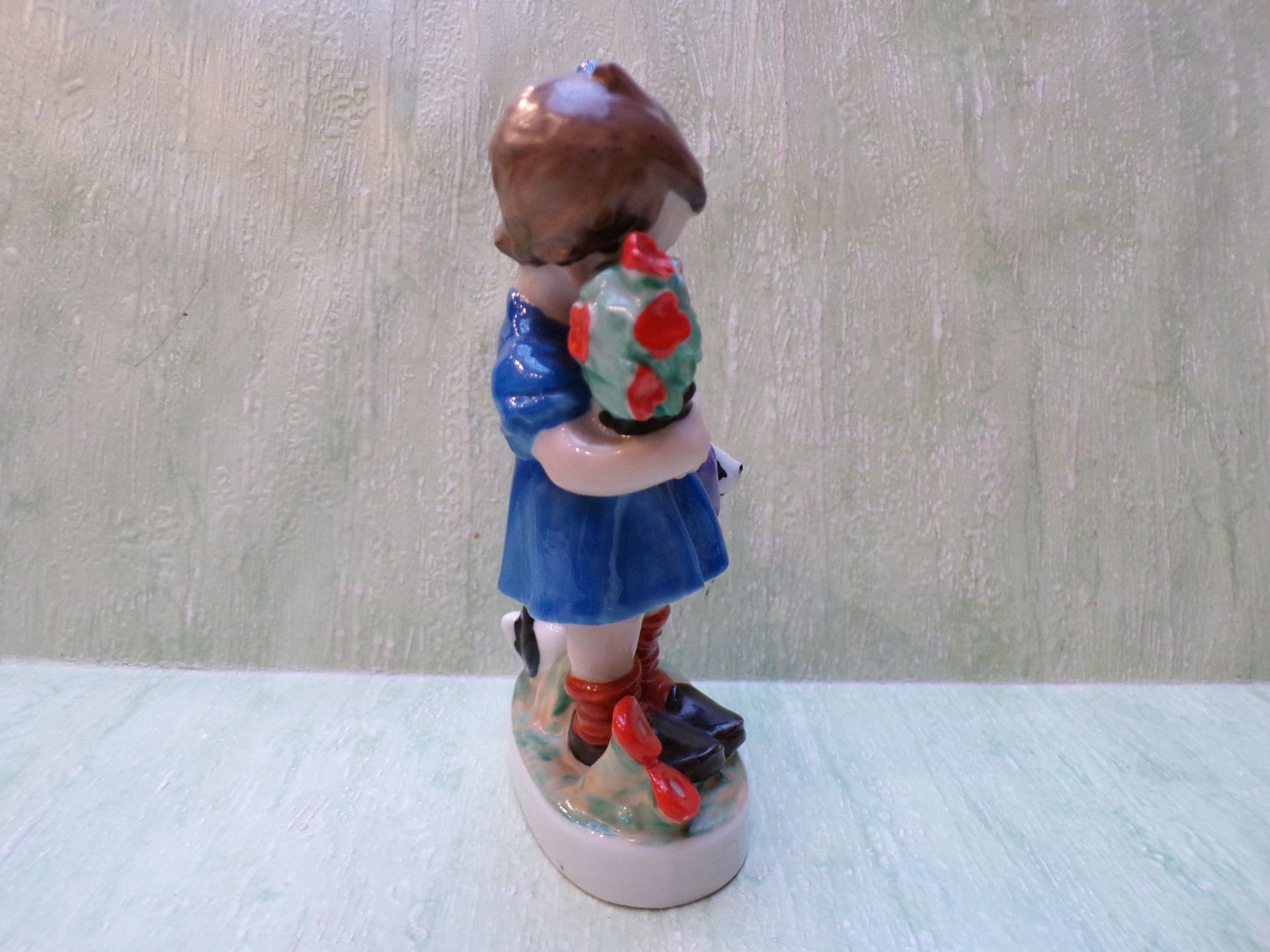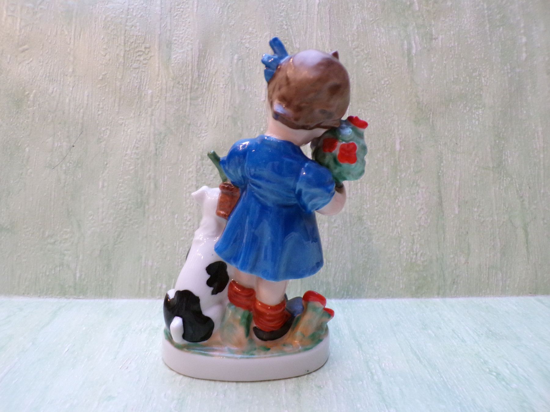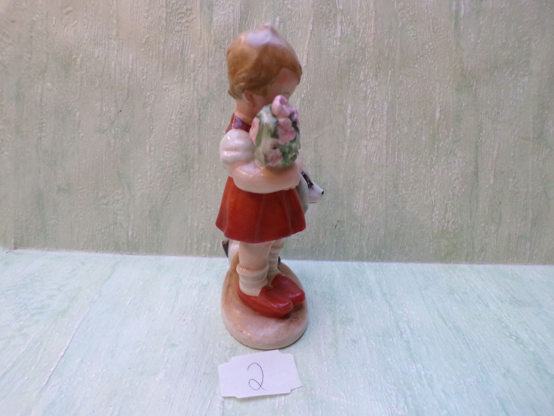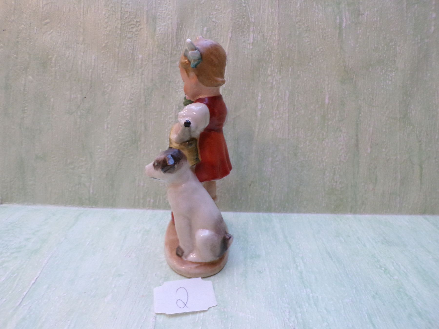 1: blaus Kleid mit Hund 13cm, 2: rotes Kleid mit Hund 12,5cm, 3: Mädel mit Taube 13cm und 4: Junge mit Gans