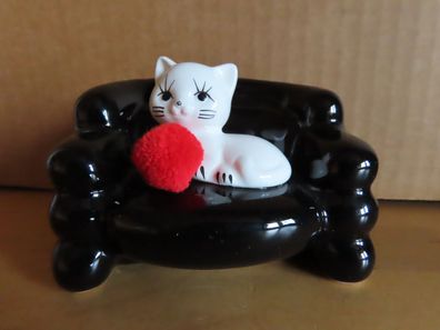 • Figur Katze weiße Katze auf schwarzem Sessel mit rotem Knäul