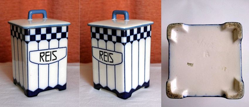 Wächtersbach Keramik alte Jugendstil Vorratsdose Reis mit Deckel Die Dose hat eine Höhe von 15 cm und eine Größe von 10 x 10 cm am äußeren Rand gemessen. Das blaue Würfel- und Streifenmuster befindet sich unter der Glasur und setzt sich auch auf der Rückseite fort. Der Schriftzug REIS befindet sich