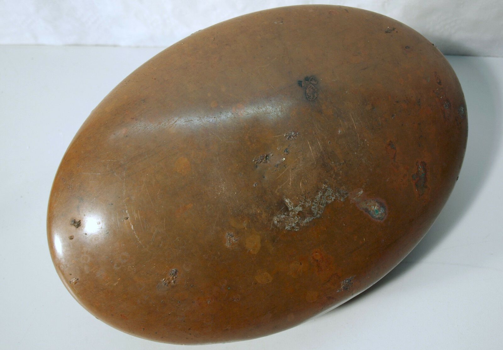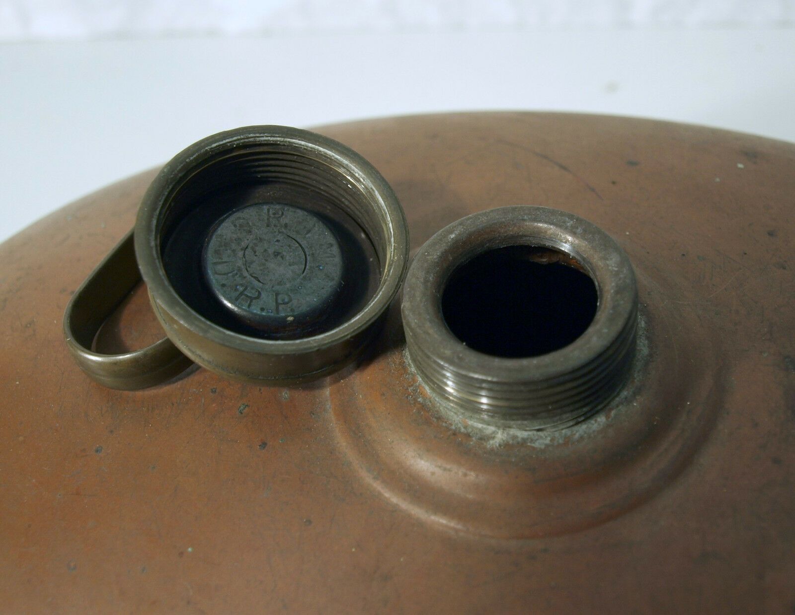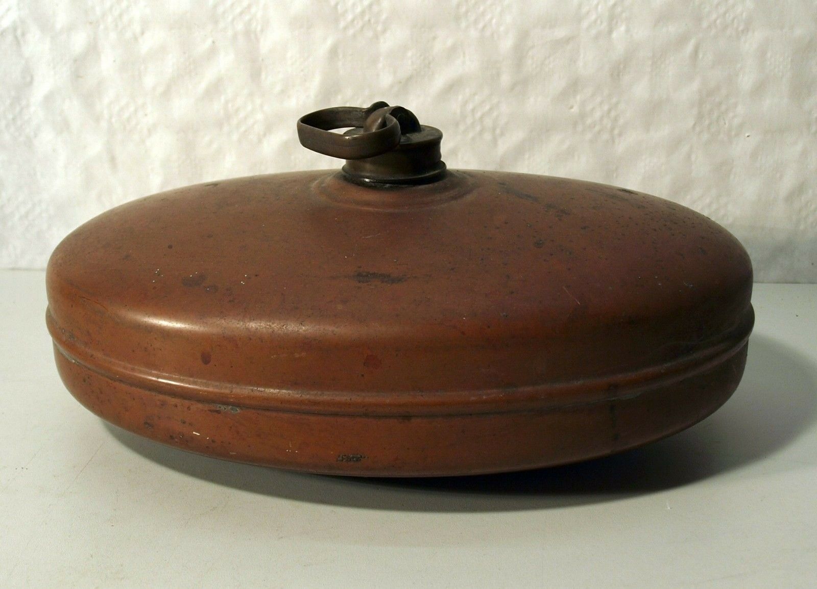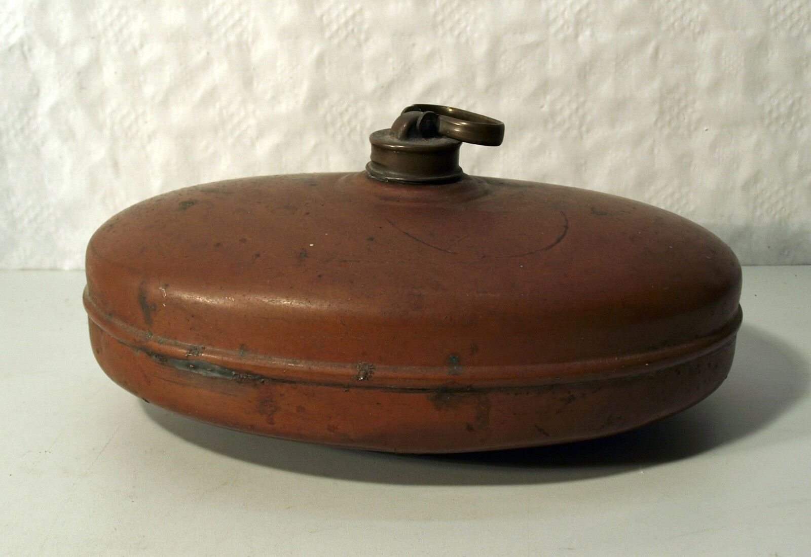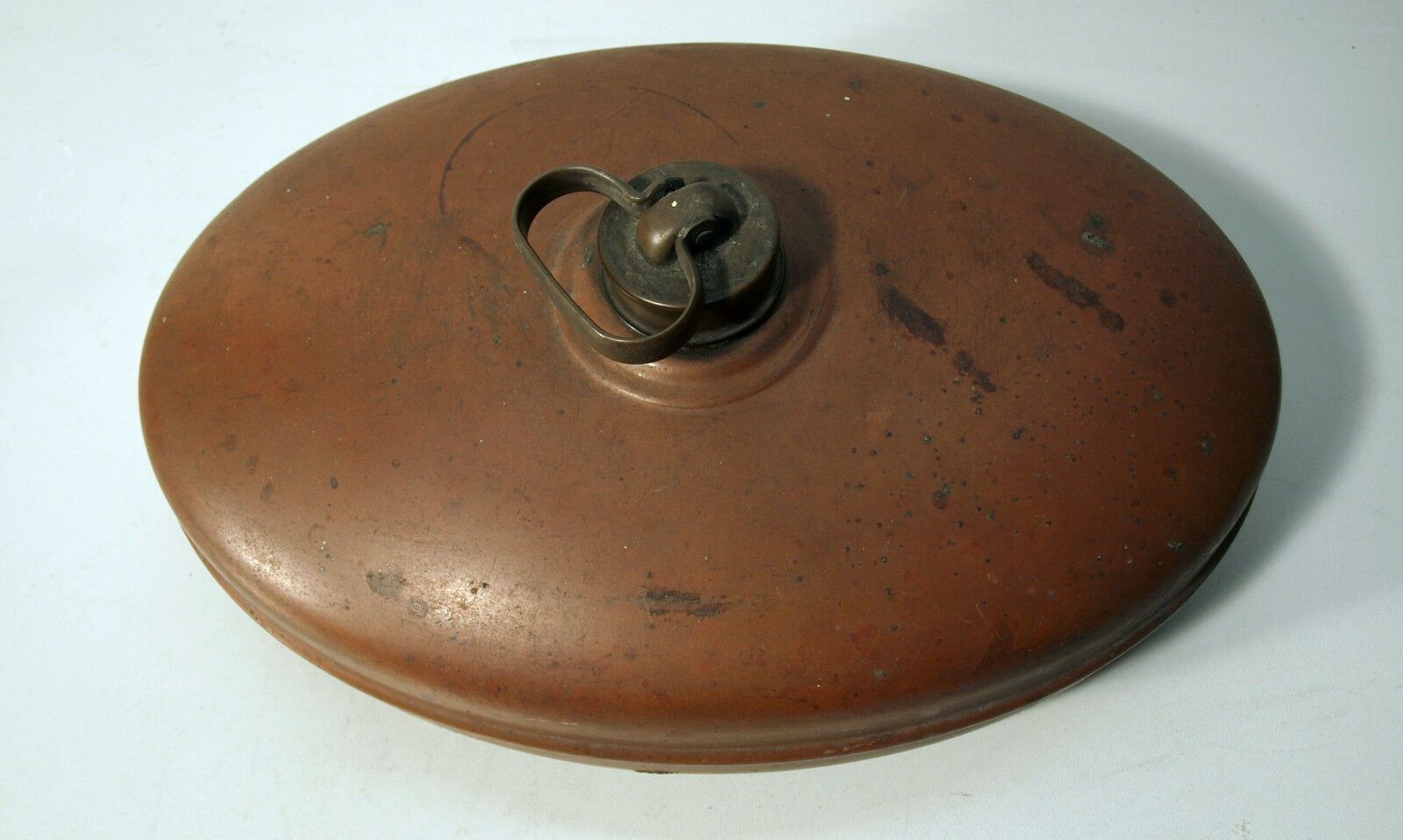 Wärmflasche um 1900. Ohne Marke. Material: Kupfer mit Messing-Drehverschluss. Ungeputzt. Nur sehr wenige kleine Beulen. Maße: H 14, L 29, B 20 cm. Antikes am Deich - Inh: Oliver Kipp-Trense G M T Sprache erkennen Afrikaans Albanisch Arabisch Armenisch Aserbaidschanisch Baskisch Bengalisch Bosnisch B