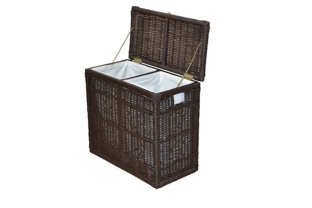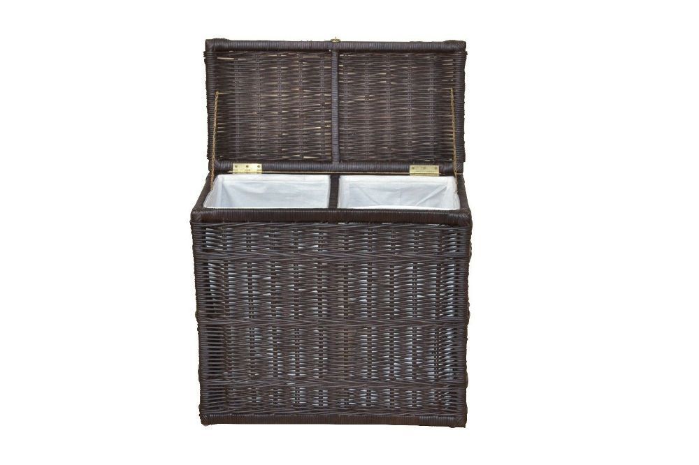 Wäschesammler PRAKTISCHER WÄSCHESAMMLER MIT 2 KAMMERN. GESTELL AUS MASSIVHOLZ PINIE, MIT RATTAN HANDGEFLOCHTEN. RECHTS LINKS MIT PRAKTISCHER GRIFFMUSCHEL. UNTER DEM AUFKLAPPBAREM DECKEL SIND 2 KAMMERN FÜR SCHMUTZWÄSCHE. INNEN JEWEILS MIT EINEM HERAUSNEHMBAREM STOFFEINSATZ AUSGESTATTET. STOFFEINSATZ
