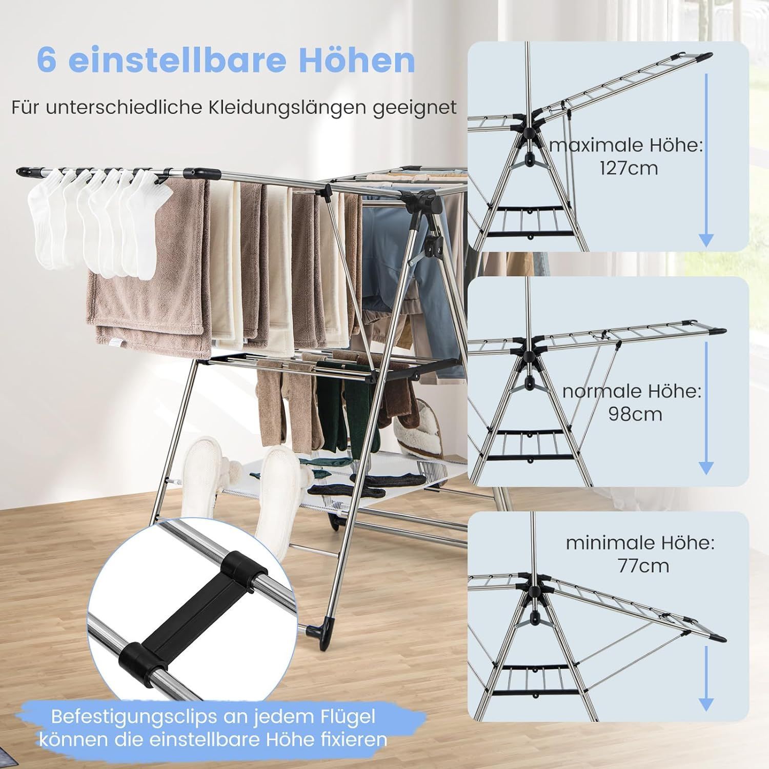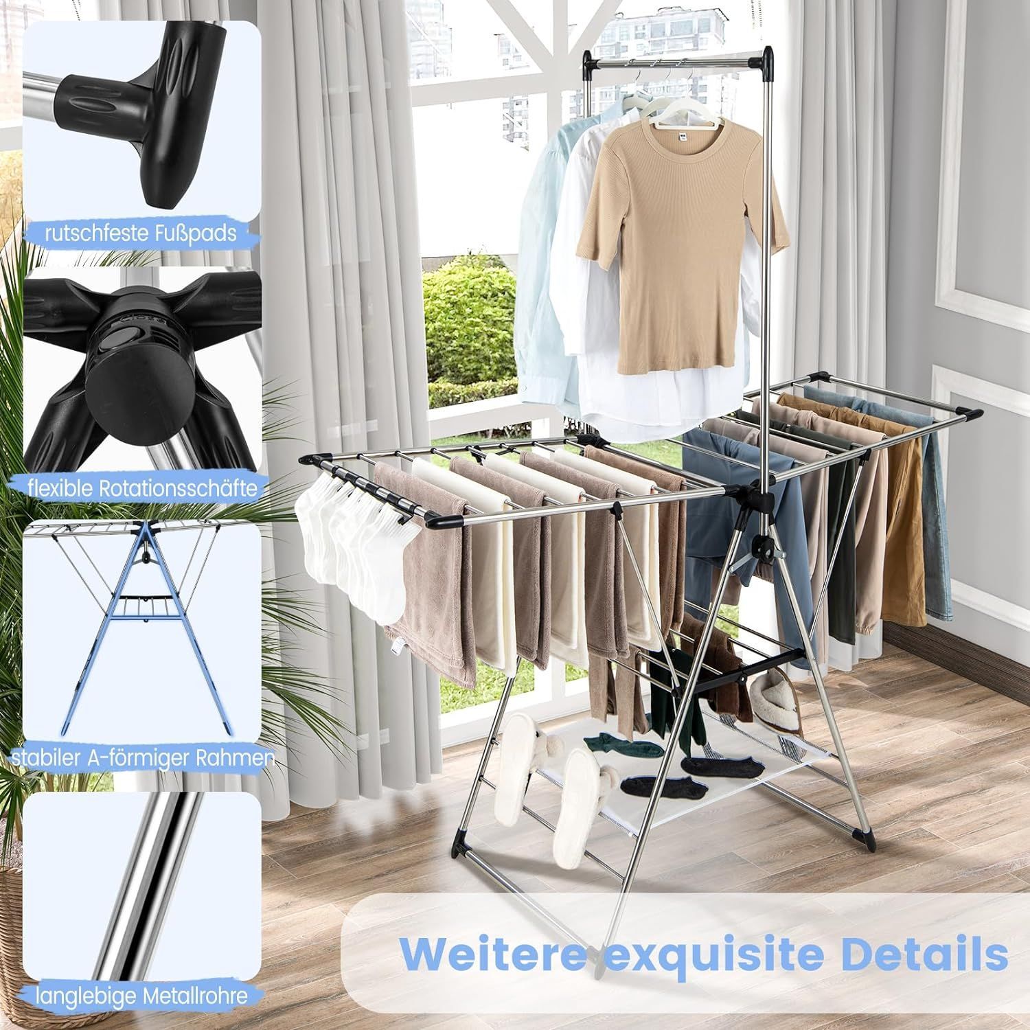 Wäscheständer klappbar, Standtrockner höhenverstellbar mit Flügeln & Schuhablage