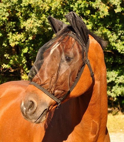 WALDHAUSEN Fliegenmaske Basic, mit Ohrenschutz WA 6319 Leichte Fliegenmaske mit Elastikeinfassung zum Schutz der empfindlichen Pferdeaugen und Ohren vor lästigen Insekten. Feines, festes Netzgewebe schützt sicher vor kleinen Insekten und bietet eine optimale Augenfreiheit. Kehlriemen und Nasenriemen