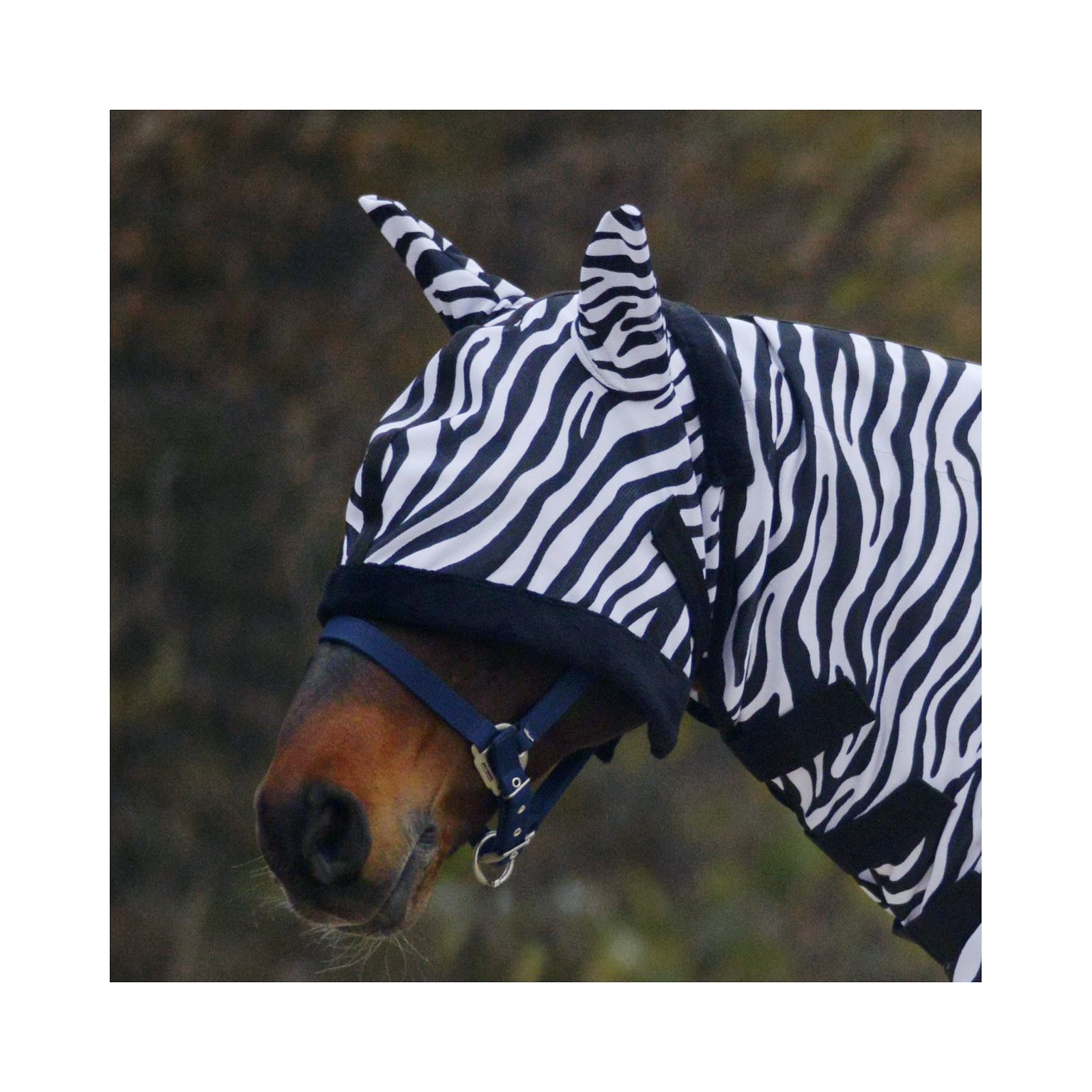 WALDHAUSEN Fliegenmaske Zebra WA 63130 Hochwertige Fliegenmaske aus feinmaschigem Gewebe. Der schwarz weiß Farbeffekt wirkt abweisend auf Insekten und schützt so das Pferd effektiver als herkömmliche Masken. Weich gepolstert im Genick- und Nasenbereich. Material: 100% Polyester