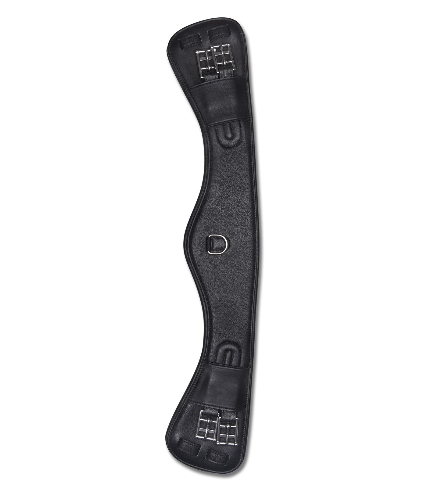 Gebogener Gurt für eine bessere Gurtlage bei bauchigen Pferden und wenn der Sattel dazu neigt nach vorne zu rutschen. Aus hochwertigem Leder gefertigt mit sehr weicher Polsterung. Mit D-Ring und Rollschnallen aus Edelstahl. Elastik an beiden Seiten.