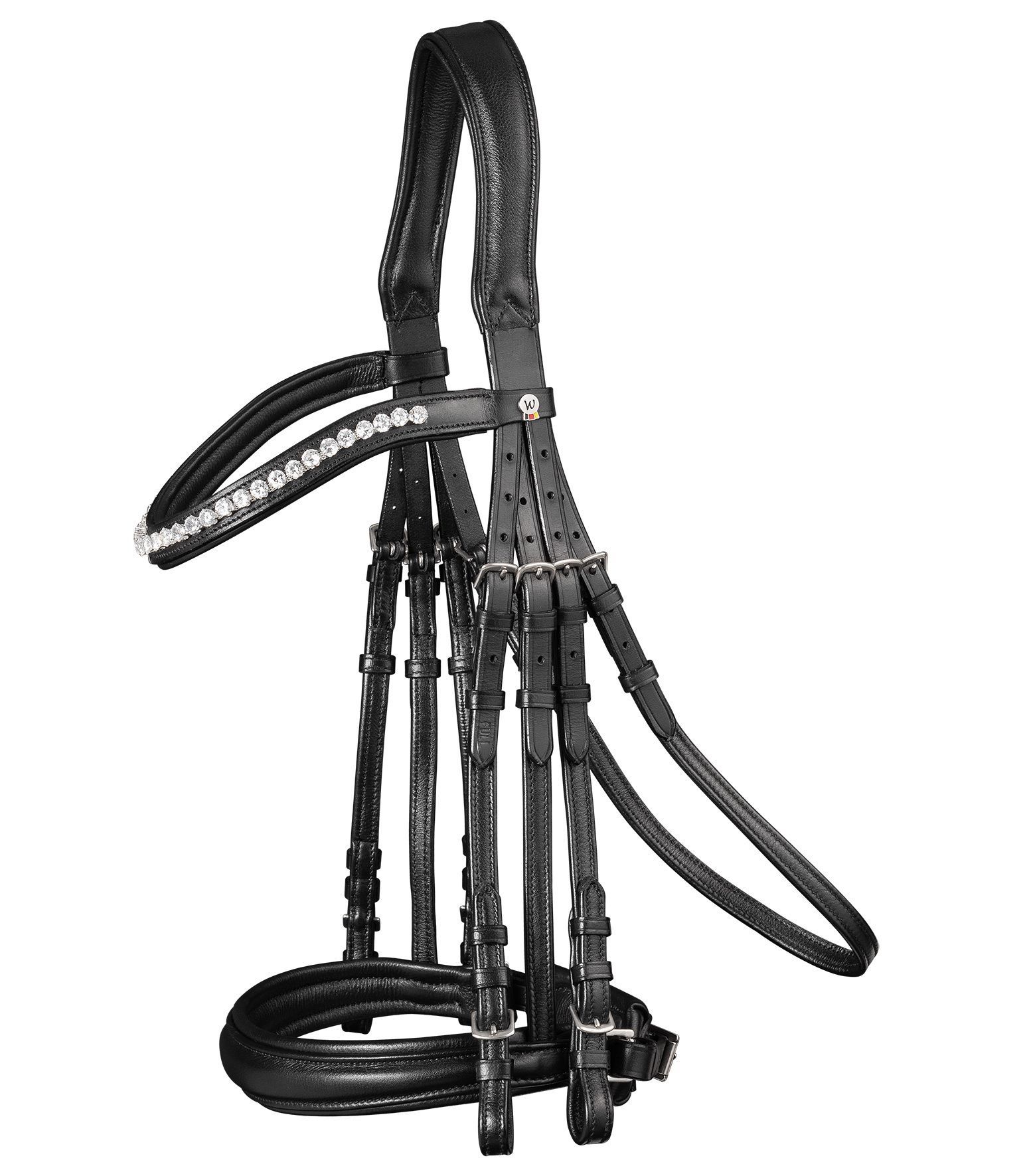 WALDHAUSEN X-Line Kandarenzaum SUPERSOFT WA 95773 - Schwedisches Reithalfter - Extrem weiches Leder - Anatomisch geformtes Genickstück - Geschwungenes Stirnband mit großen, klaren Strasssteinen - Nasenriemen, Stirnband und Genickstück weich unterlegt - Edelstahlbeschläge - Leder Kandarenzügel 12 mm,