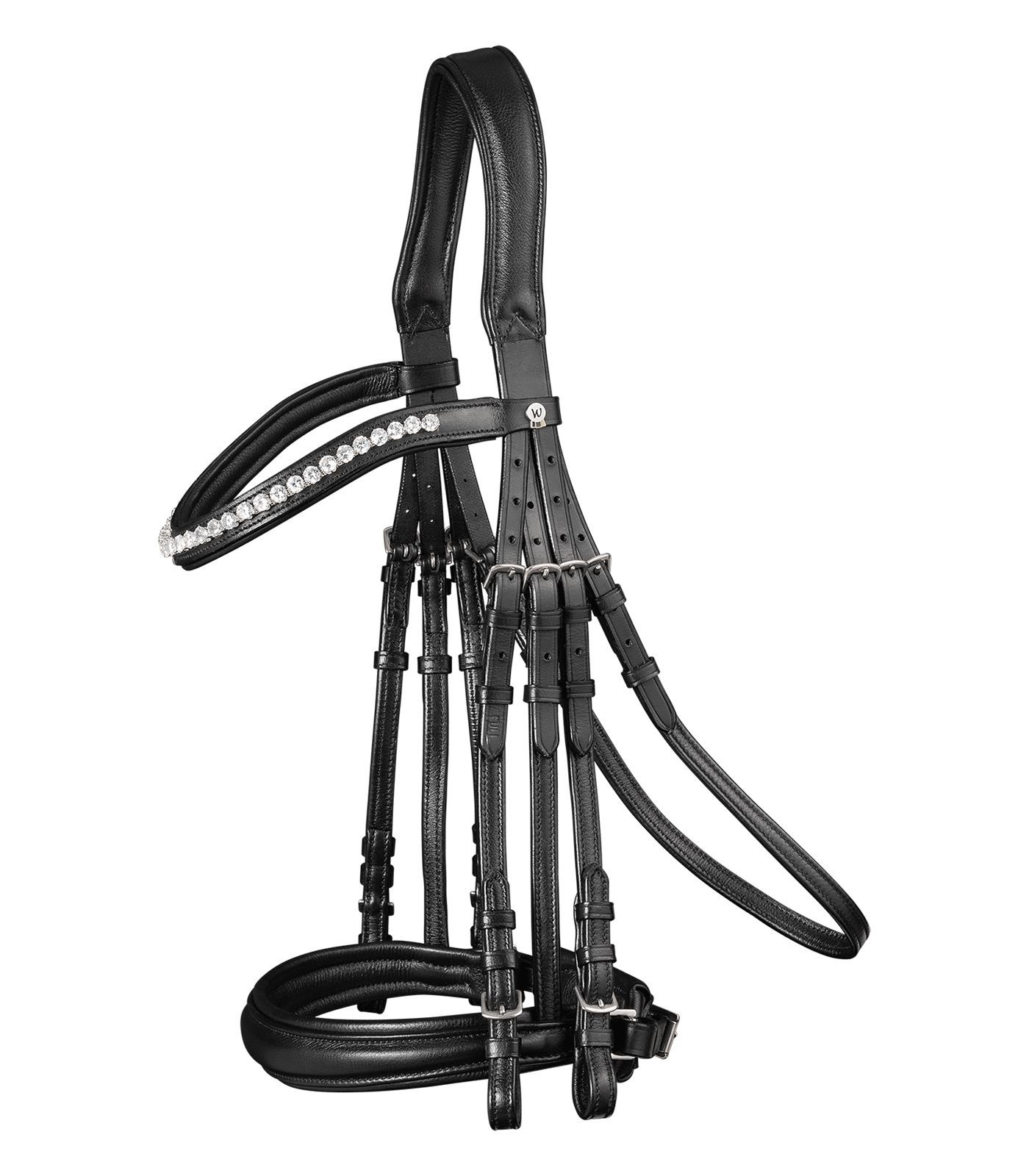 - Schwedisches Reithalfter - Extrem weiches Leder - Anatomisch geformtes Genickstück - Geschwungenes Stirnband mit großen, klaren Strasssteinen - Nasenriemen, Stirnband und Genickstück weich unterlegt - Edelstahlbeschläge - Leder Kandarenzügel 12 mm, Trensengurtzügel 16 mm Hochwertig und edel - die