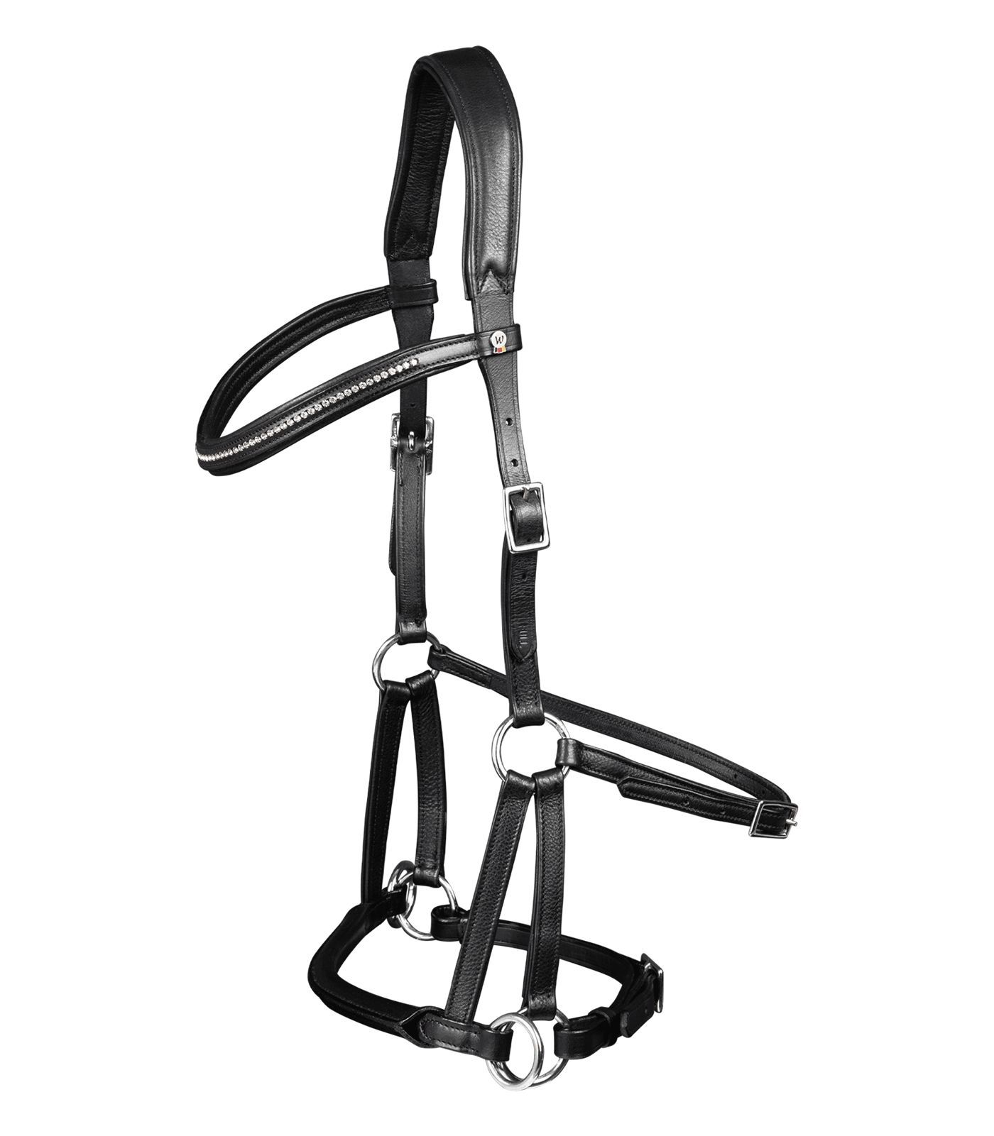- Gebissloser Zaum mit versteiftem Nasenband - Die willkommene Abwechslung zum Trensenzaum für gut ausgebildete Pferde - Anatomisch geformtes Genickstück - Geschwungenes Stirnband mit Strasskette - Genickstück und Stirnband weich unterlegt - Edelstahlbeschäge - Lieferung inkl. Zügel Hochwertig und e