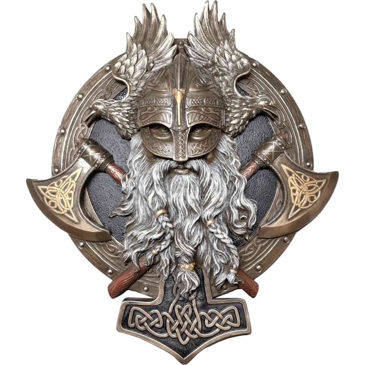 Walhalla" Wandschild Wikingerkopf mit 2 Äxten, bronze/ coloriert