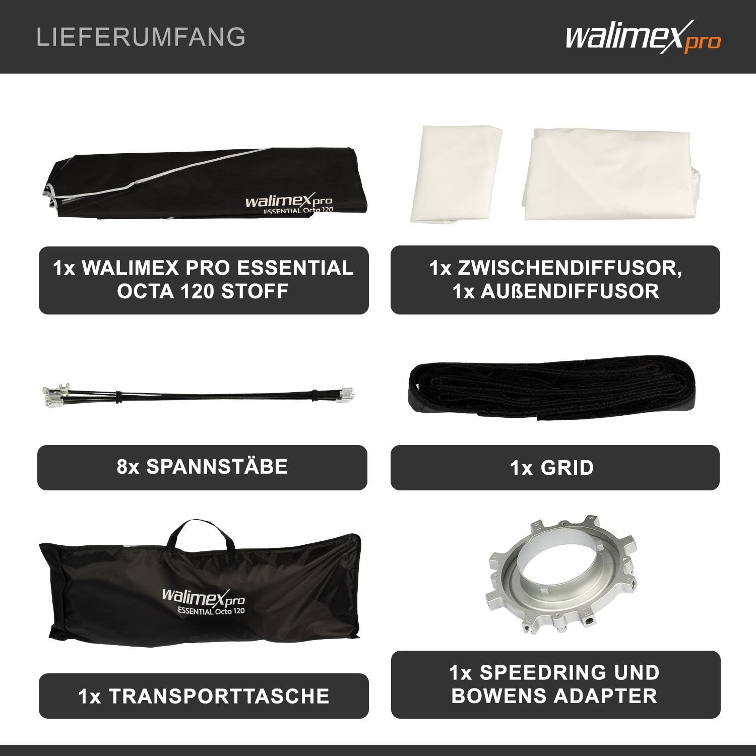 Walimex pro Essential Softbox Octagon 120cm 360° einfacher Aufbau Grid Bowens